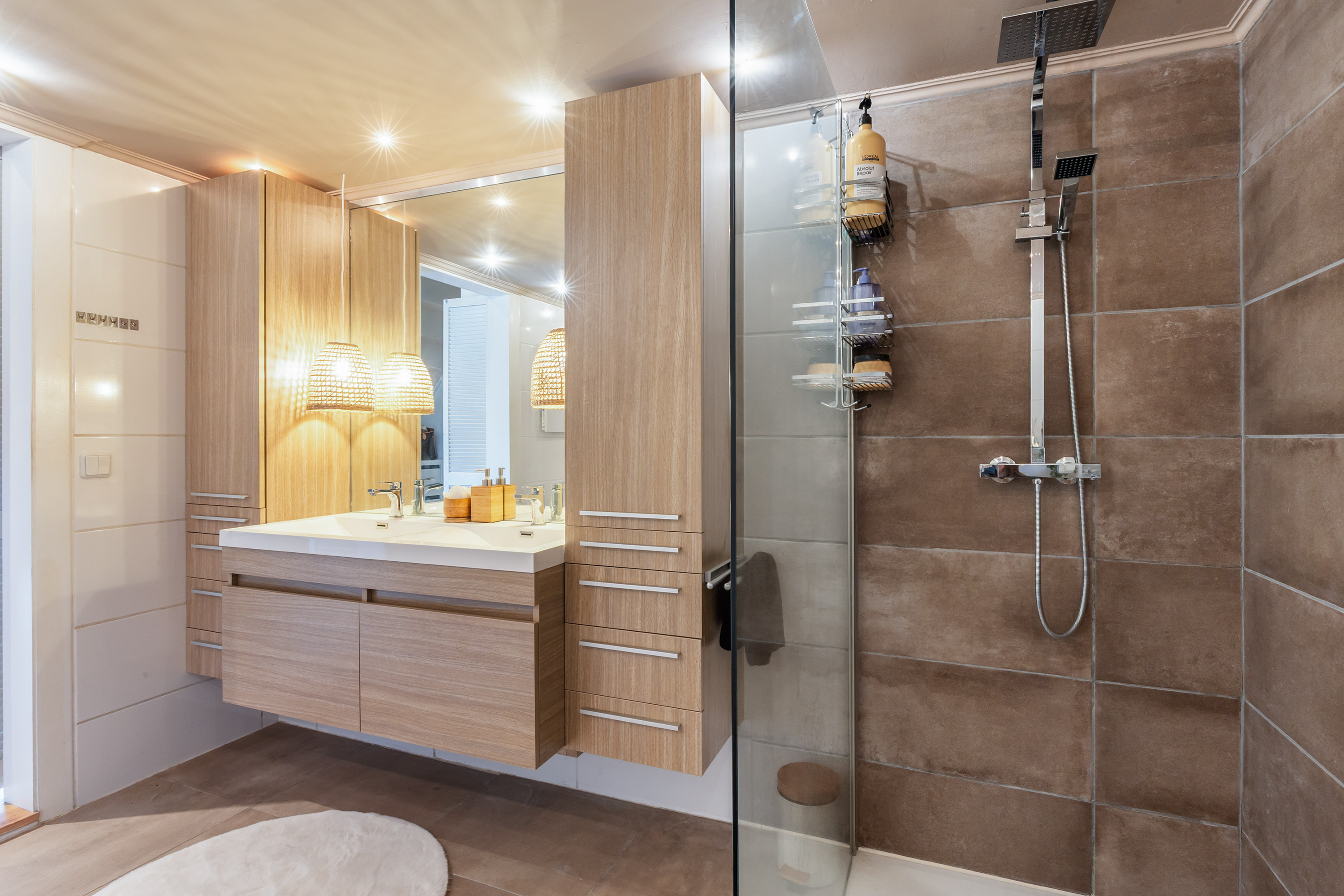 Adjacent is the modern bathroom featuring a sunken bathtub, a spacious walk-in shower, a wall-mounted toilet and double washbasins. The walls are fully tiled and the room has a warm, contemporary finish.