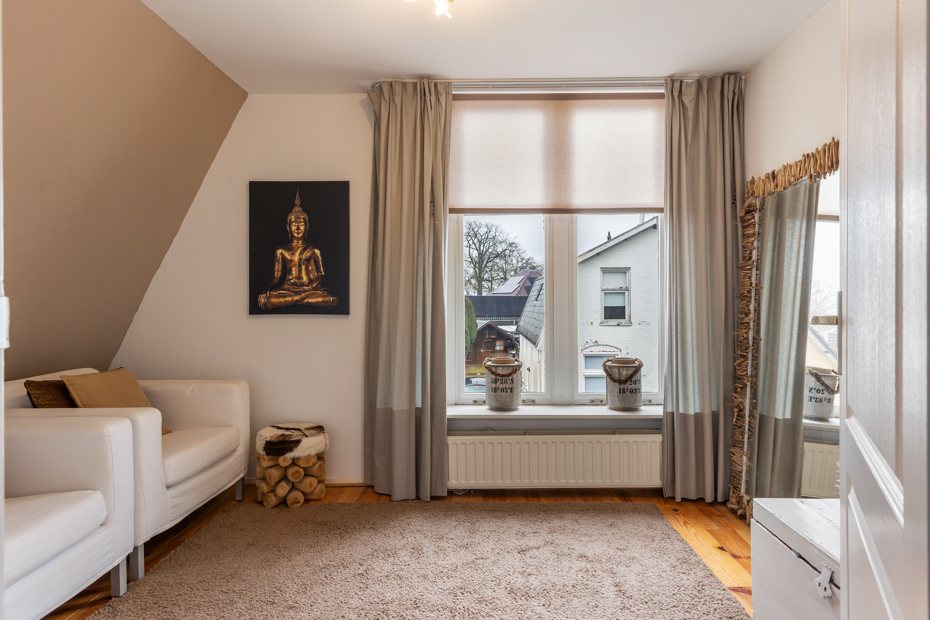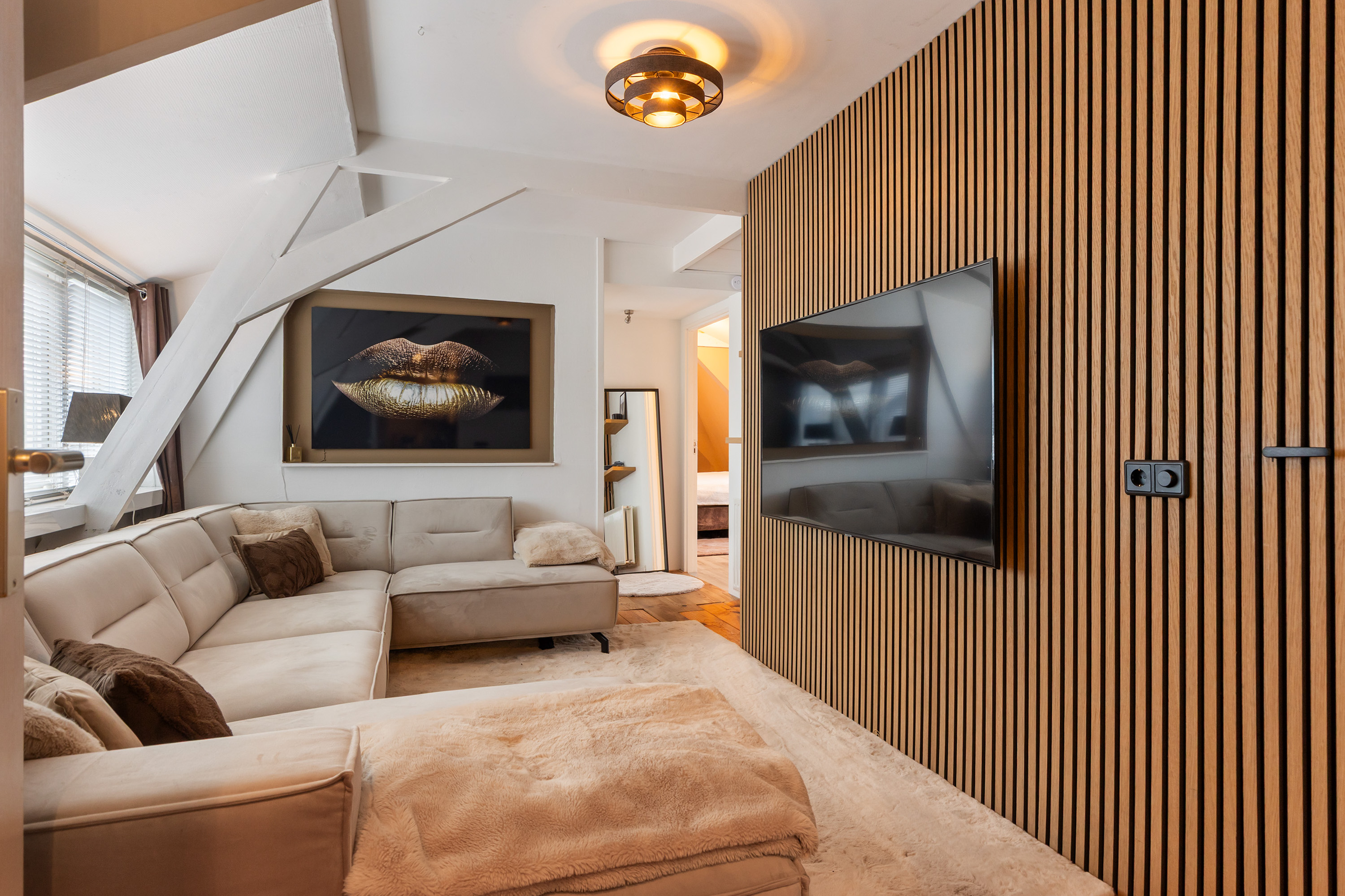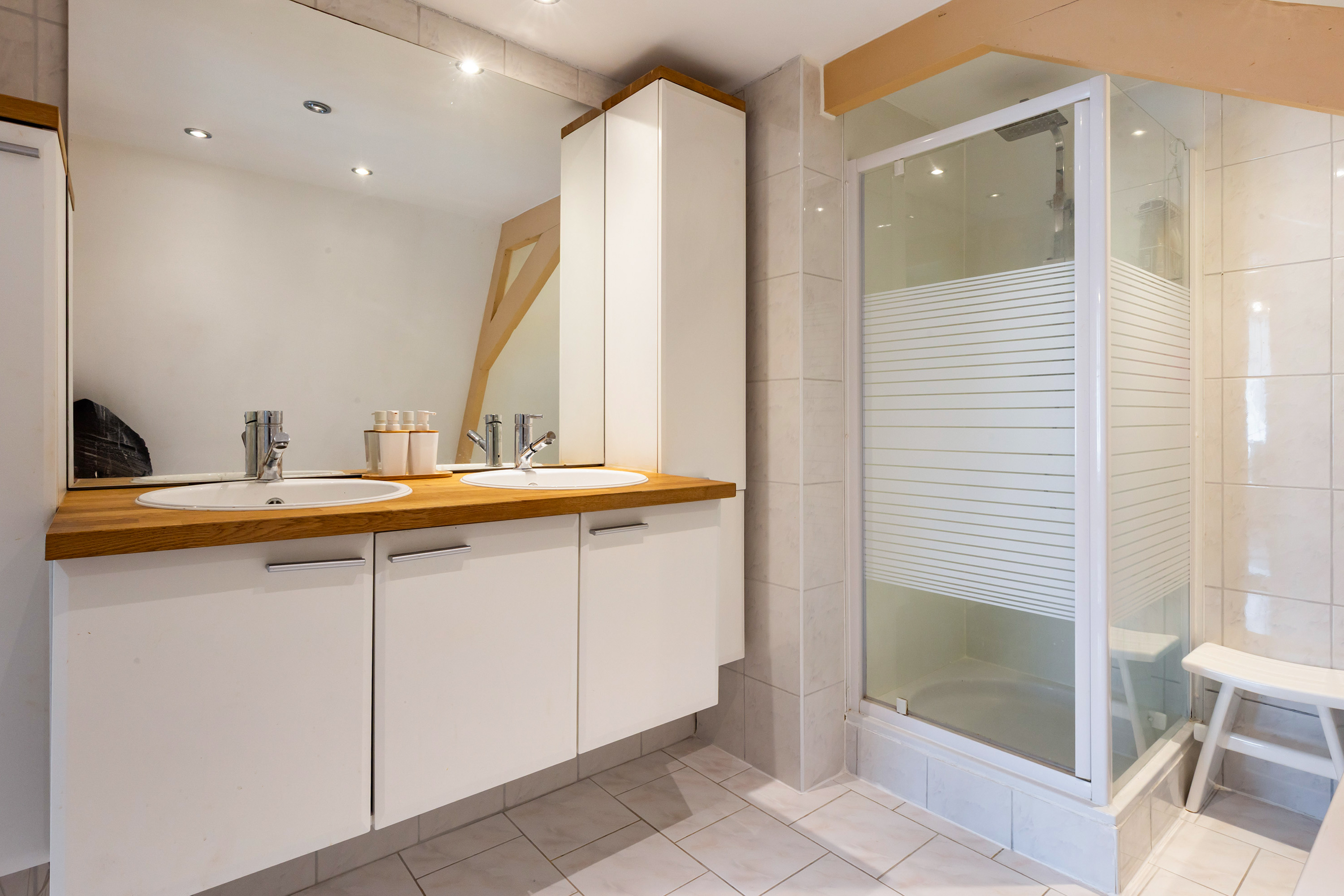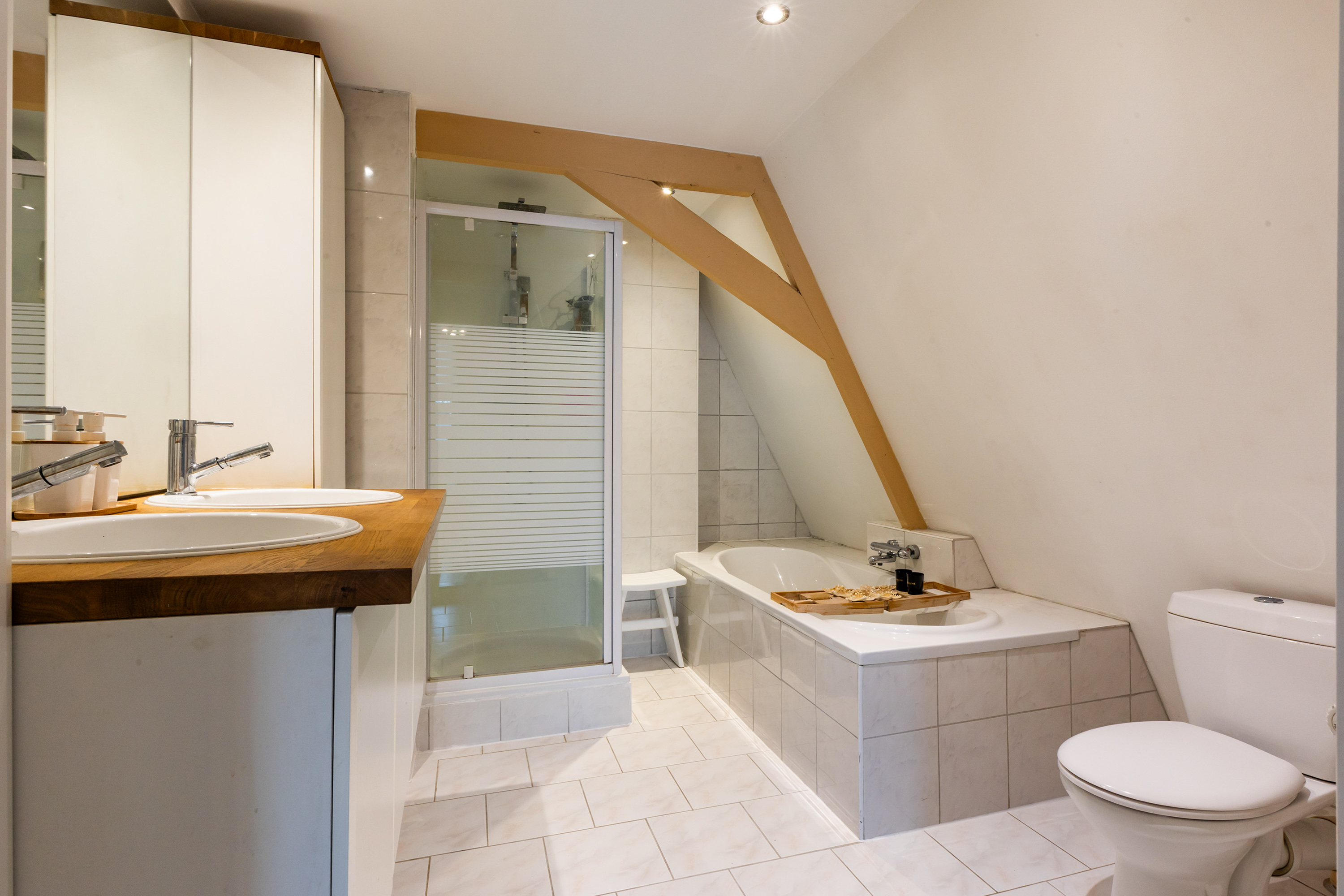 Throughout this level the original beams, sloping ceilings, wide dormer windows and wooden floors have been preserved, giving the spaces a warm and authentic character.