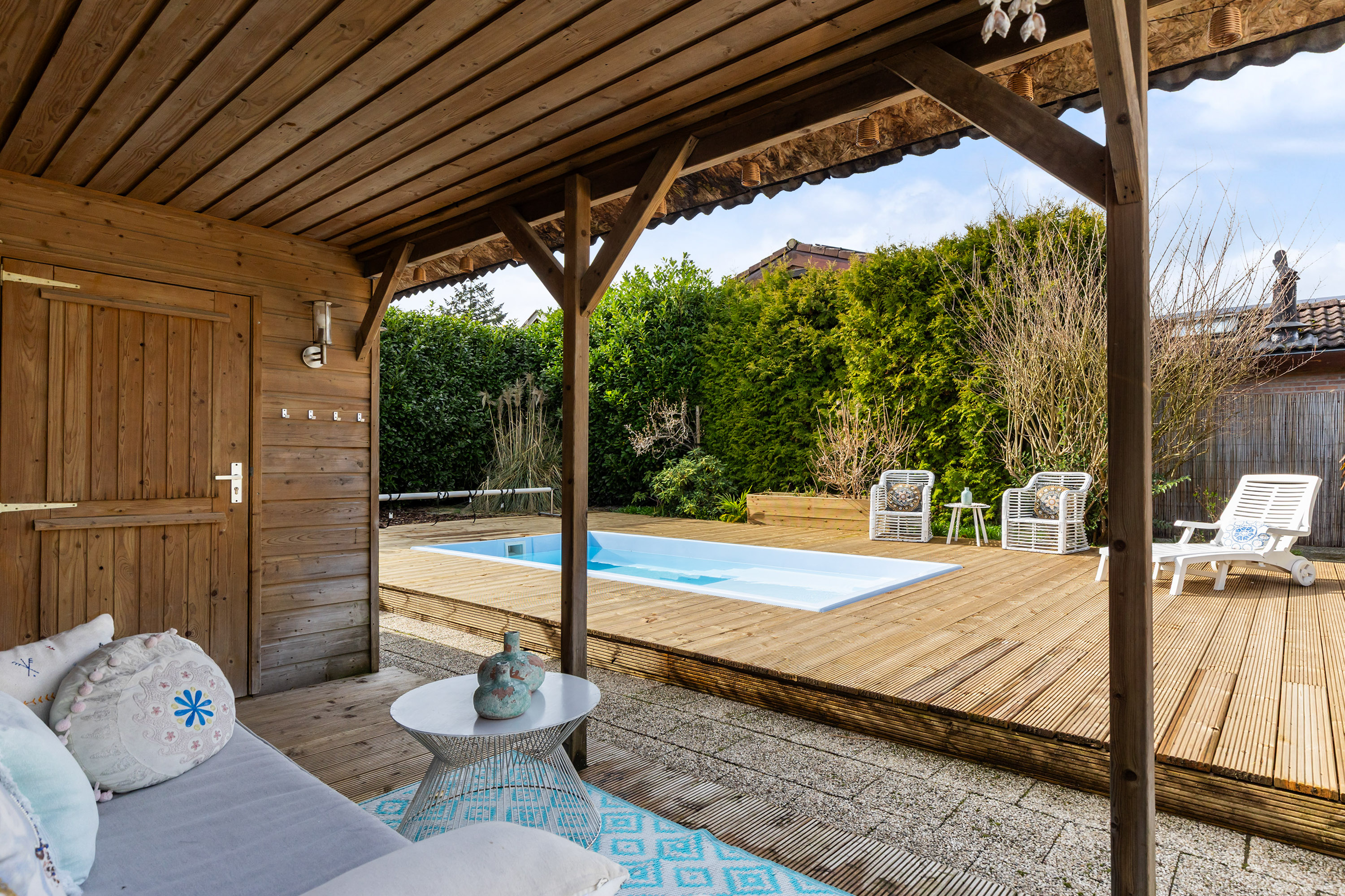 The garden features a swimming pool constructed in 2025 measuring approximately 5 x 8 metres with a depth of 1.20 metres. The polyester pool includes a comfortable shallow sun deck and lighting in various colours. A roll-cover ensures the pool can be safely closed. Surrounding the pool is a wooden deck terrace with ample space for sun loungers and outdoor seating.