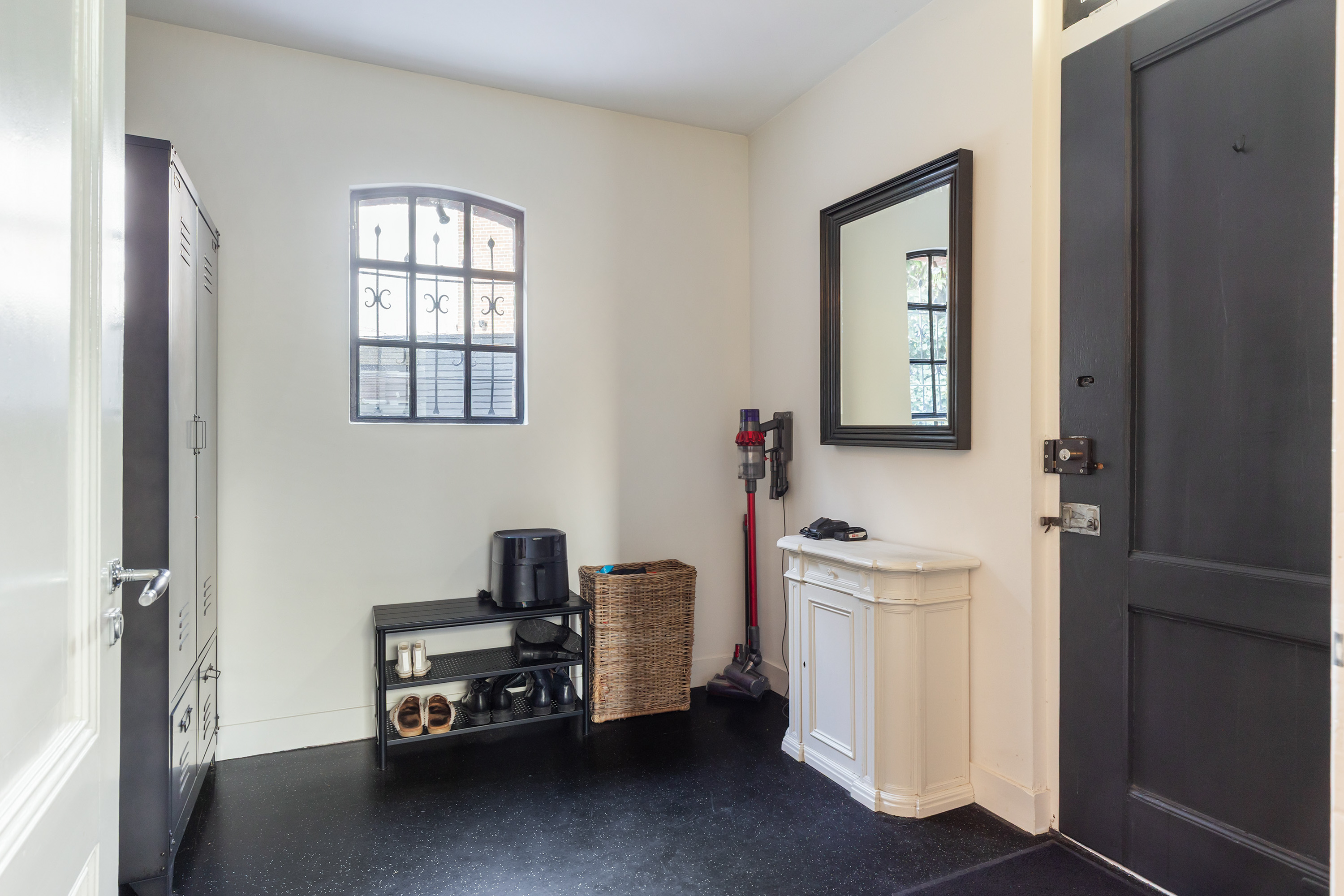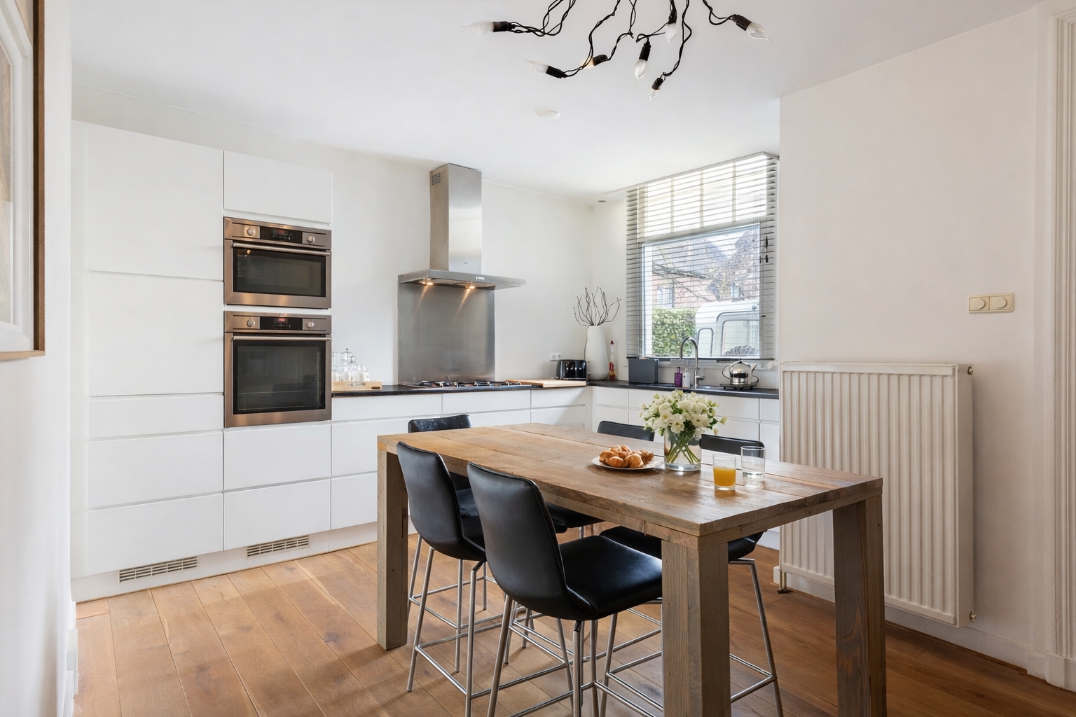 The kitchen forms an inviting central space within the home and is finished with an oak floor. The white KVIK kitchen is arranged in an L-shape and equipped with a range of integrated appliances, including a dishwasher, five-burner gas hob with extractor hood, combination oven with microwave function, separate oven, refrigerator and a freezer with three drawers. From the kitchen, there is access to a spacious utility room with a rear entrance. This practical space offers ample room for storage and coats and features an original window.