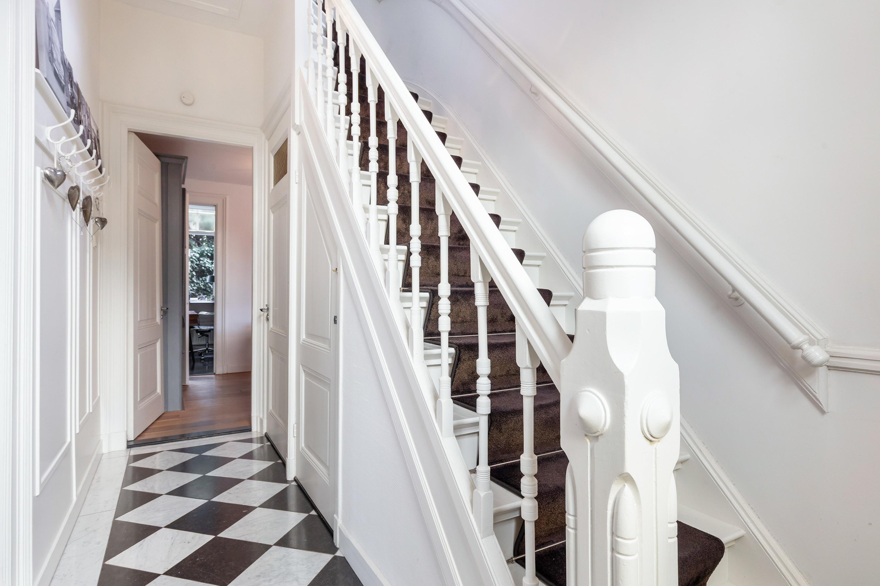 The characterful front door, featuring a small original viewing hatch and authentic glazing, opens into the entrance hall. Immediately noticeable is the distinctive flooring, finished in marble and natural stone in a classic block pattern. The wall panelling and cloak area lend the space a warm and welcoming atmosphere. From the hall, there is access to three reception rooms, the cloakroom and the cellar.