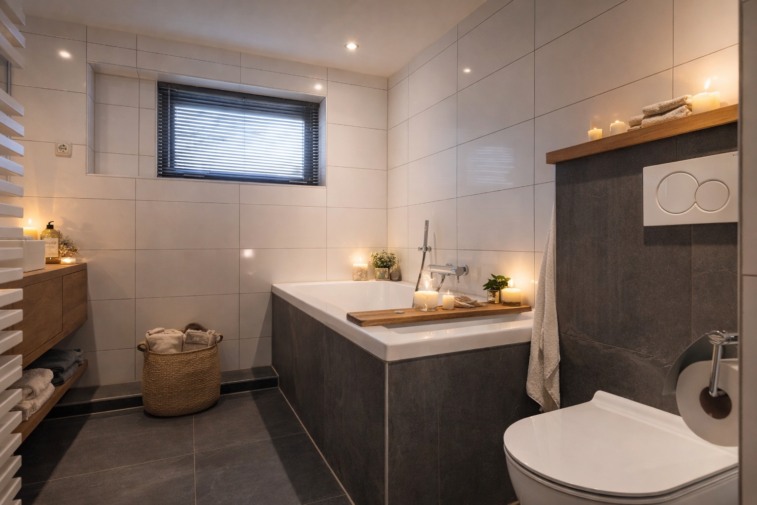 Three steps lead down to the lower section of the extension, where a modern bathroom is located. This bathroom is fitted with a walk-in shower with glass screen and rain shower, a double-ended bath, a wall-mounted WC, a designer radiator and electric underfloor heating. The oak vanity unit with twin basins and mirrored cabinet forms a stylish ensemble. A large window with opening section provides pleasant natural light and ventilation.