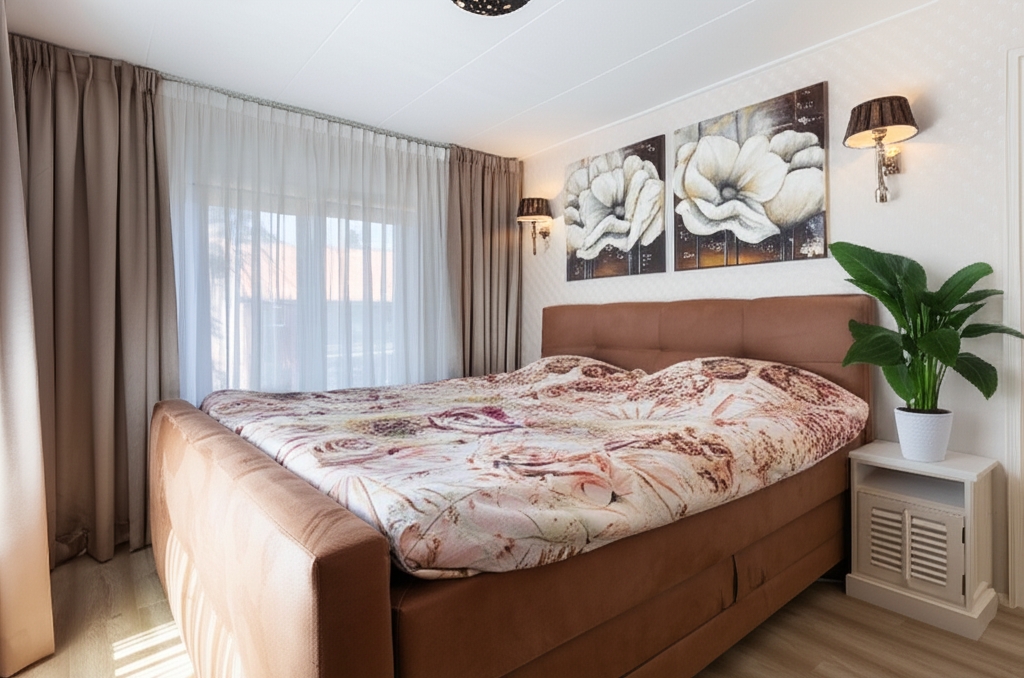 In 2024 is de vloer van de woonkamer vervangen door een Faber gasbetonvloer en voorzien van vloerverwarming, aangesloten op de HR-combiketel. De woonkamer en entree zijn stijlvol afgewerkt met een PVC-vloer in visgraatmotief in de tint white-wash eiken. Wanden en plafonds zijn strak gestuct en voorzien van sierlijsten en ornamenten die de woning extra allure geven.