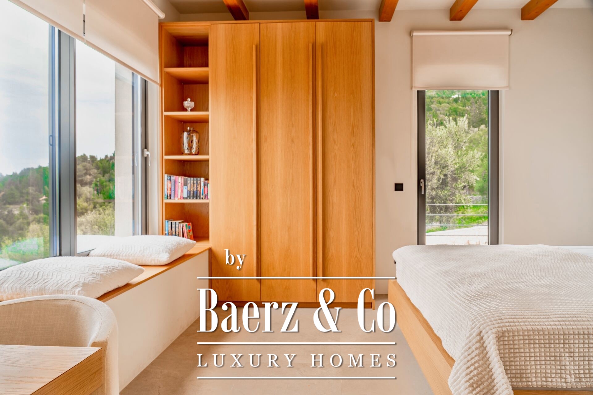 The residence is developed on two levels and includes four master bedrooms, five bathrooms, a spacious living room with a fireplace, and a modern kitchen fully equipped with high-quality electrical appliances. The interior spaces stand out for their brightness, functional layout, and elegant simplicity.