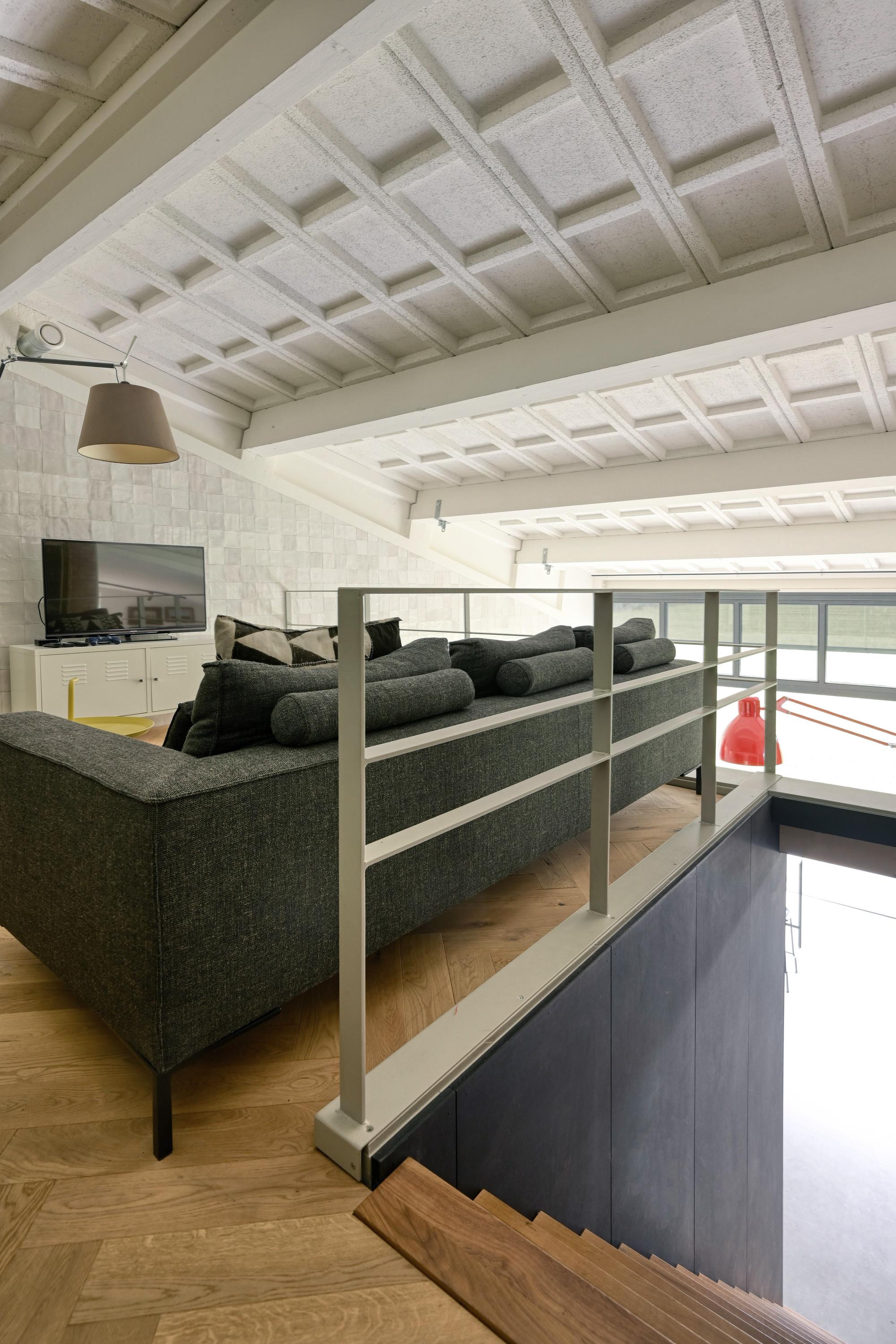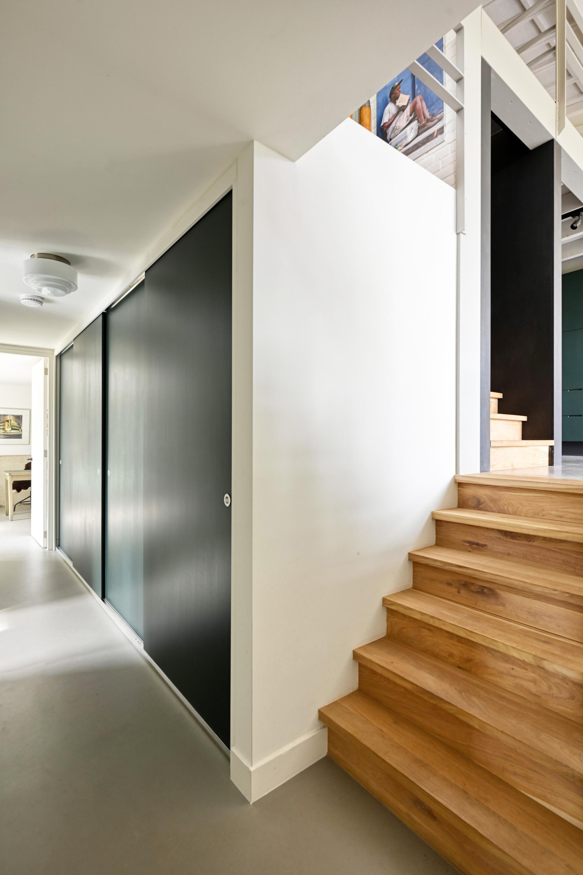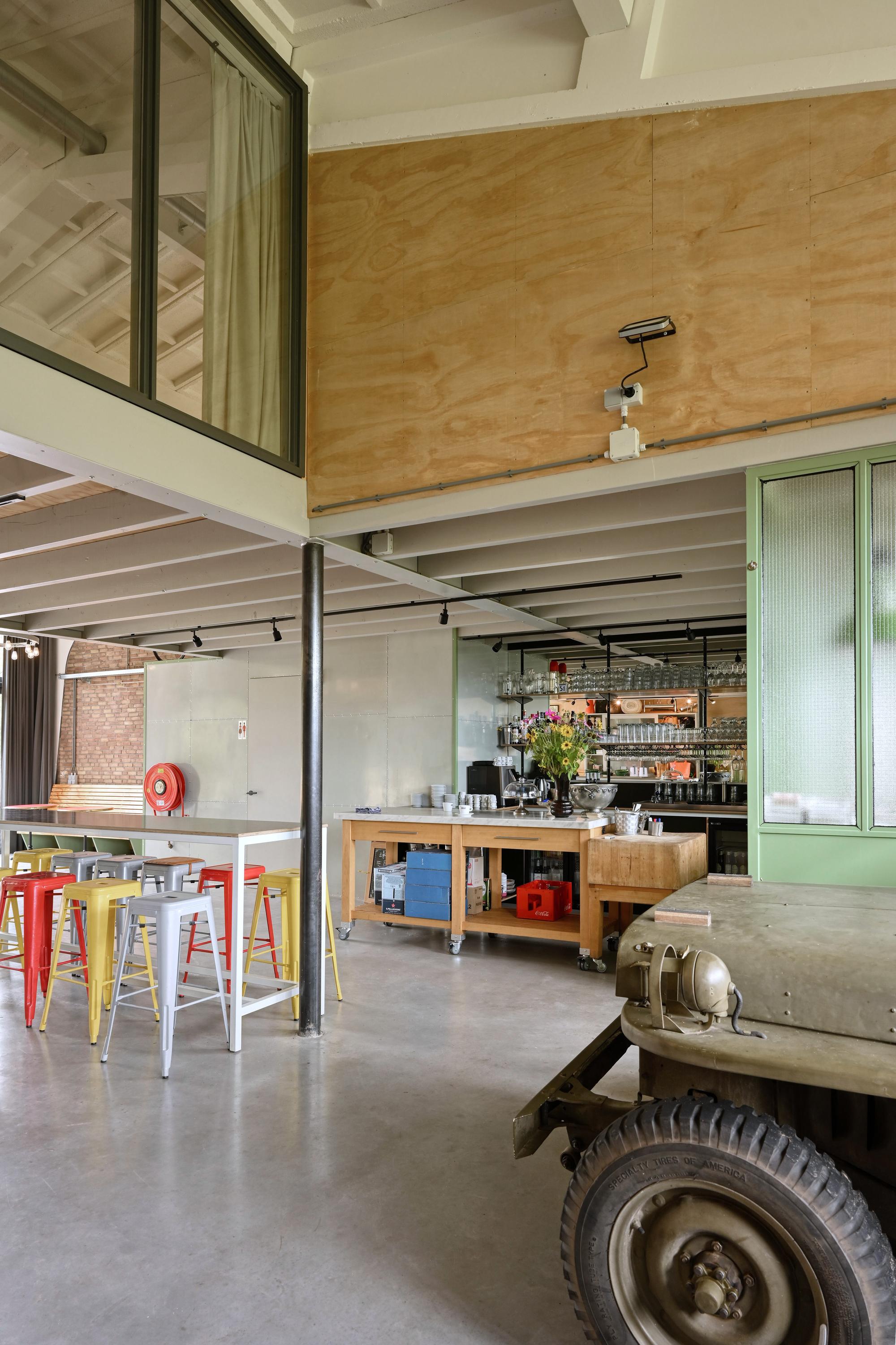 The business zone offers a private entrance and a flexible open layout, including a bar, professional kitchen, and sun-oriented terrace with electrically operated shade. Modern comforts include partial underfloor heating, a heat pump system, extensive solar panels, and full insulation. The unique industrial character is honored with polished concrete floors and original architectural details, setting the stage for future hospitality, creative, or entrepreneurial concepts as allowed by current zoning.