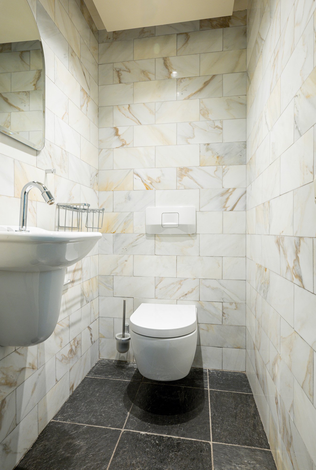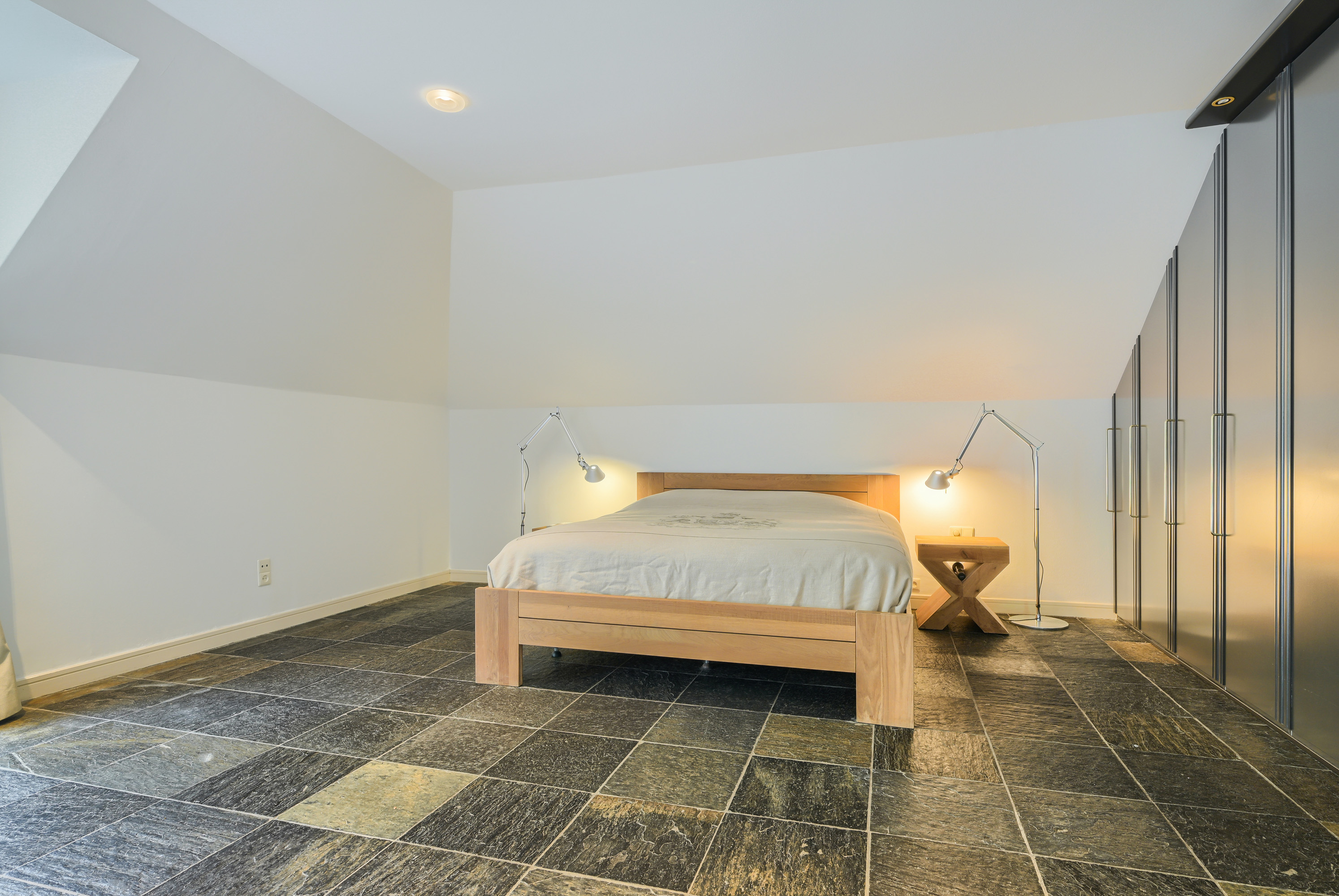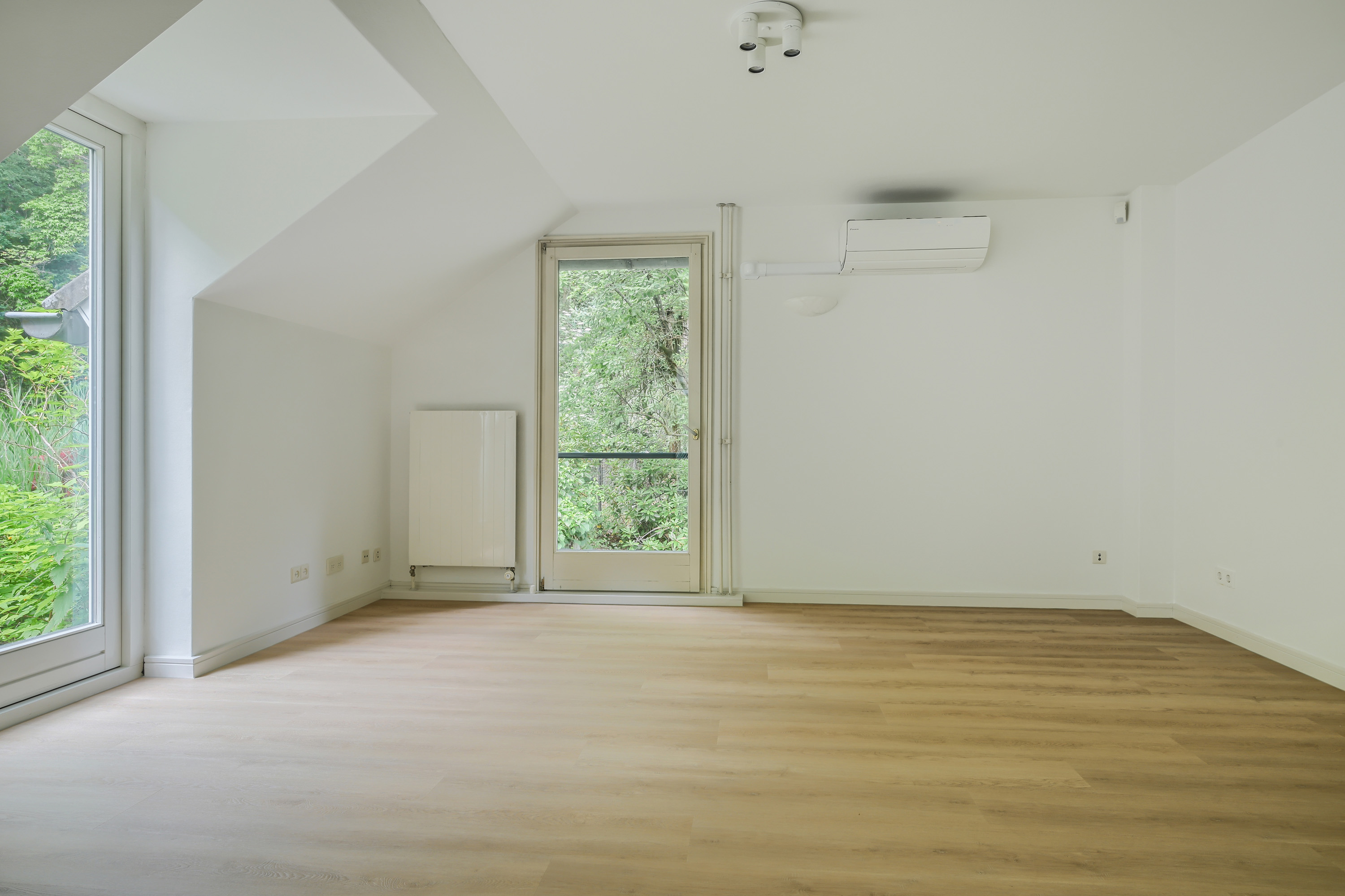 Five flexible bedrooms allow for individual privacy and adaptation, with dedicated spaces easily reimagined for study, studio, or guest purposes. The primary suite opens directly onto a balcony, while the lower level provides additional living or working areas. Bathrooms are finished with contemporary fittings, walk-in showers, and designer radiators to maintain quiet comfort.