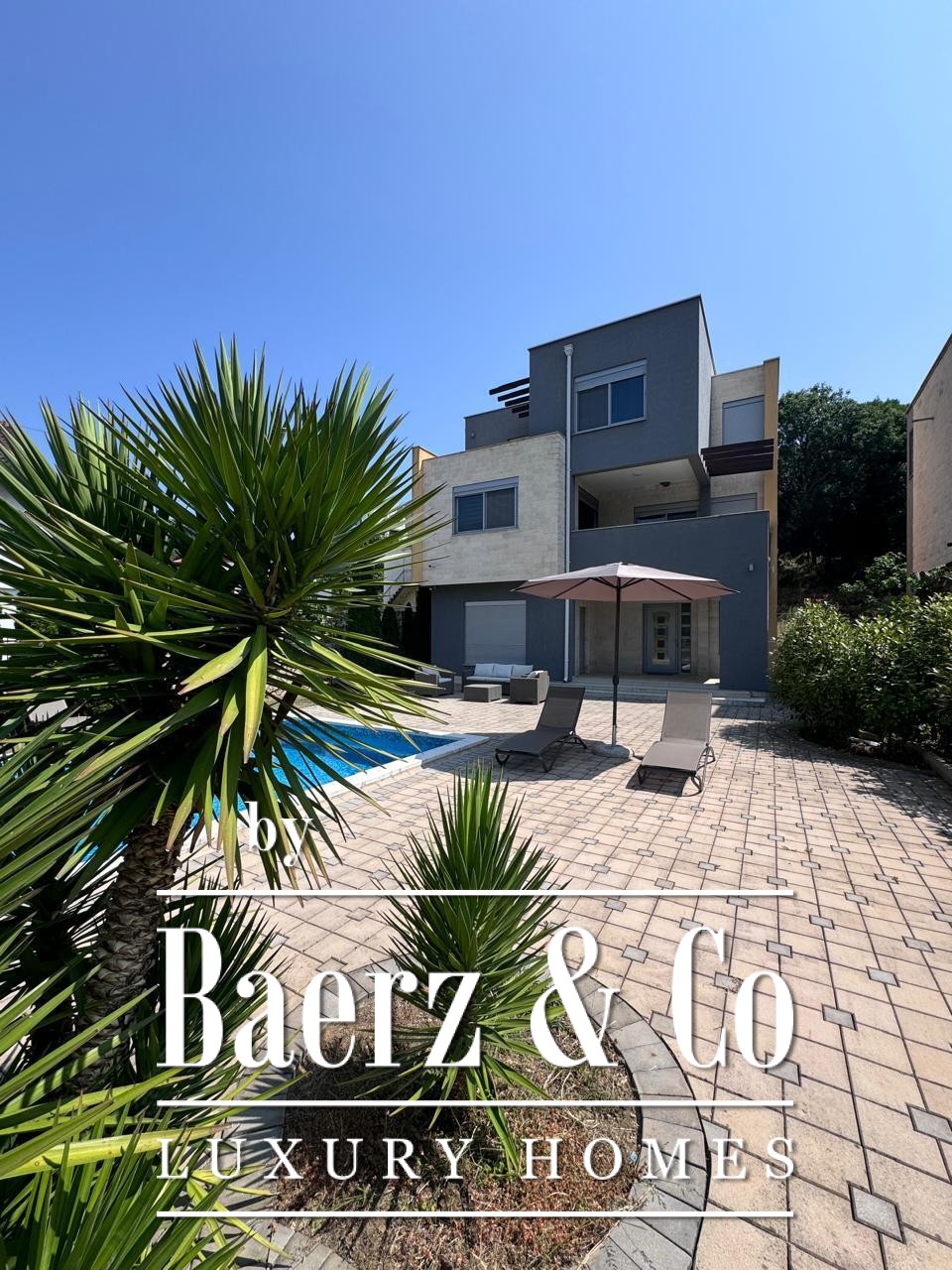 The villa has 3 levels. There is a pool in front of the villa. There are 2 parking spots that can be turned into a garage. The villa is connected by an asphalt road to the main road.