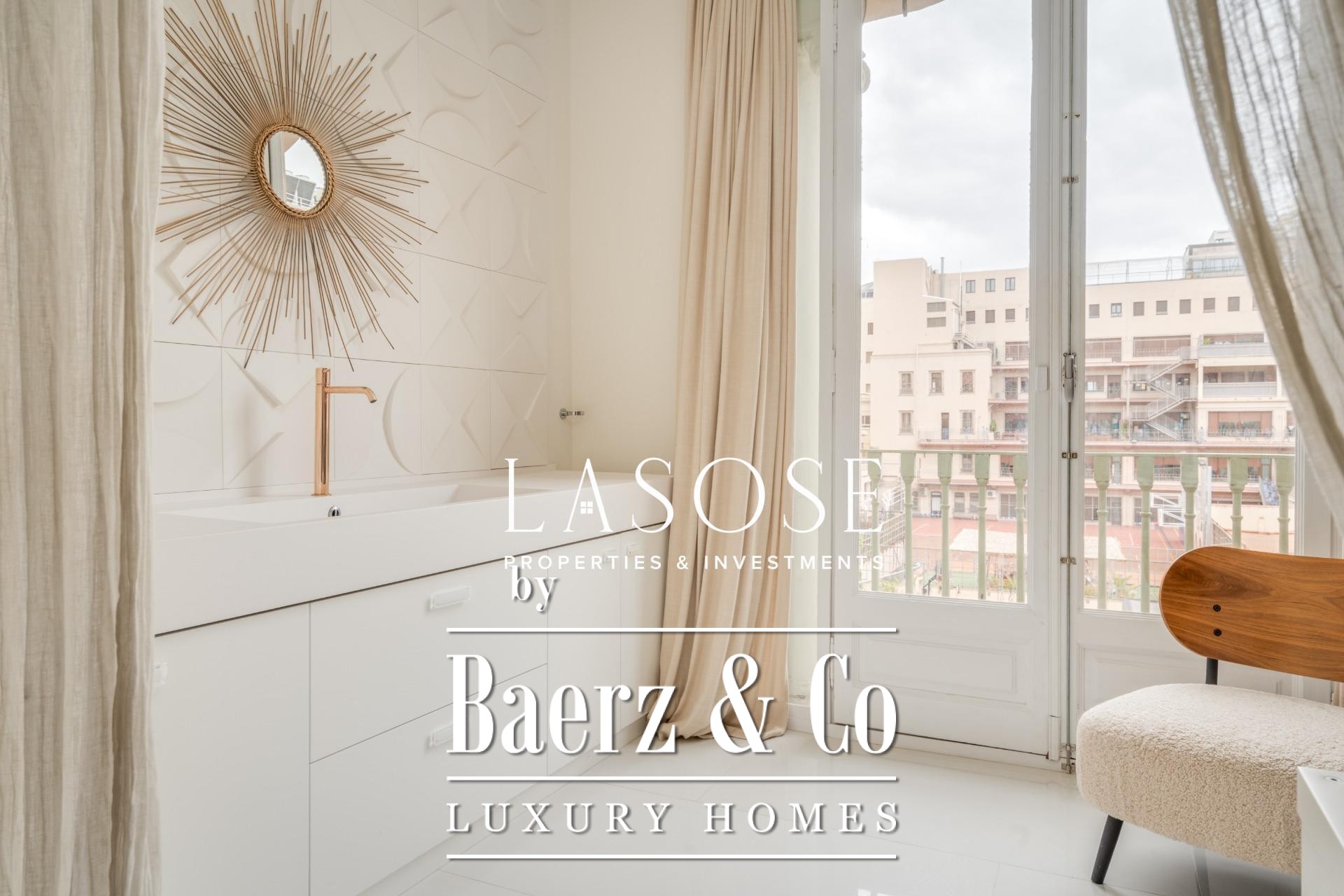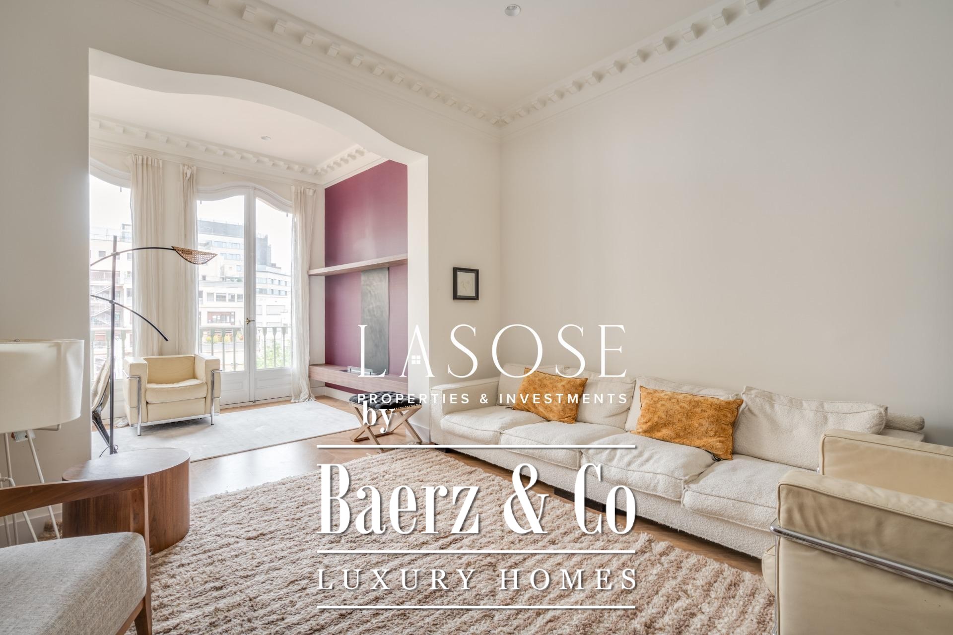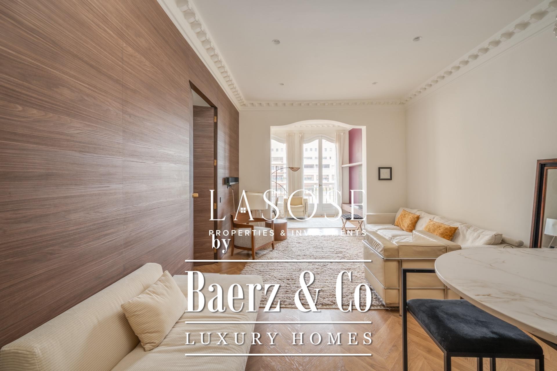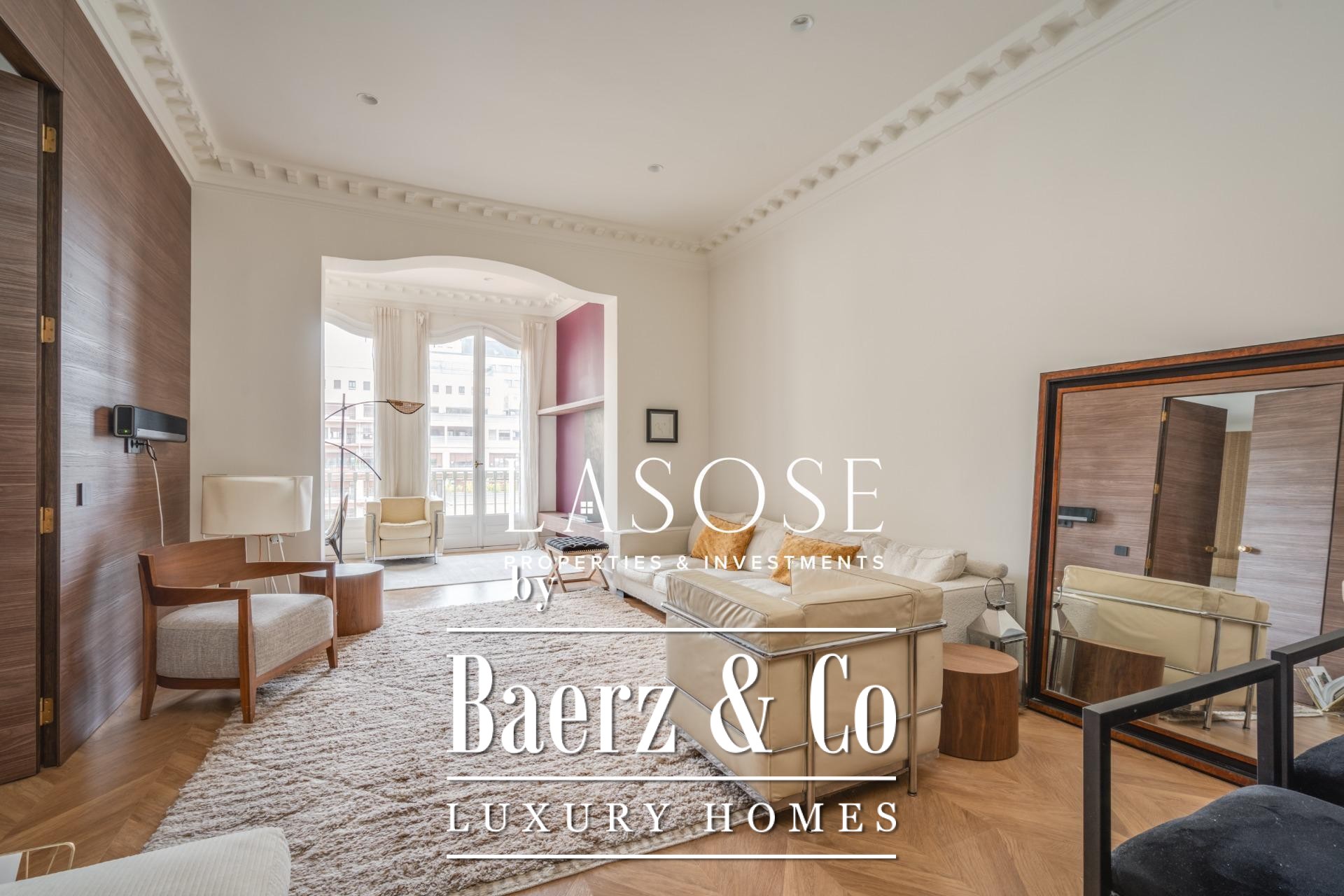 LASOSE presents this stunning apartment in one of the most emblematic street of Barcelona, Paseo de Gracia. This property has been recently renovated with luxury qualities that provide comfort and a modern lifestyle. Located on a real third floor of a royal estate designed by renowned architect Josep Puig & Cadafalch, this apartment is situated across the street from the iconic Casa Batllo and Casa Amatller buildings.. . Upon entering this wonderful property, we are greeted by a cozy entrance that leads to a first single bedroom with fitted closets and a full bathroom. Opposite, we find a spacious double bedroom. Next we pass through the kitchen open to the living room. It is fully equipped with high-end appliances, has an elegant bar, ideal for enjoying special moments.. . The spacious living room is divided by a fantastic gallery providing daylight thanks to the large original windows restored with double glazing. As a finale to this fabulous apartment, we find the master suite with dressing room, overlooking the Tuscan style courtyard and a full bathroom with shower.. . Equipped with underfloor heating by aerothermal, air conditioning by conducts, gas fireplace, this apartment is delivered fully furnished. In