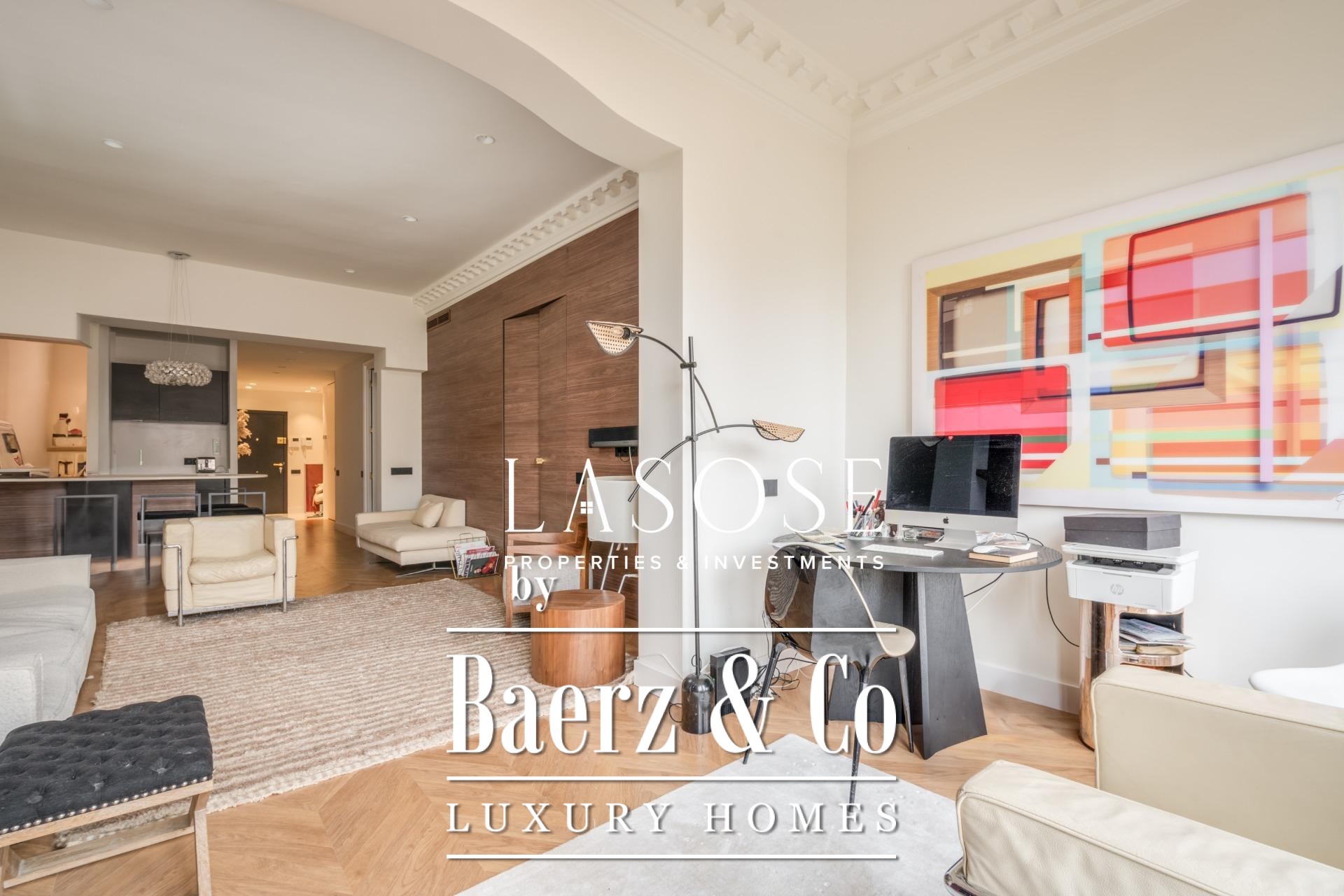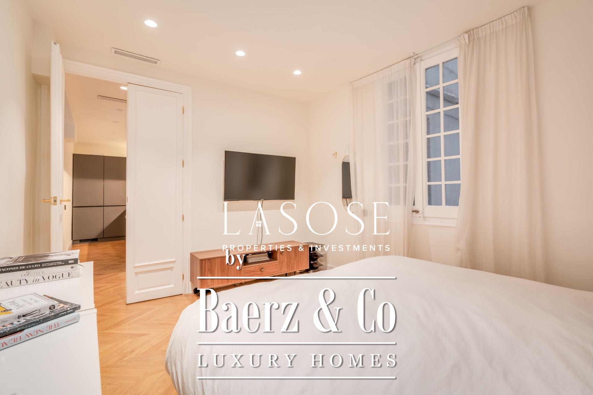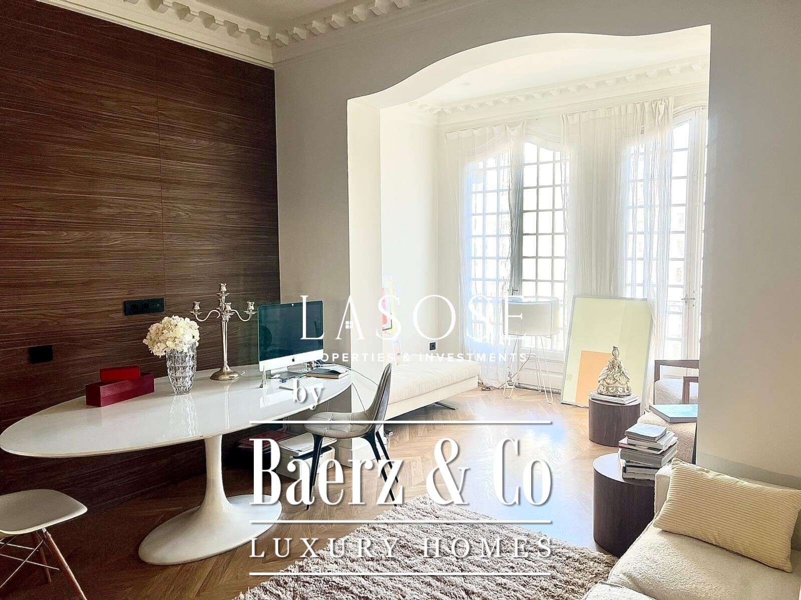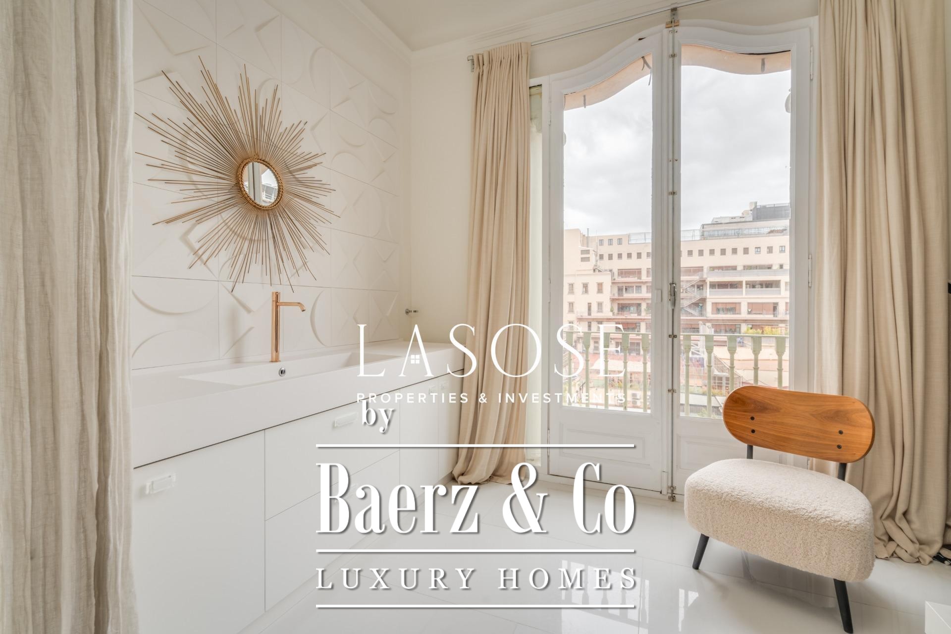 LASOSE presents this stunning apartment in one of the most emblematic street of Barcelona, Paseo de Gracia. This property has been recently renovated with luxury qualities that provide comfort and a modern lifestyle. Located on a real third floor of a royal estate designed by renowned architect Josep Puig & Cadafalch, this apartment is situated across the street from the iconic Casa Batllo and Casa Amatller buildings.. . Upon entering this wonderful property, we are greeted by a cozy entrance that leads to a first single bedroom with fitted closets and a full bathroom. Opposite, we find a spacious double bedroom. Next we pass through the kitchen open to the living room. It is fully equipped with high-end appliances, has an elegant bar, ideal for enjoying special moments.. . The spacious living room is divided by a fantastic gallery providing daylight thanks to the large original windows restored with double glazing. As a finale to this fabulous apartment, we find the master suite with dressing room, overlooking the Tuscan style courtyard and a full bathroom with shower.. . Equipped with underfloor heating by aerothermal, air conditioning by conducts, gas fireplace, this apartment is delivered fully furnished. In