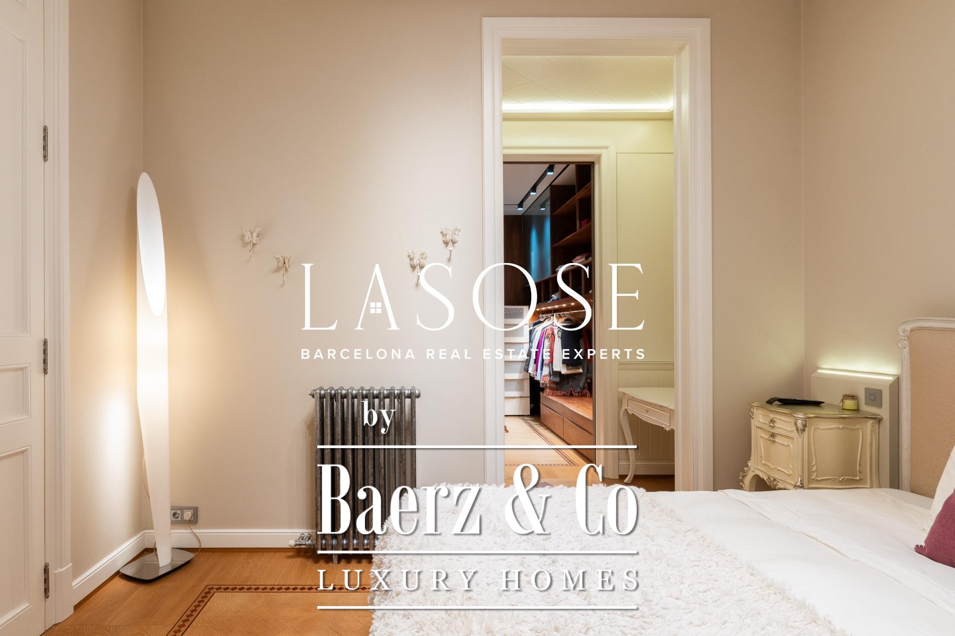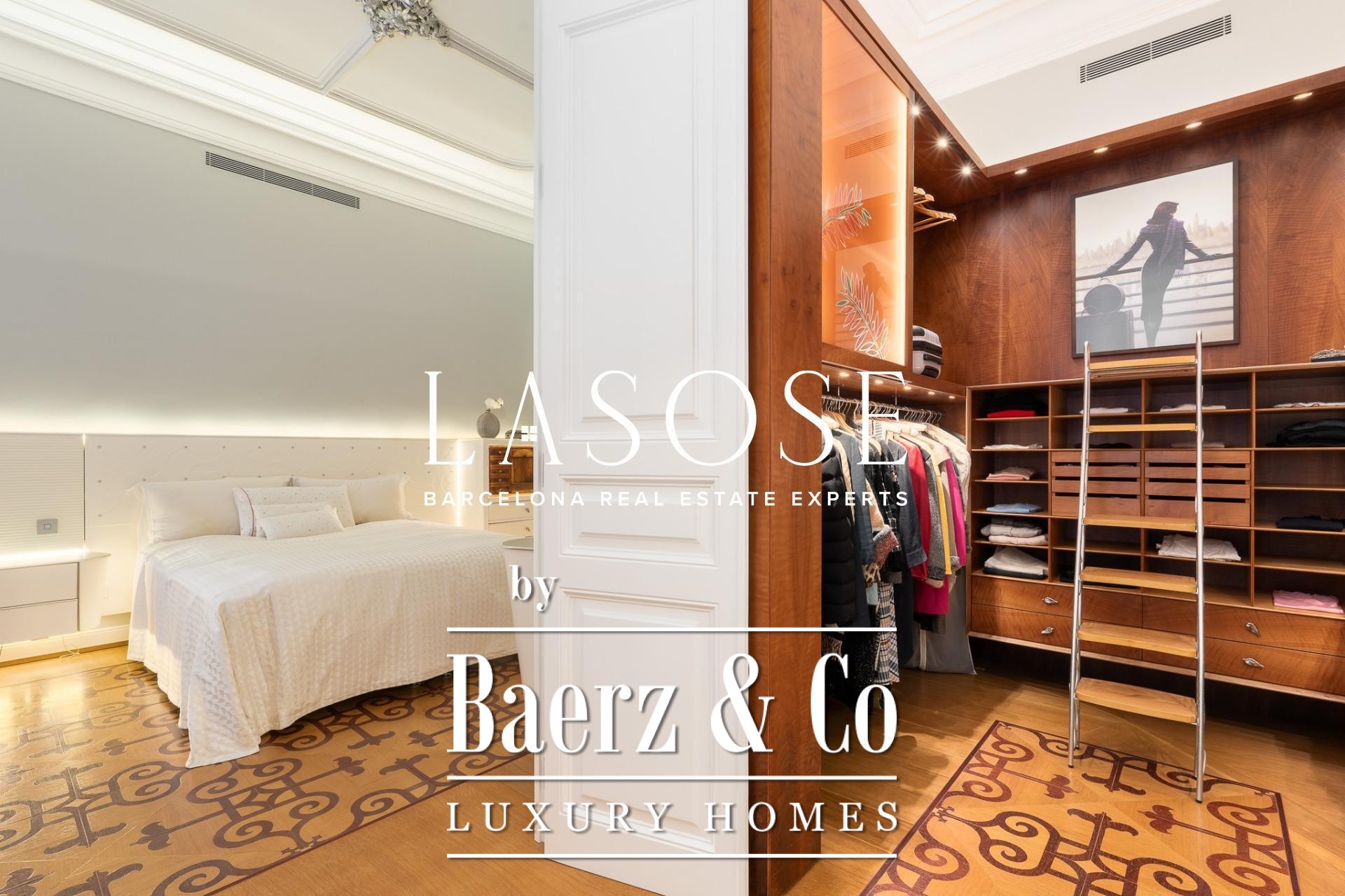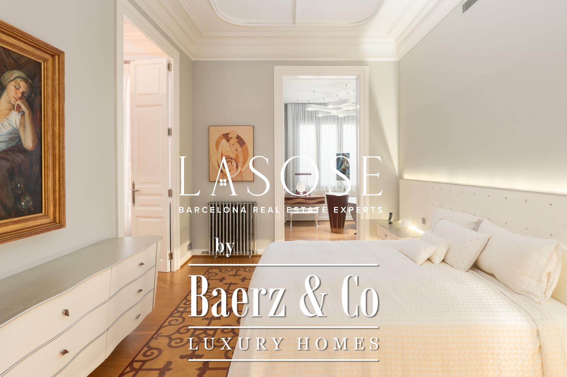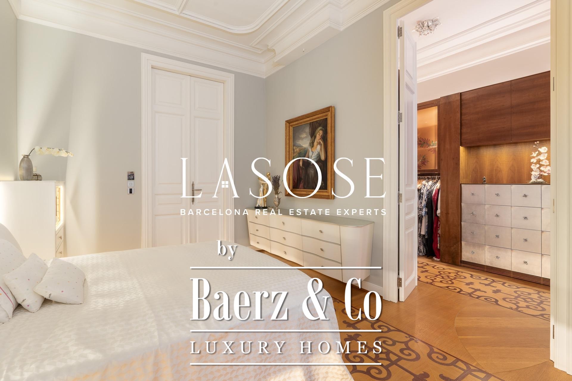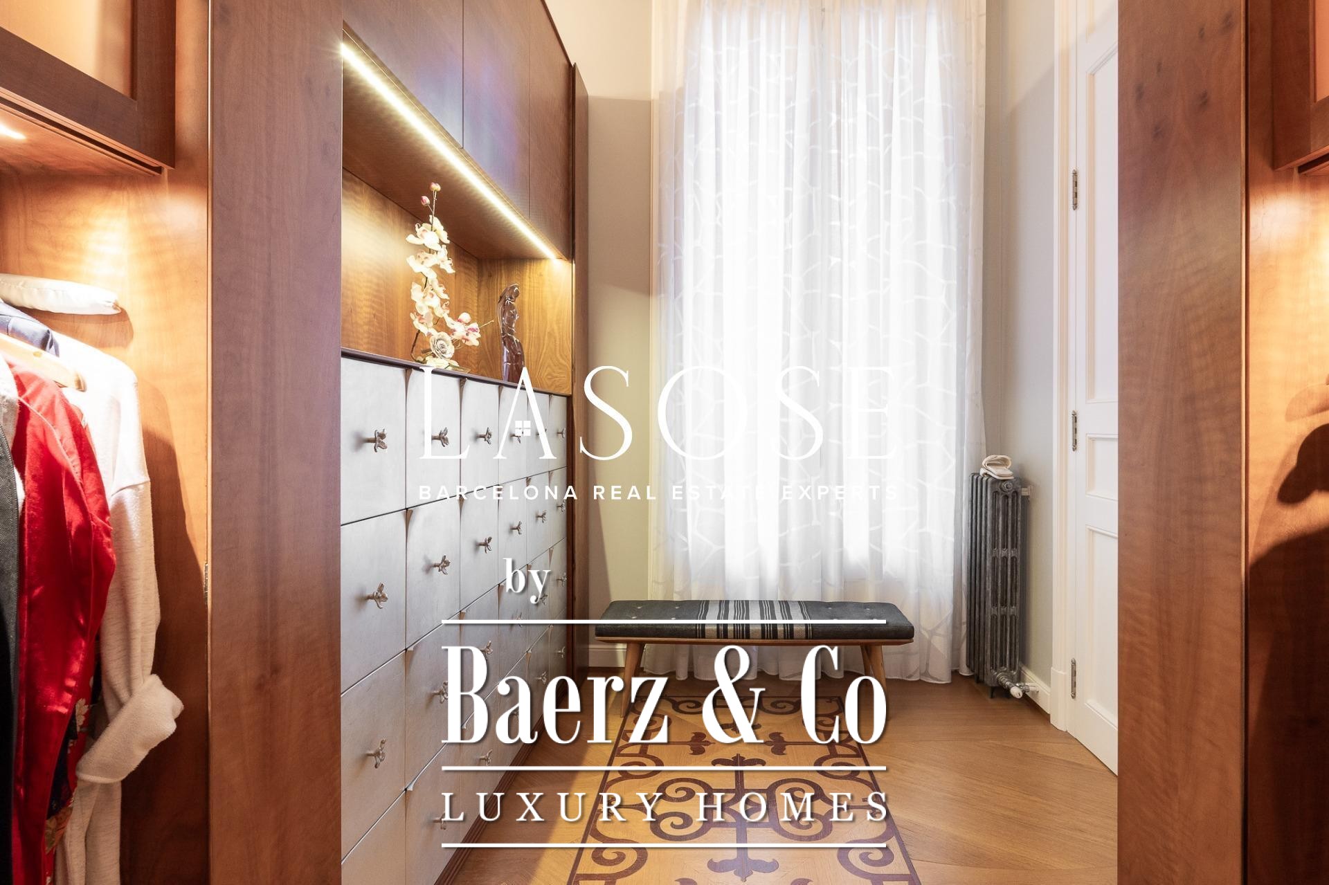 style.. . In the night area, there are two impressive en-suite bedrooms. The master bedroom, facing the peaceful courtyard, has a dreamy dressing room and an elegant bathroom located in a glazed gallery that allows natural light to flood in. The second bedroom, equally spacious, also has its own dressing room and private bathroom.. . The property is equipped with the latest technology: home automation system, ducted air conditioning and heating with wrought iron radiators, guaranteeing maximum comfort all year round. The double-glazed windows and the restoration of the original carpentry provide a perfect balance between classic and modern.. . This property enjoys a double orientation that makes it a bright home all day long. In addition, the building has a lift and only one flat per floor, ensuring privacy and tranquillity.. . Located in one of the most exclusive areas of Barcelona, surrounded by luxury boutiques, renowned restaurants and excellent public transport links, this property is perfect for those looking for a sophisticated lifestyle in the city centre.