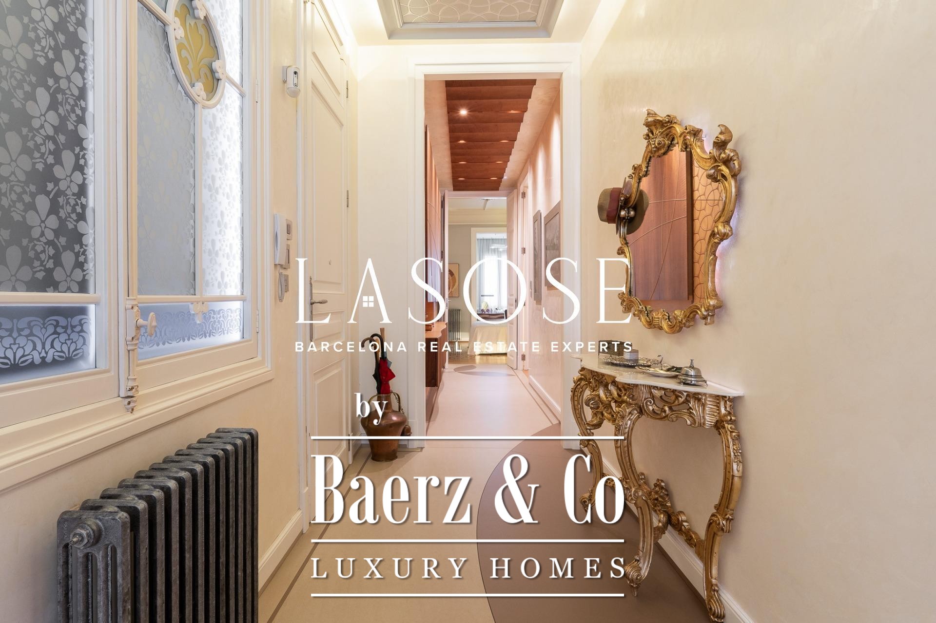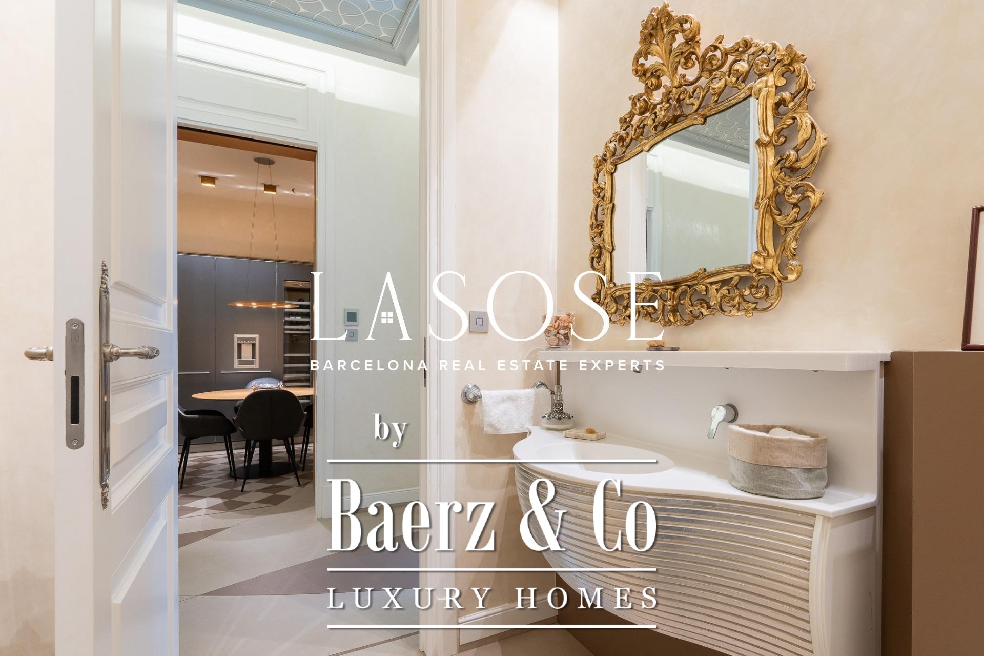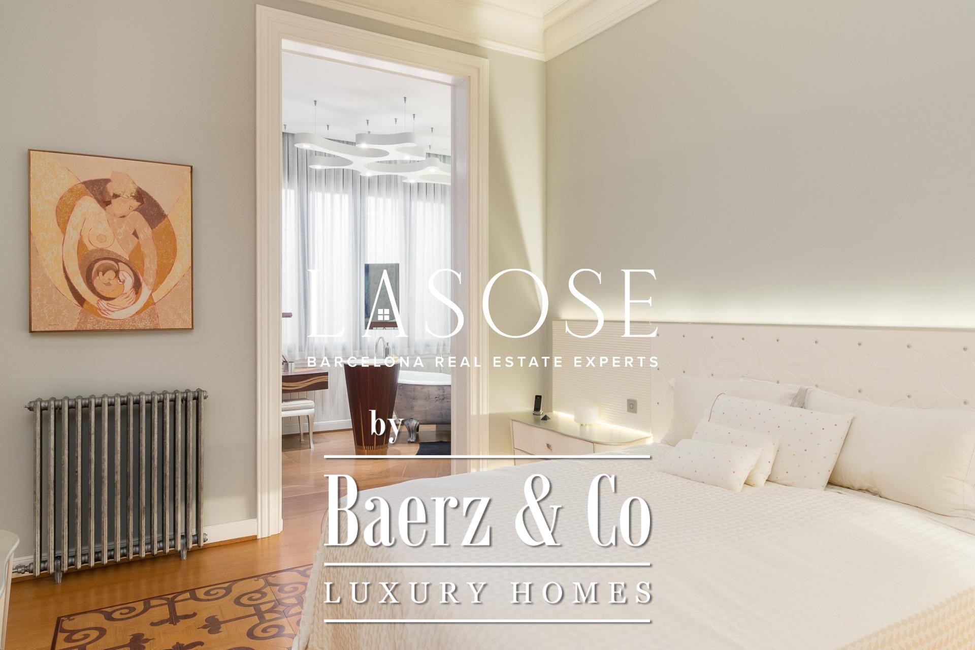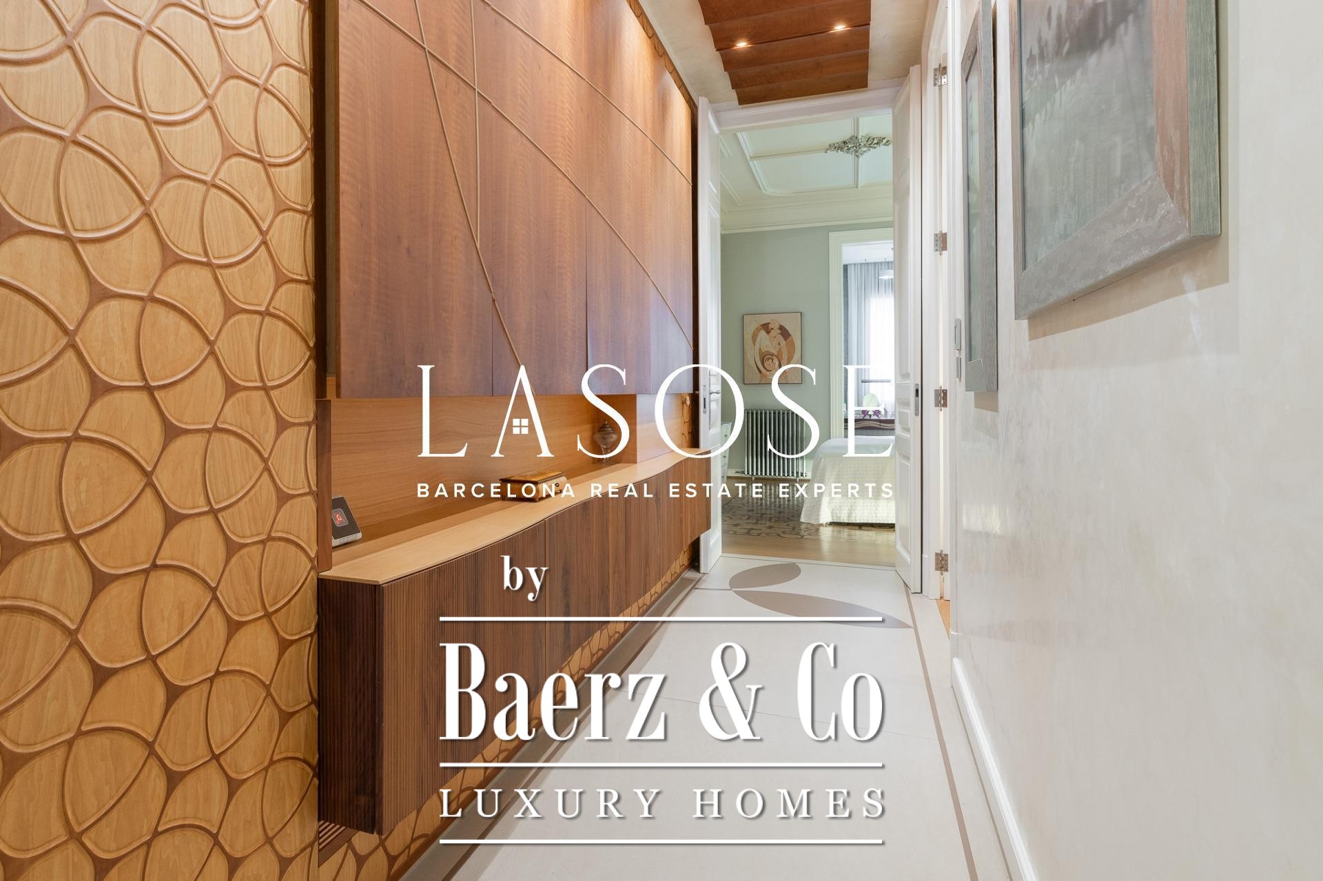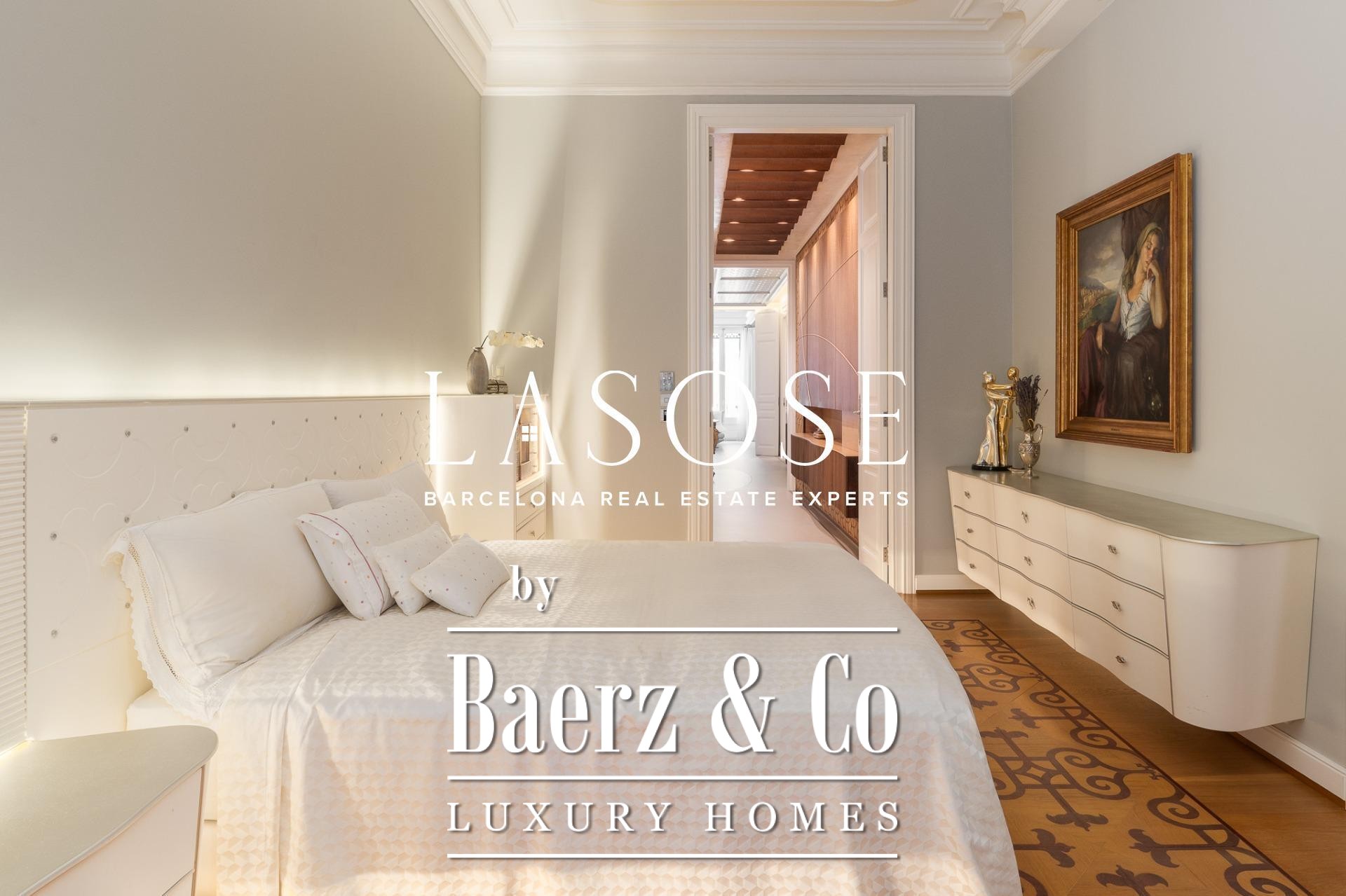 style.. . In the night area, there are two impressive en-suite bedrooms. The master bedroom, facing the peaceful courtyard, has a dreamy dressing room and an elegant bathroom located in a glazed gallery that allows natural light to flood in. The second bedroom, equally spacious, also has its own dressing room and private bathroom.. . The property is equipped with the latest technology: home automation system, ducted air conditioning and heating with wrought iron radiators, guaranteeing maximum comfort all year round. The double-glazed windows and the restoration of the original carpentry provide a perfect balance between classic and modern.. . This property enjoys a double orientation that makes it a bright home all day long. In addition, the building has a lift and only one flat per floor, ensuring privacy and tranquillity.. . Located in one of the most exclusive areas of Barcelona, surrounded by luxury boutiques, renowned restaurants and excellent public transport links, this property is perfect for those looking for a sophisticated lifestyle in the city centre.