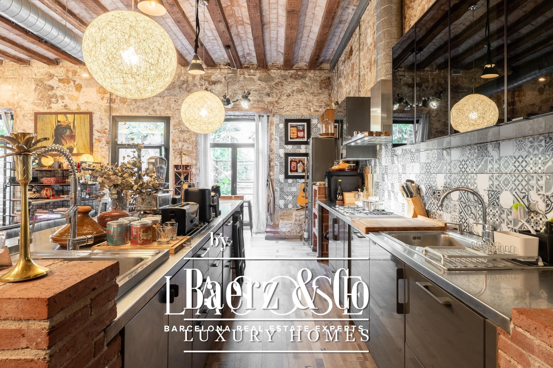 Upon entry, a corridor with floor-to-ceiling windows fills the space with natural light and frames serene views of an interior patio. Three double bedrooms, each with private bathroom, are positioned for privacy and tranquility. A large multifunctional room offers flexibility for work or leisure. The day area is defined by its soaring five-meter ceilings, original brickwork, and decorative tile. The open kitchen flows seamlessly into a living room warmed by a wood fireplace.