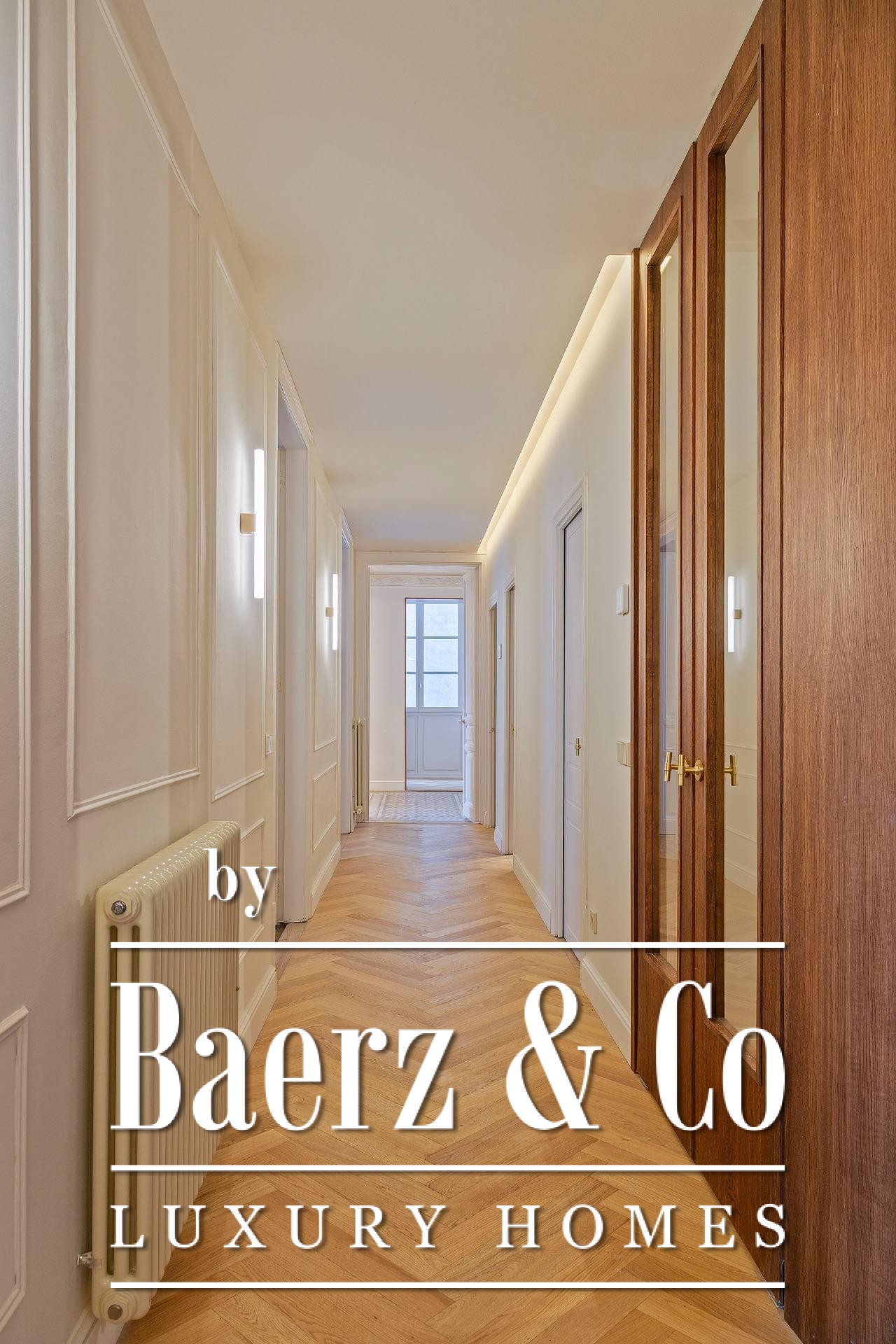 A versatile independent study provides options for work or retreat, complemented by two additional full bathrooms and a guest powder room. Restored original hydraulic tile floors and ceilings pair with herringbone natural oak parquet and bespoke paneling, combining authentic charm with elegant modernity. Balcon, elevator, fitted wardrobes, integrated laundry, and quality heating round out a property of enduring appeal.