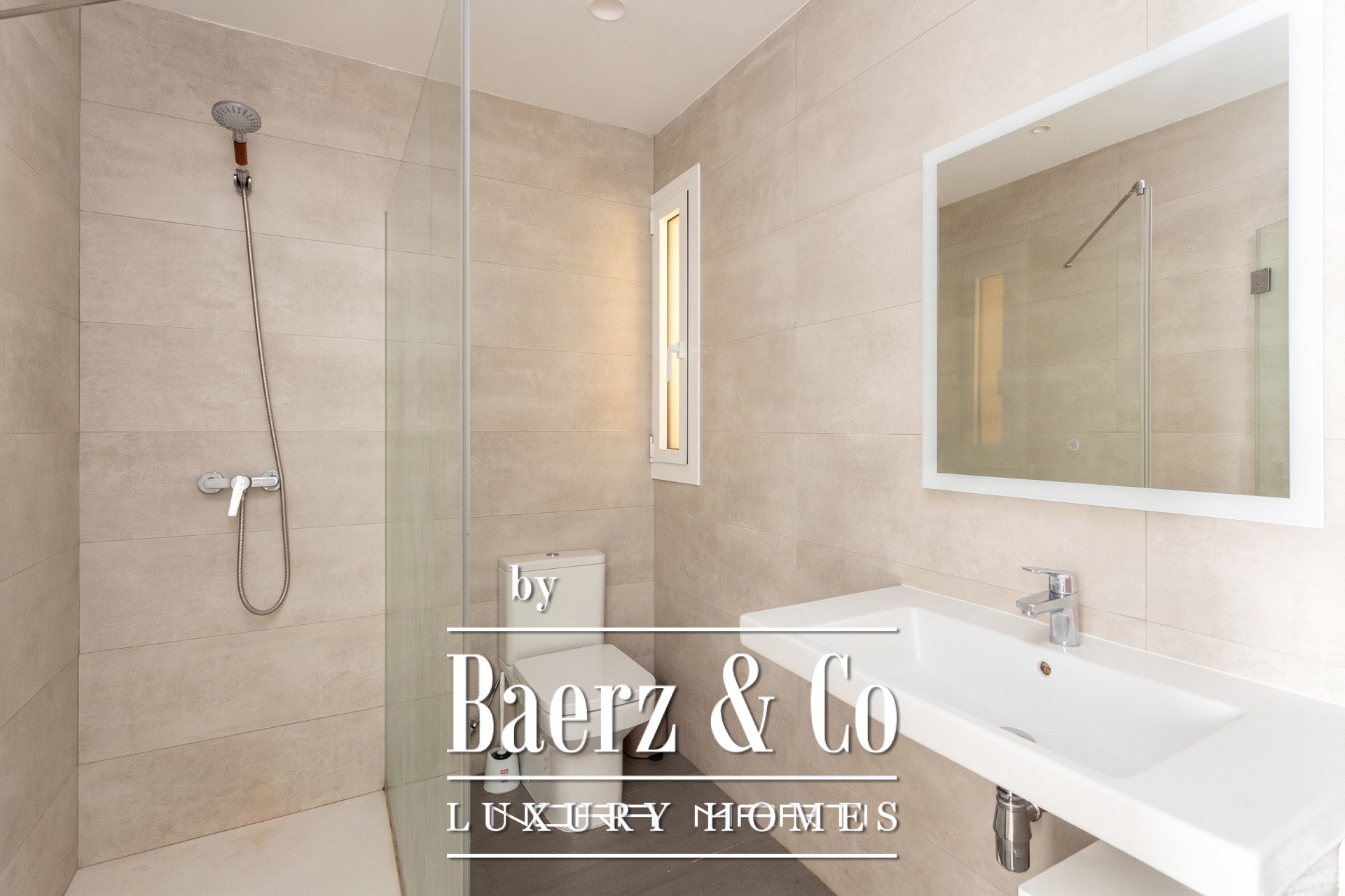 The renovated kitchen, fully equipped and distinctively bright, is complemented by a practical utility room. Four quietly private bedrooms define the sleeping area, including two en suite configurations with spacious bathrooms, one of which enjoys access to a balcony. Two further bedrooms, a double and a single, share a full bathroom, allowing households flexibility in use and privacy.