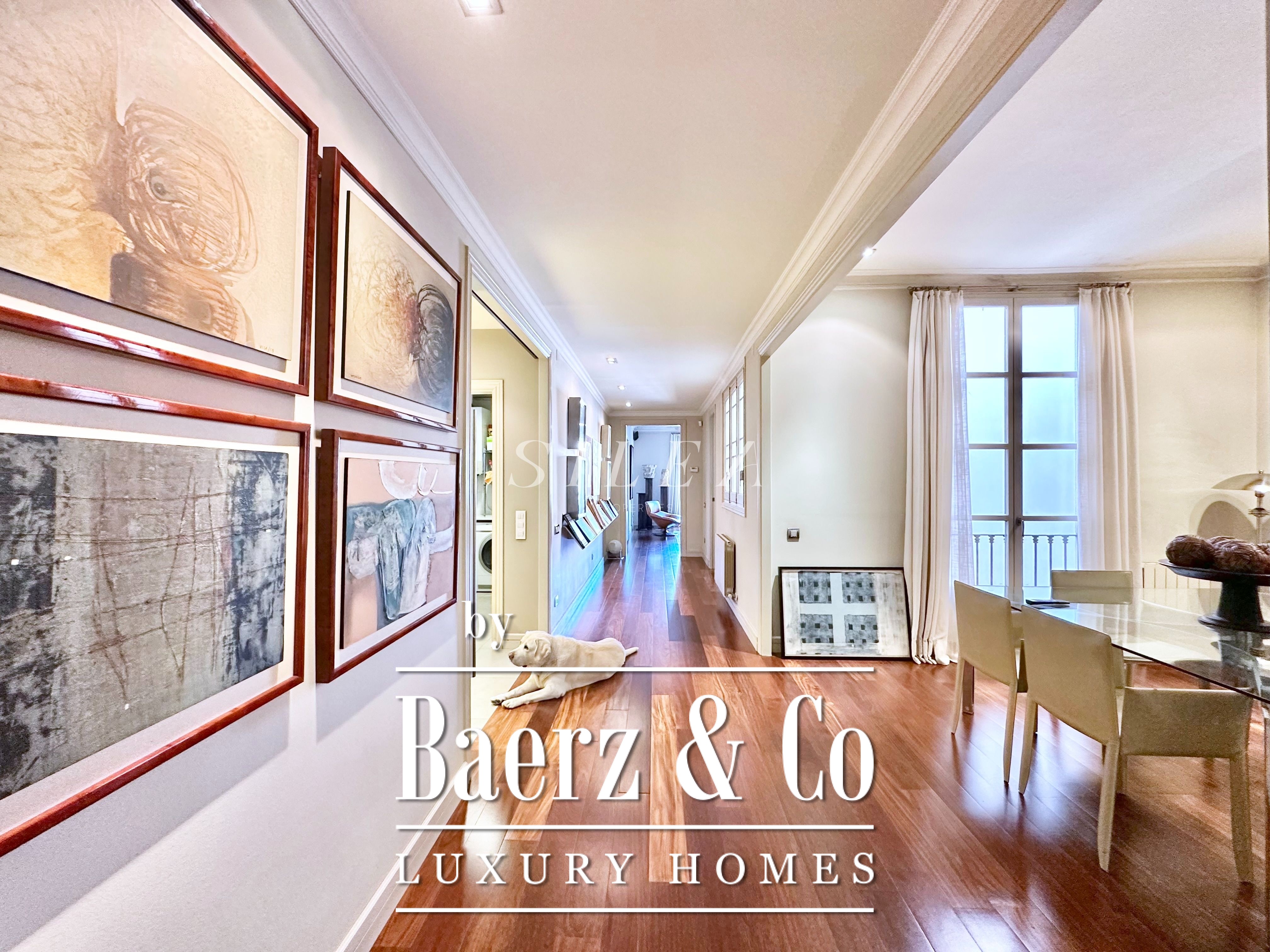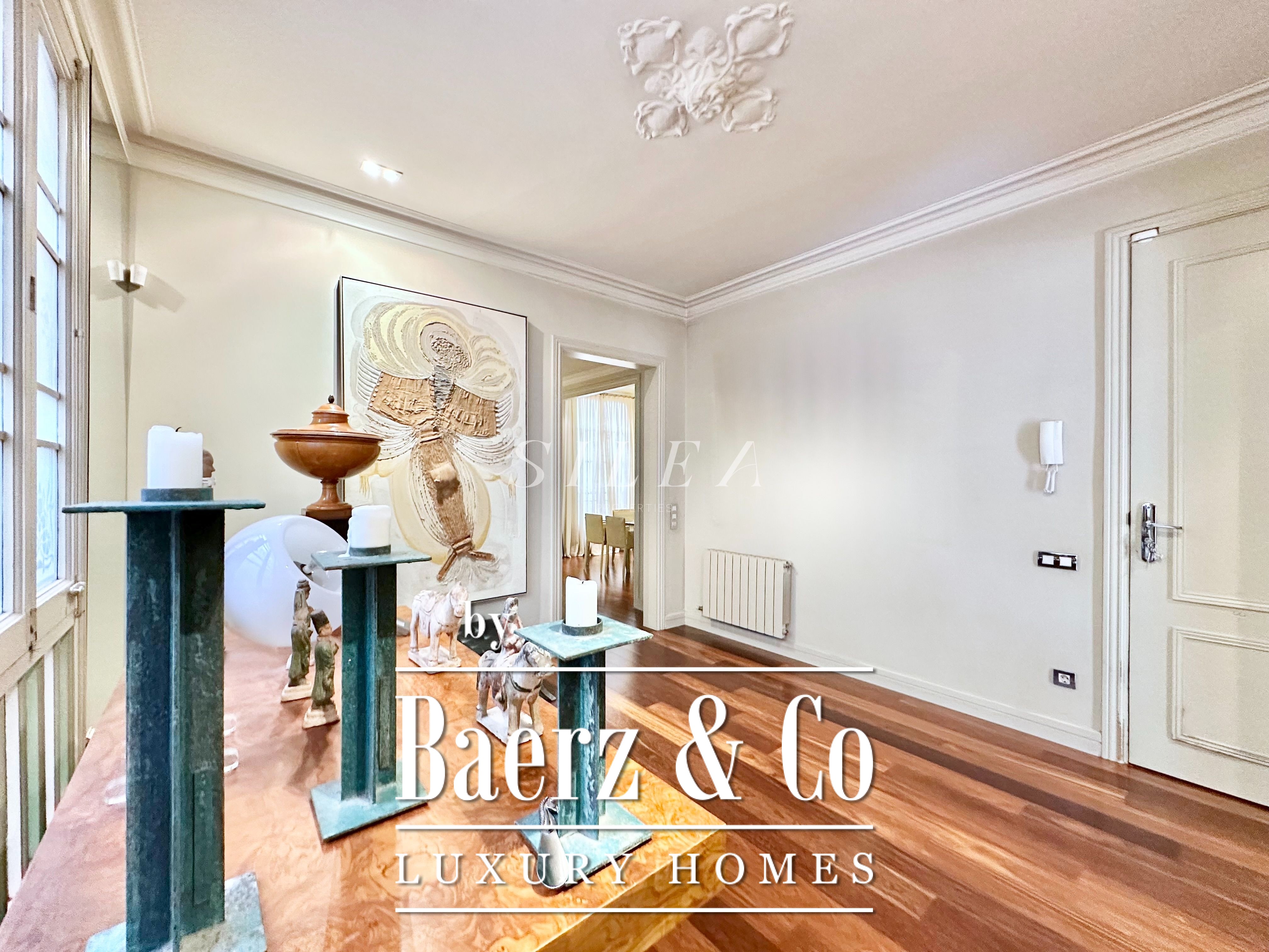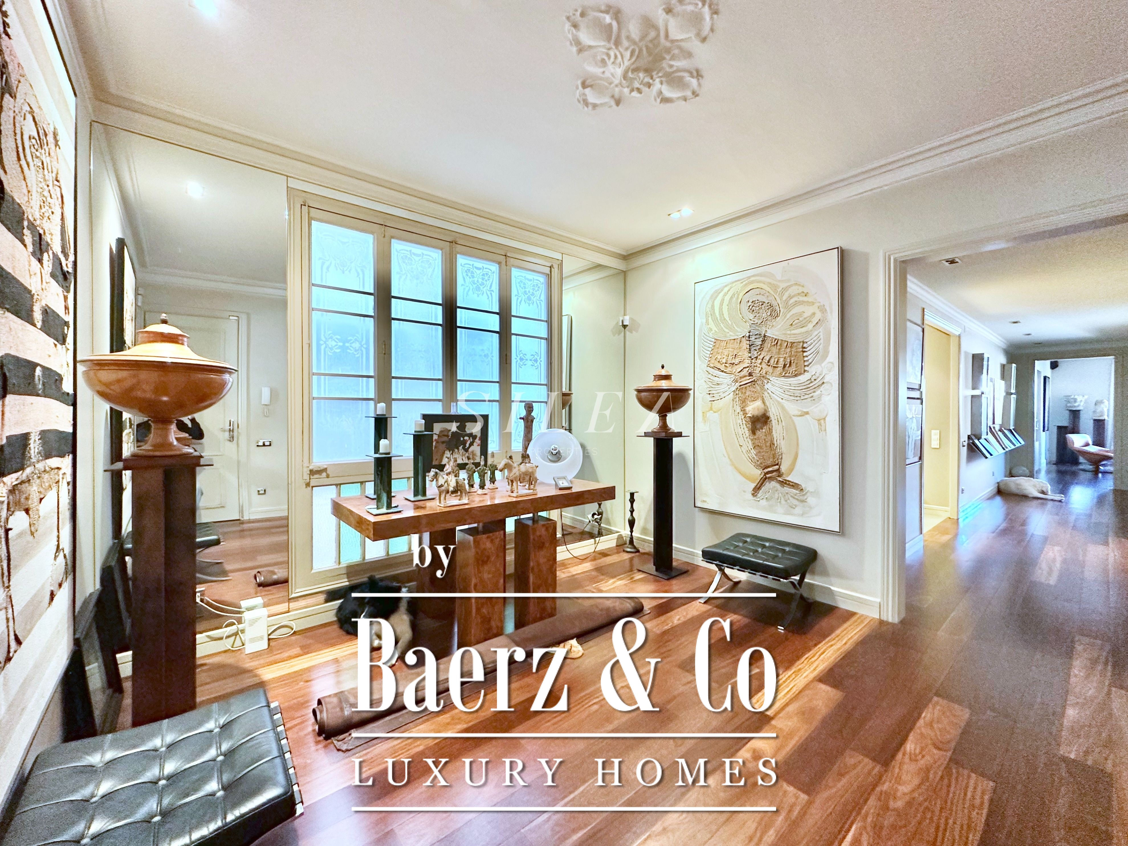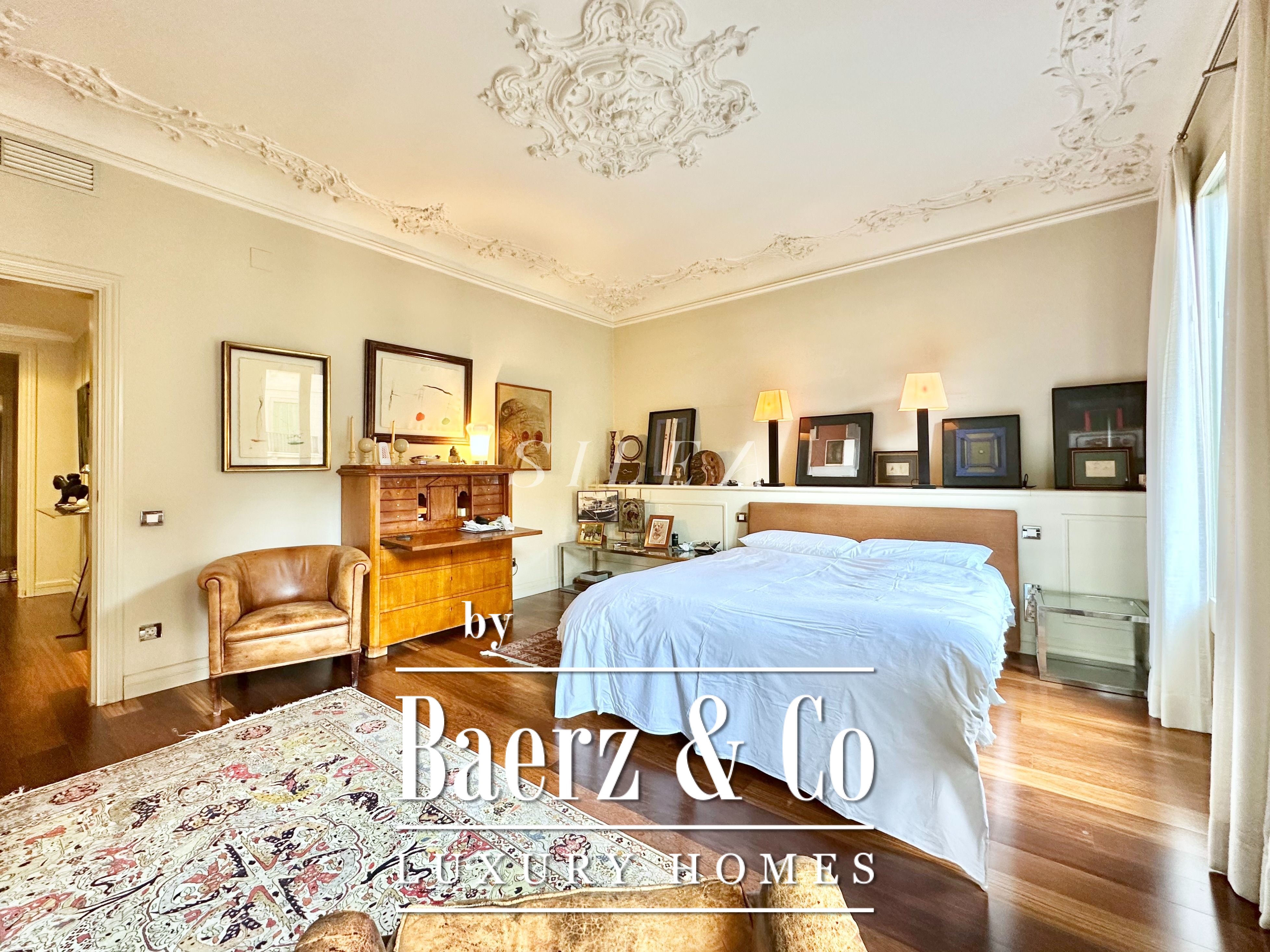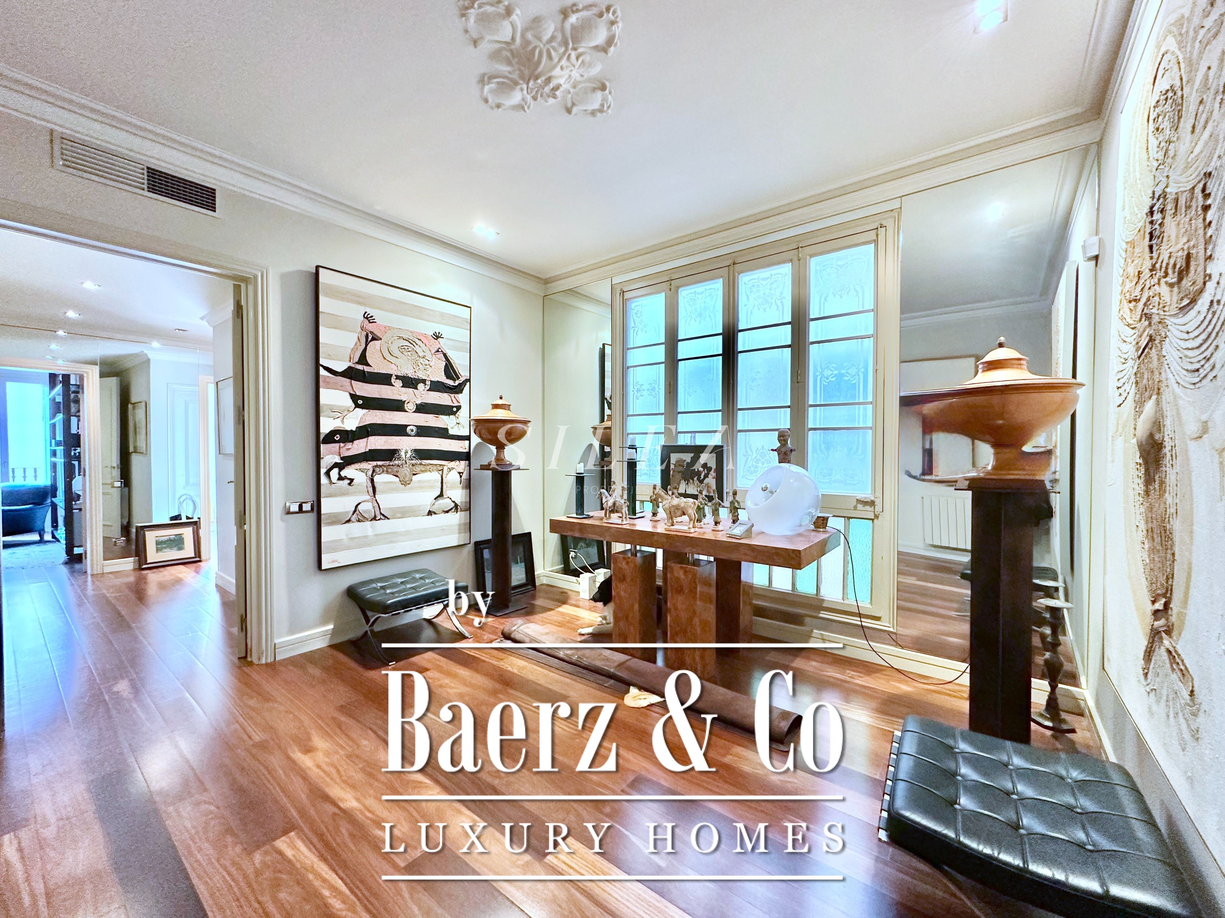 Spanning 258 m² with 228 m² of usable living space, the apartment impresses with its volume and flow. High ceilings and tall windows admit abundant natural light, while original parquet floors and elegant proportions establish a sense of calm grandeur. Two large living rooms allow for graceful entertaining or quiet retreat, one with a Juliet balcony opening to the stately façades of the Eixample.