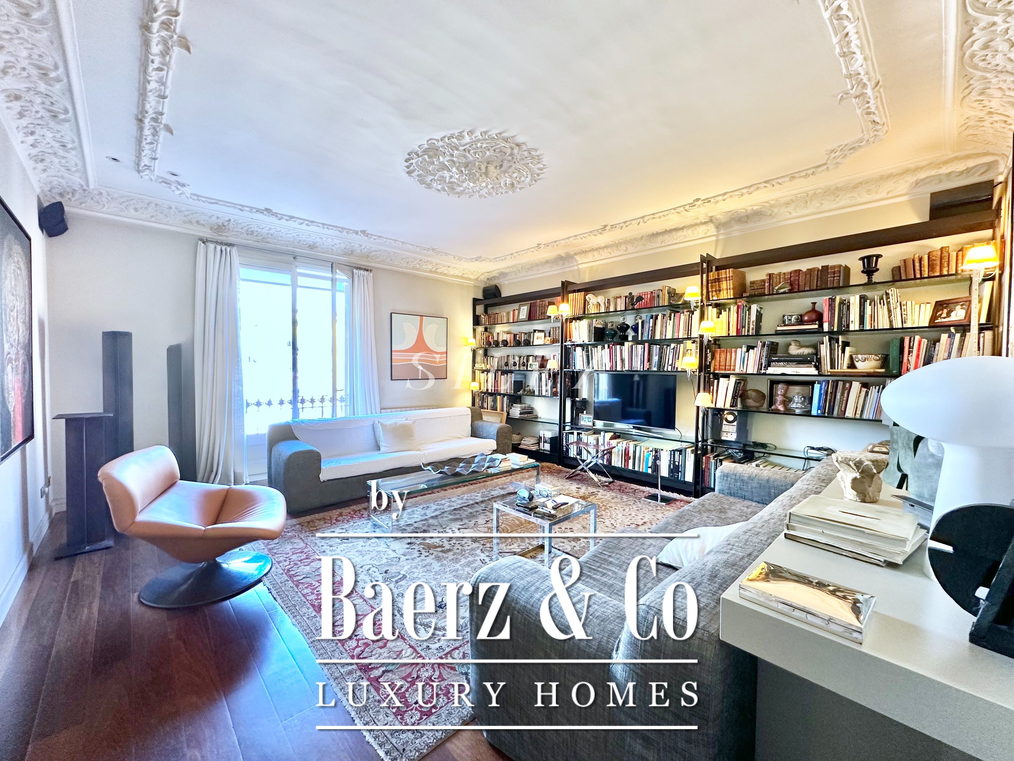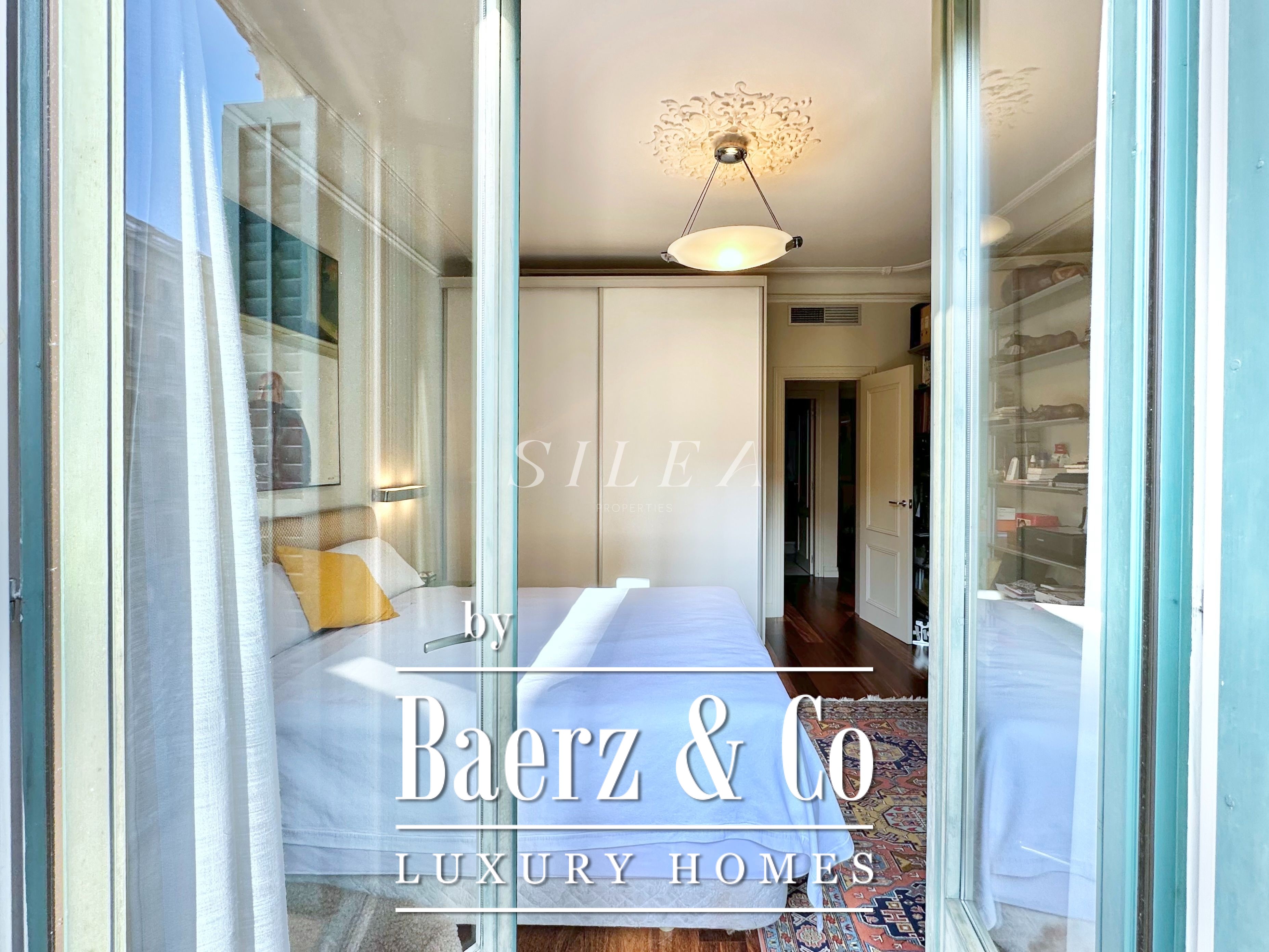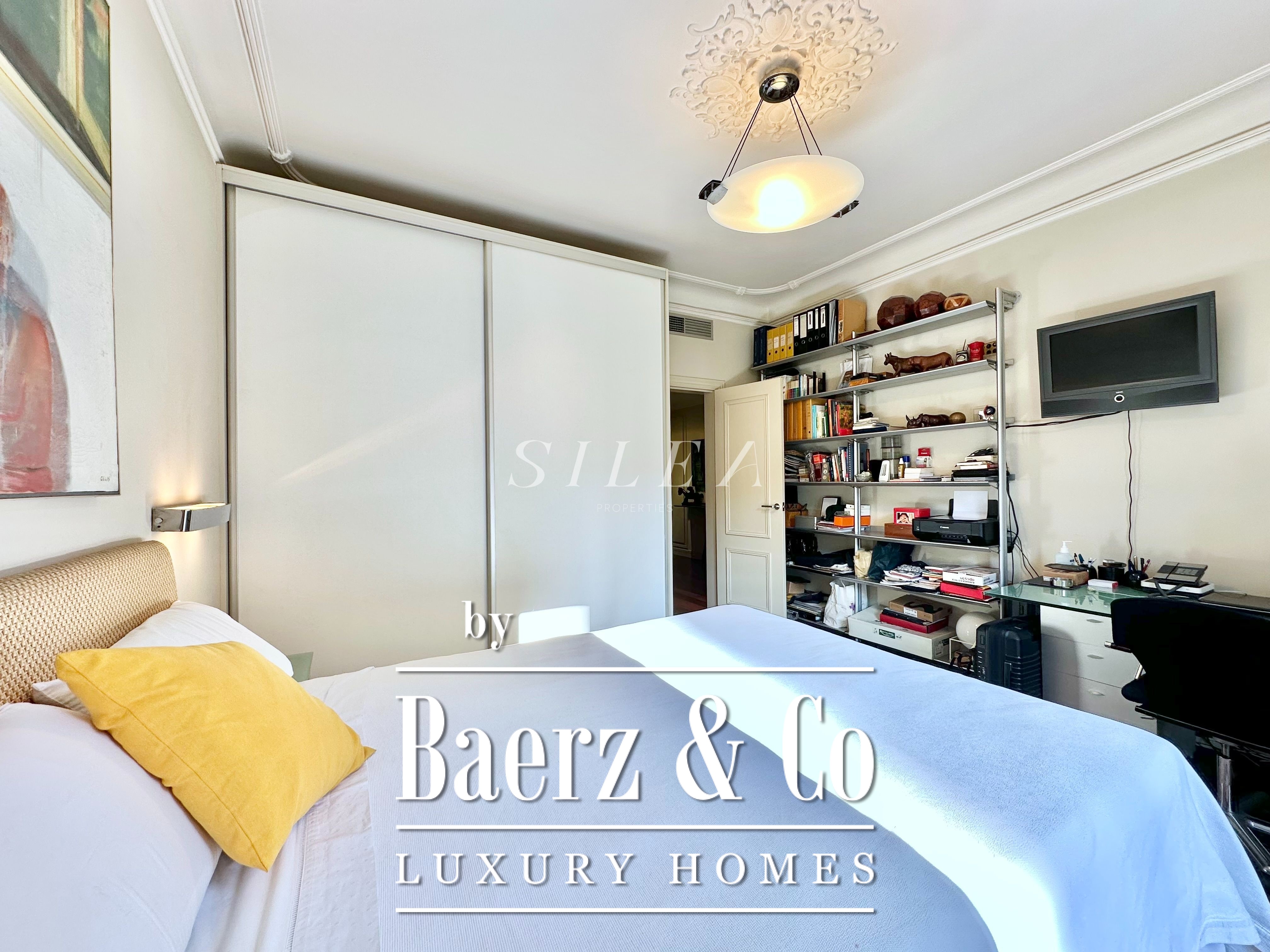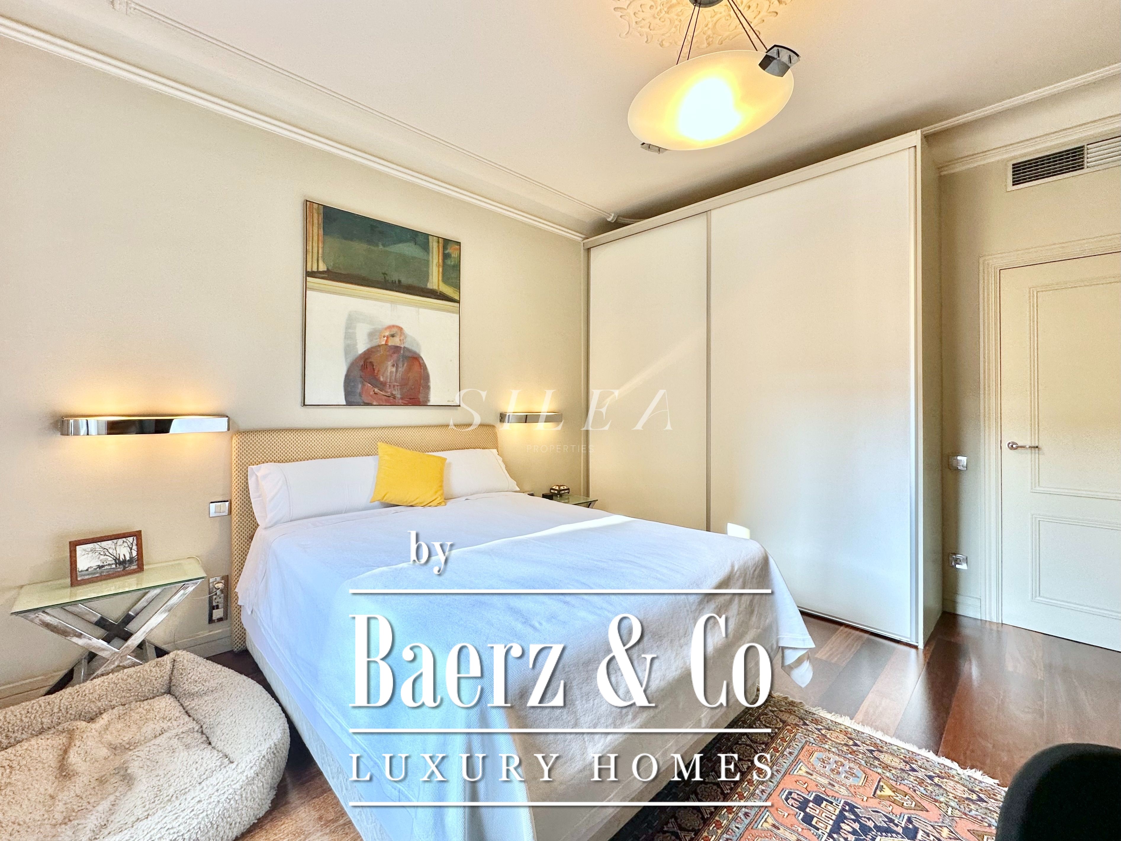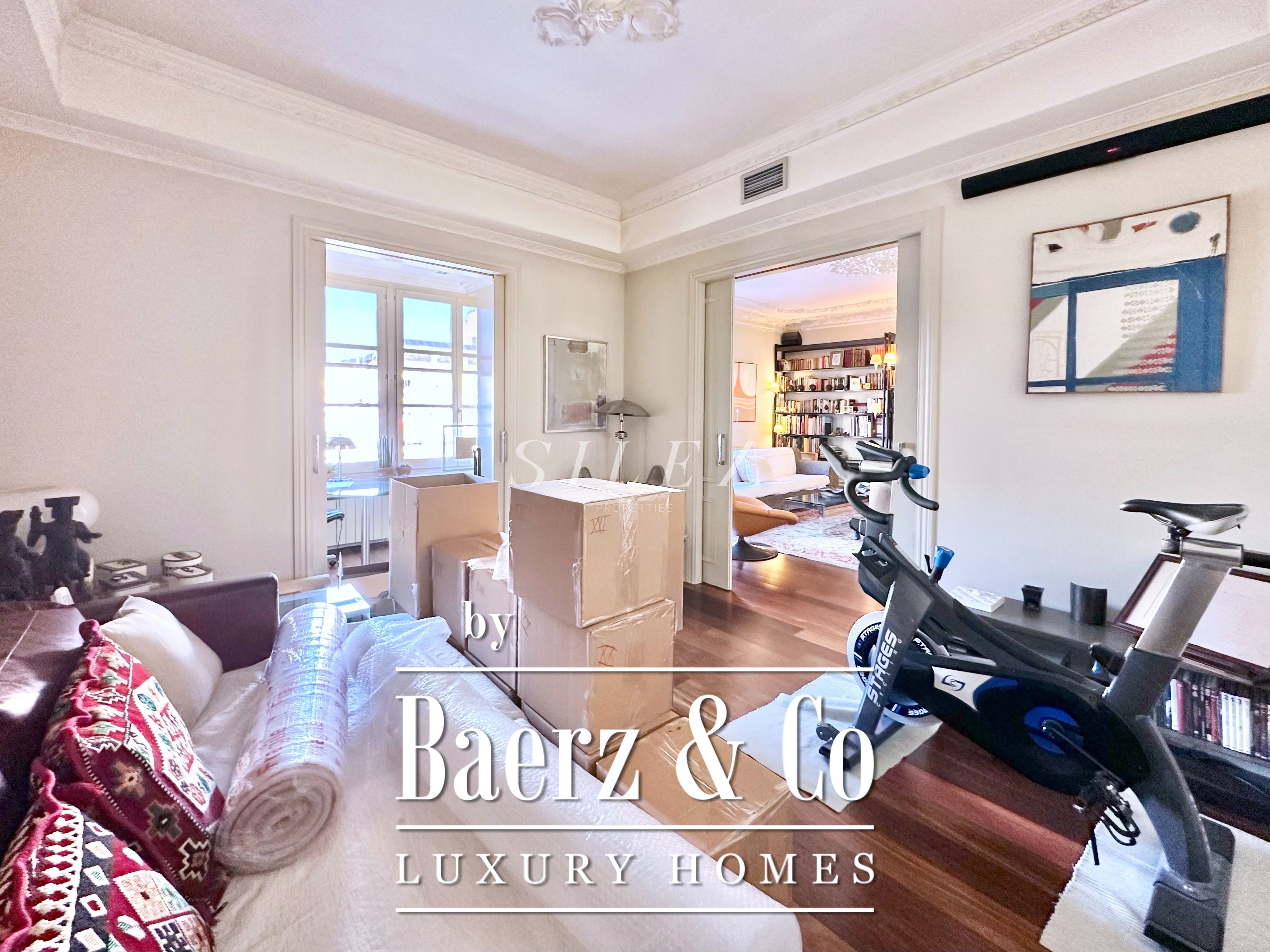 The apartment accommodates three bedrooms, including two double rooms with balcony access and luminous aspects. A third room adapts readily as a guest suite, private study or library. The separate office enhances versatility for home life or working in discretion. Three full bathrooms ensure comfort and privacy throughout. The separate kitchen is fully fitted and adjoins a practical laundry area, blending function with the fine lines of the space.