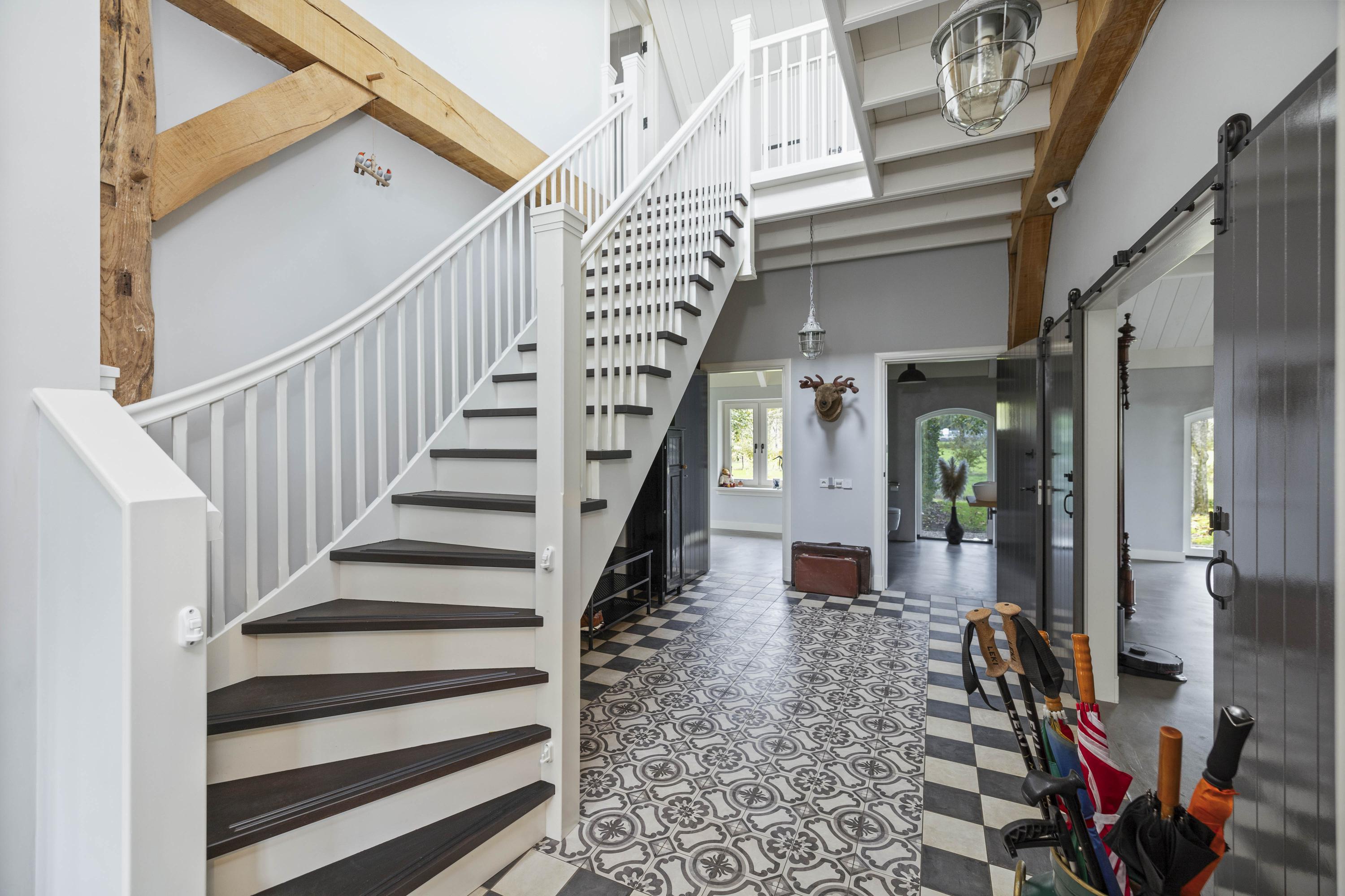 This magnificent farmhouse took on its current form in 2016, when the farm, which was built in 1924, was completely renovated. The emphasis was on sustainability: the exterior was fully insulated with polystyrene blocks, the house was fitted with new HR+++ glass all around, a water-water heat pump was installed (which exchanges and extracts heat at a depth of 75 metres), the interior floor was fitted with a robust cast floor – ideal in combination with underfloor heating – and a total of 110 (no, this is not a typo) solar panels were installed on the roofs. Under the bonnet, this house is all state-of-the-art technical ingenuity. Even the colour palette – the exterior is whitewashed with grey woodwork and beaded edging – contributes to the energy-efficient character of the house, because while the white facades reflect sunlight, the grey absorbs heat. Not only does this house have zero energy consumption, it also generates a considerable amount of energy! A home battery is therefore an excellent addition here.
