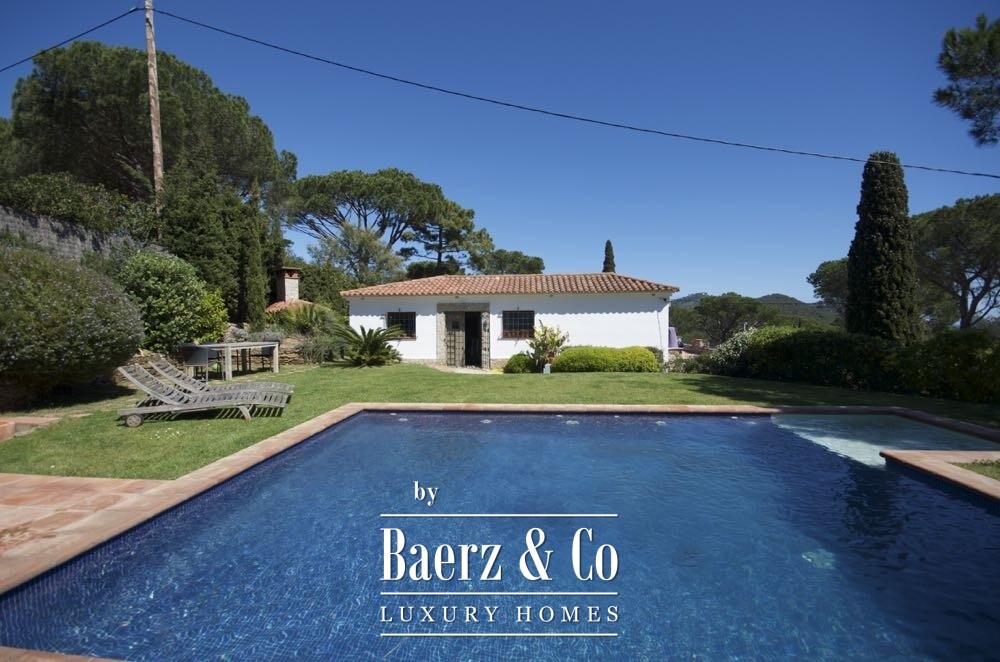 Outside, the meticulously maintained sunny garden frames a spacious swimming pool, ideal for quiet moments or gatherings. Features such as air conditioning, solar heating, and built-in wardrobes complement the serene setting. This contemporary villa in Begur offers subtle luxury and privacy against a backdrop of nature.
