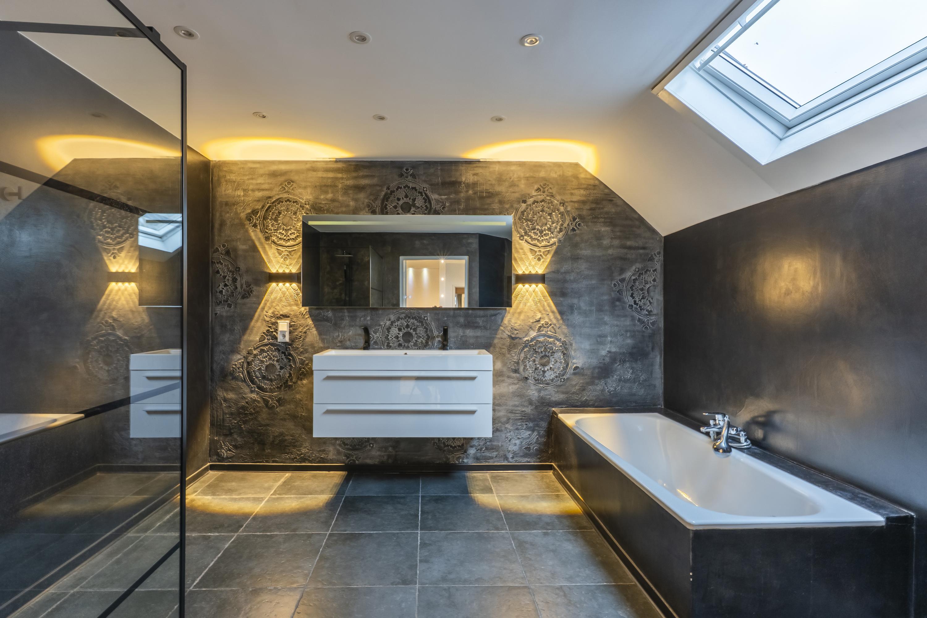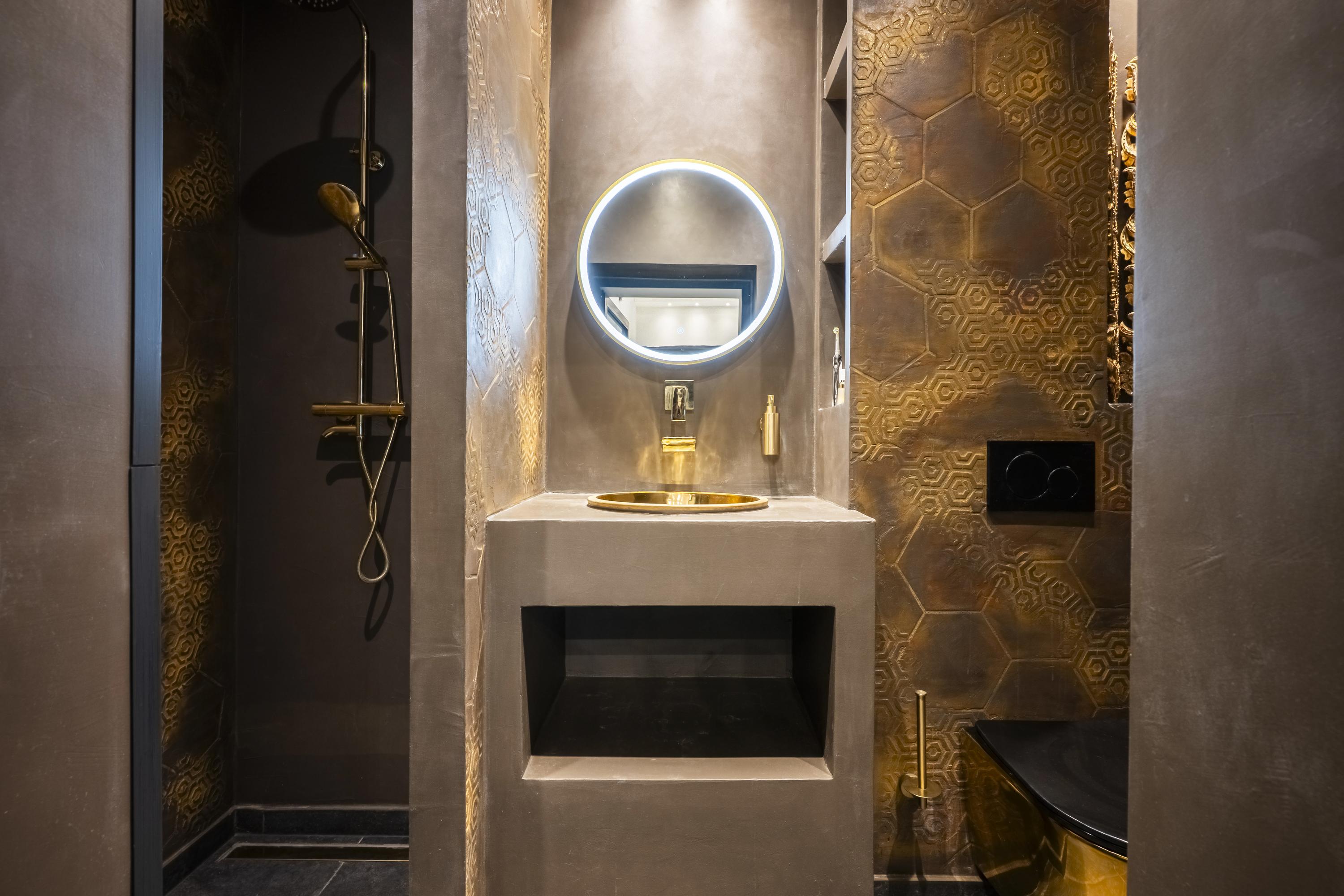 The main residence is conceived around light, proportion and a strict architectural consistency. The spacious living kitchen, fitted with Gaggenau appliances, forms the heart of the home. The adjoining living area exudes understated luxury with generous windows, a modern wood stove, and direct access to both the courtyard and the garden terraces. Large anthracite tiles extend seamlessly outdoors, creating a unified interior–exterior composition. A study (or additional bedroom) on the ground floor and the elegant Golden Bathroom complete the ground level.