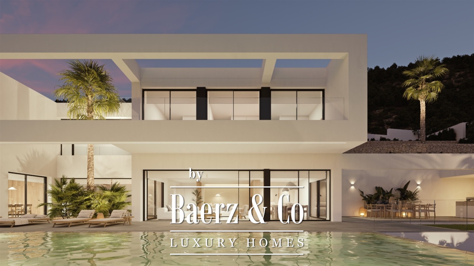 Villa Georgia is built in one of the most exclusive areas of the Benissa coast, in the prestigious Racó de Galeno. This modern villa is harmoniously integrated into a natural setting, a privileged viewpoint over the sea. You enter the property, situated at the top of the plot, through an elegant pedestrian entrance next to a garage for two cars. Here, you can access all floors of the property via an outdoor staircase and an elevator. Villa Georgia makes an immediate impression with its sleek lines, large white volumes, and big windows, allowing indoor and outdoor spaces to blend seamlessly. The front opens onto a large terrace with an infinity pool, creating a continuous area with a lounge, dining area, and panoramic views of the Mediterranean Sea. The interior is designed with noble materials, soft colors, and well-considered natural lighting.
