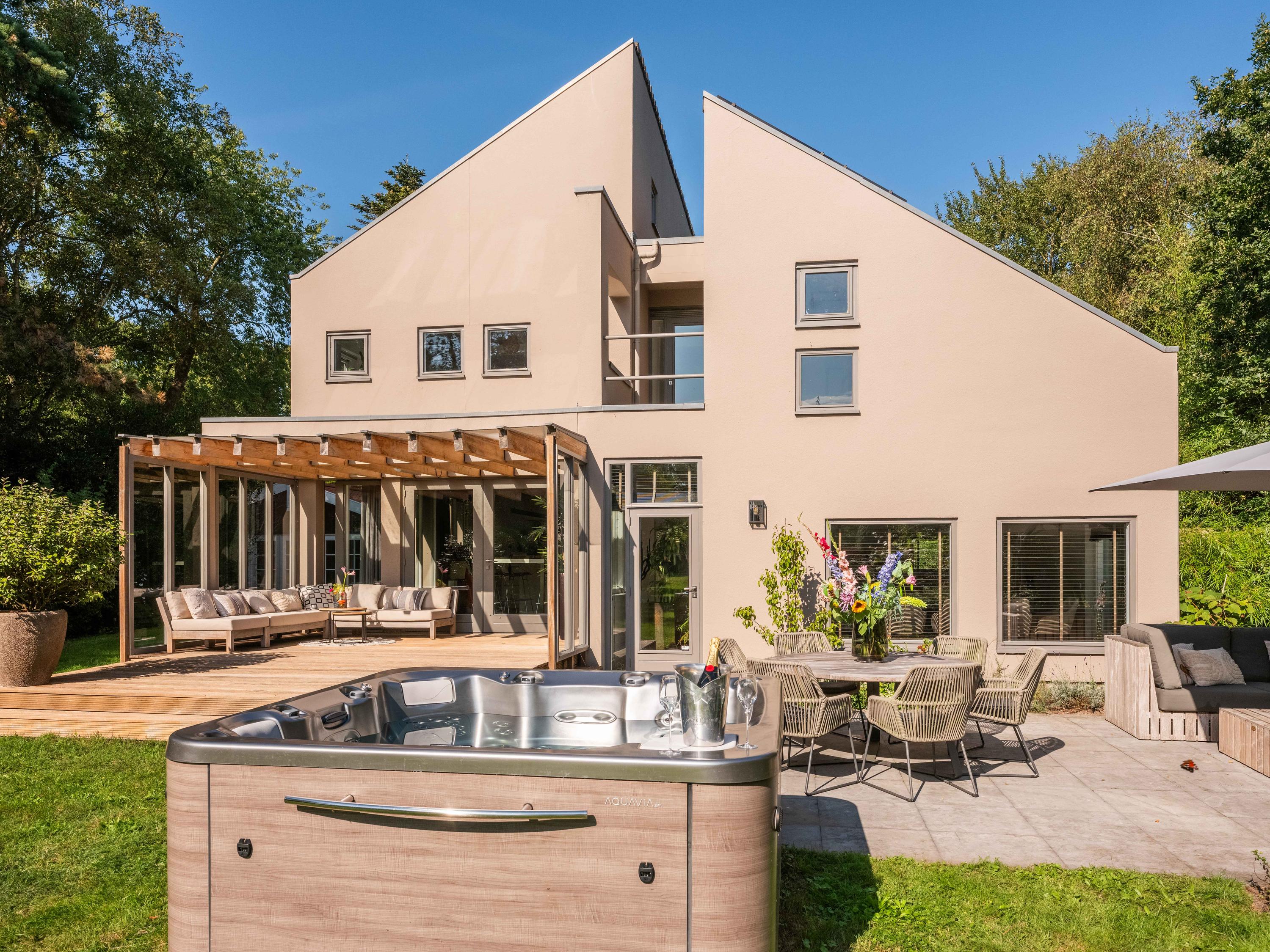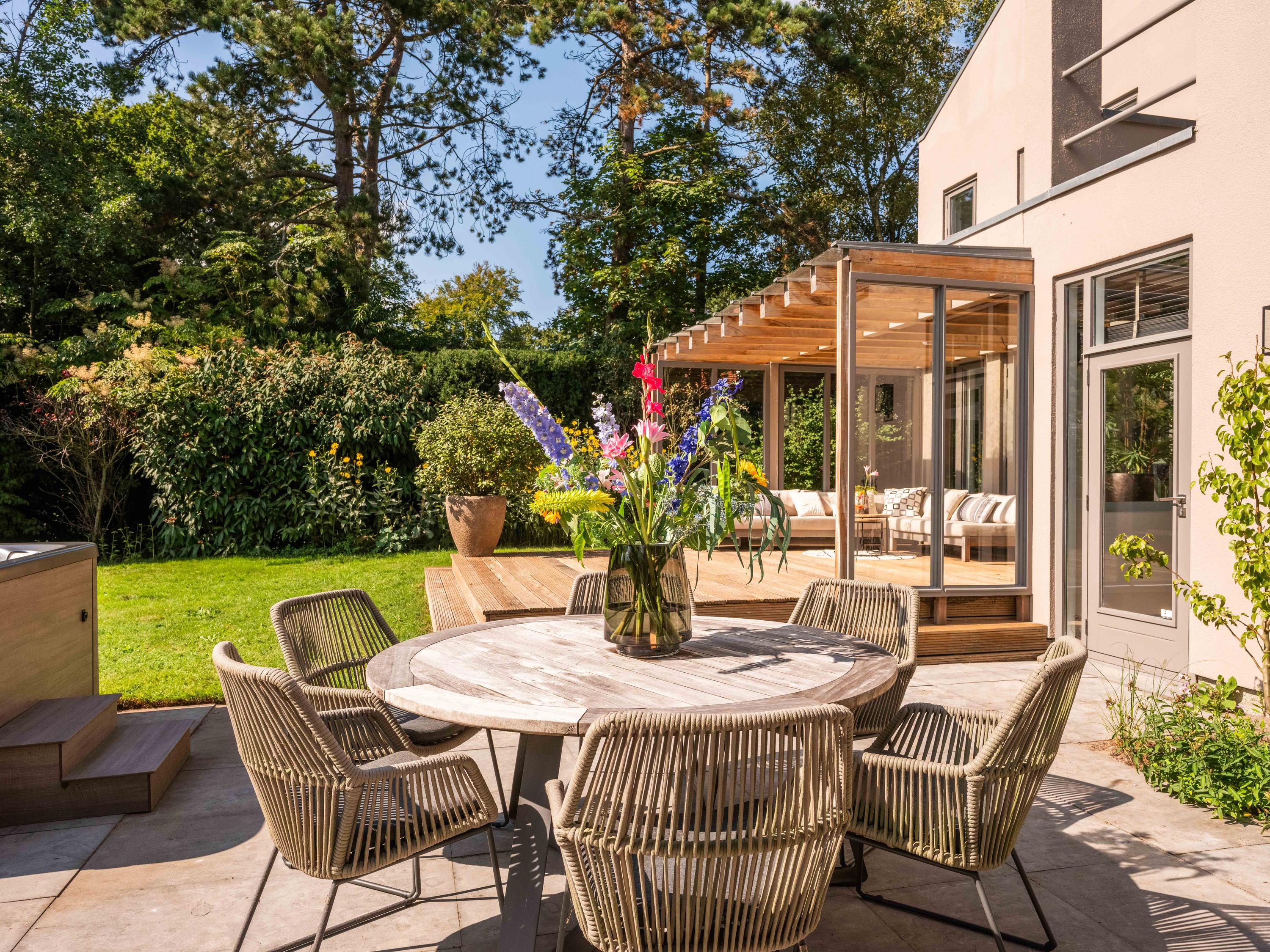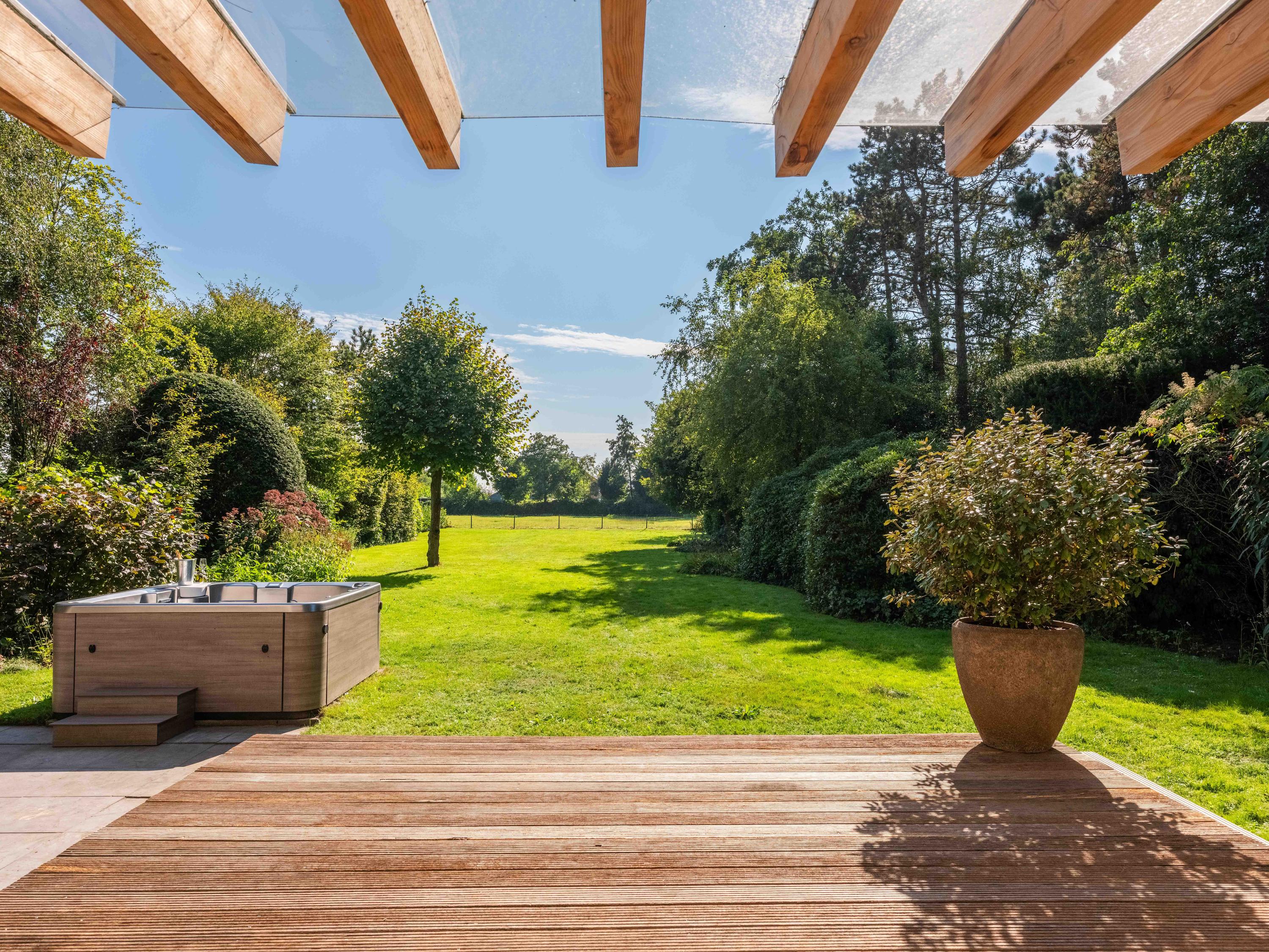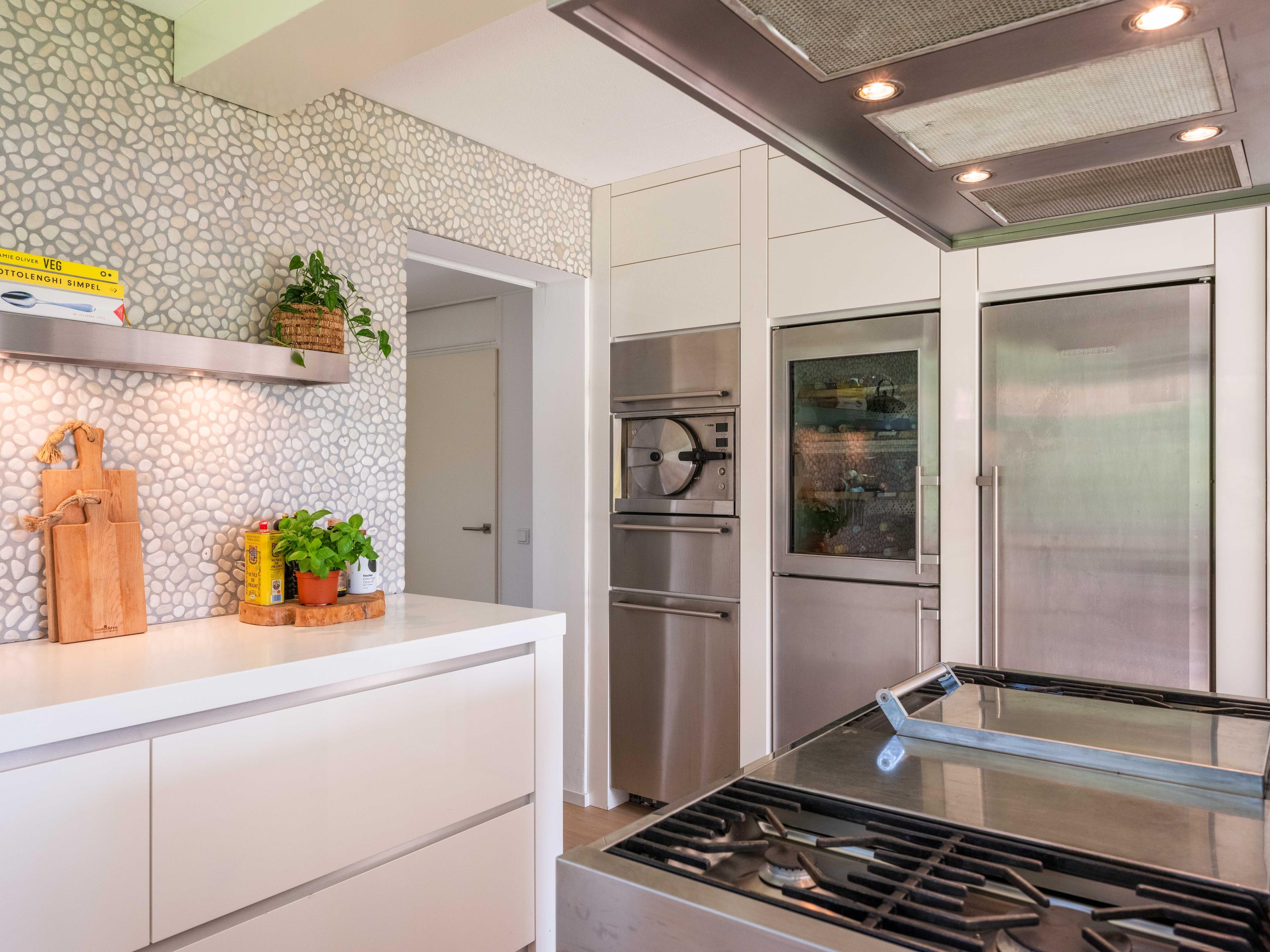 The modern open kitchen has an island where you can sit together. From here again a beautiful view of the greenery.French doors and a covered heated terrace bring the outside in.The kitchen is equipped with various appliances including a quooker, refrigerator, freezer, steam oven, wine cooler, warming drawer and dishwasher. Cooking is available on the large stove with 4 gas burners, a teppanyaki plate, deep fryer and double oven.