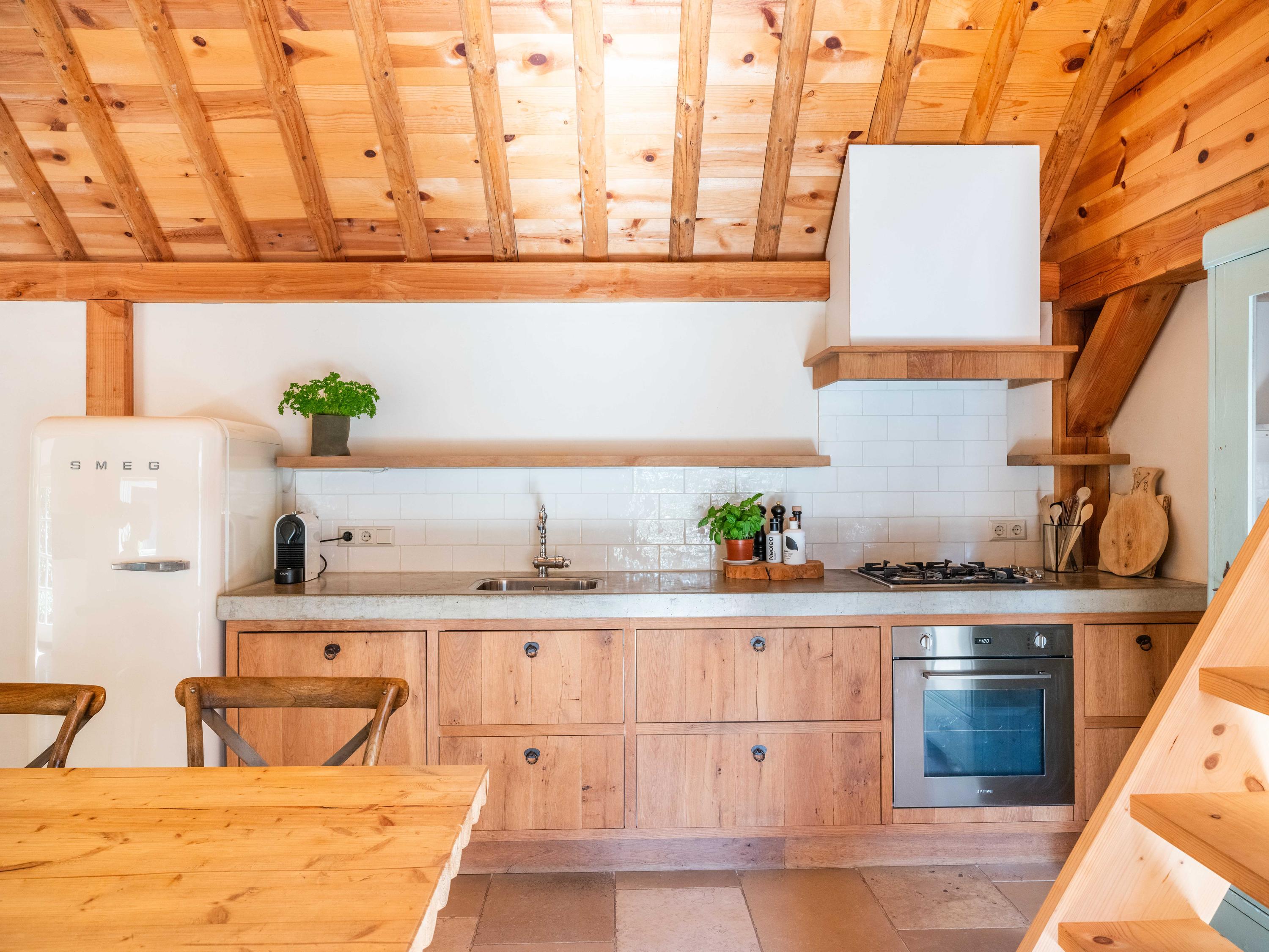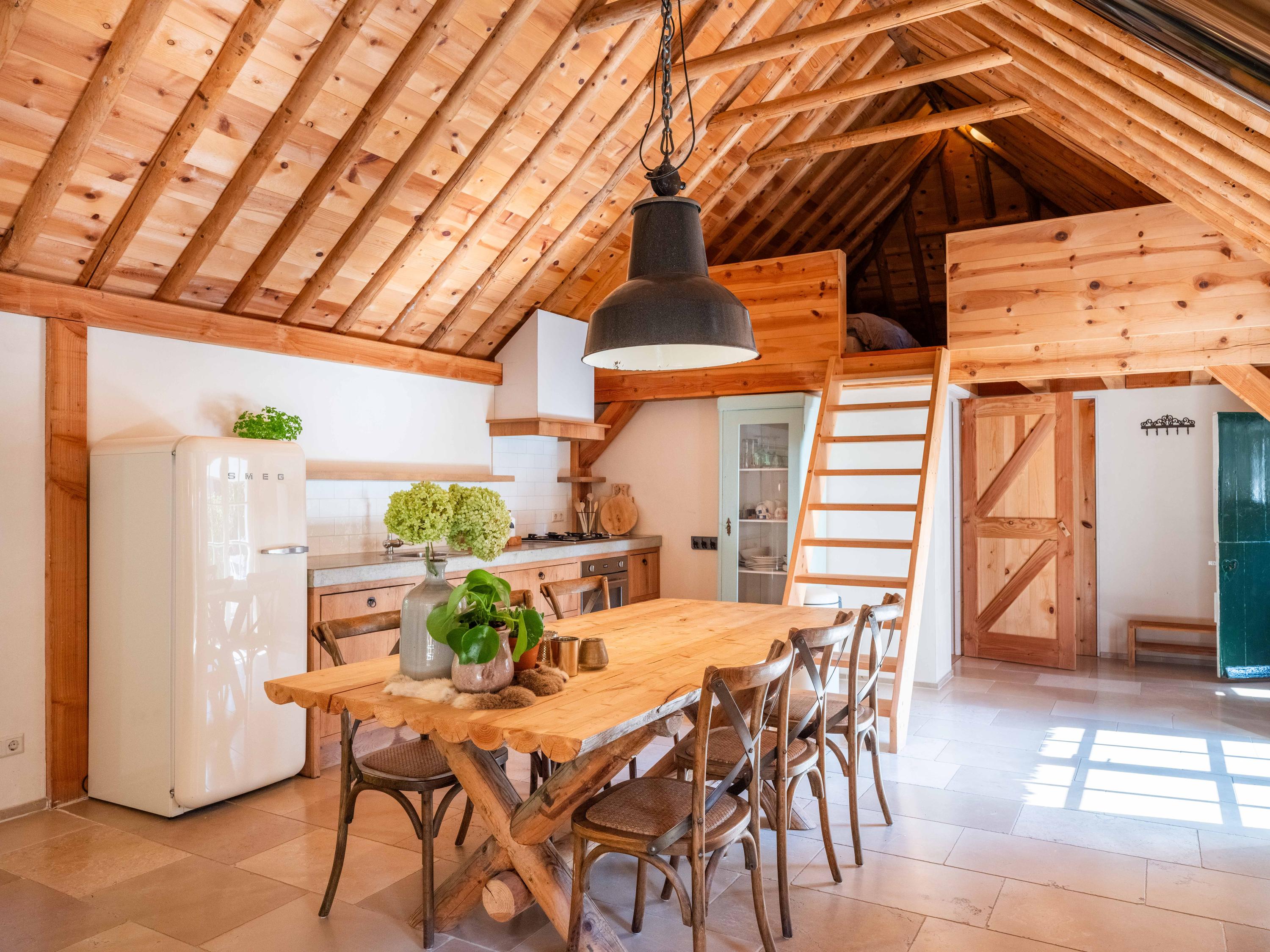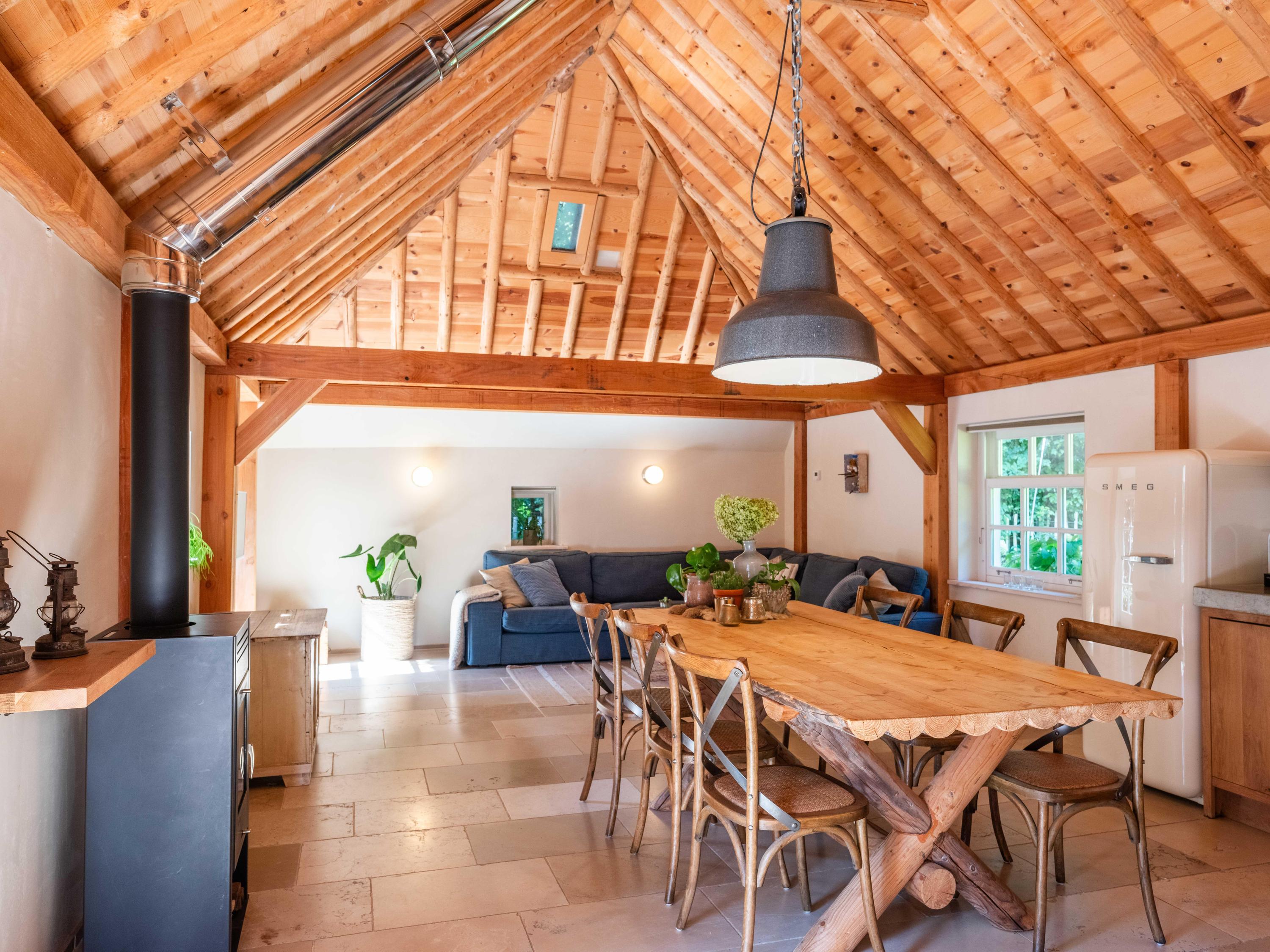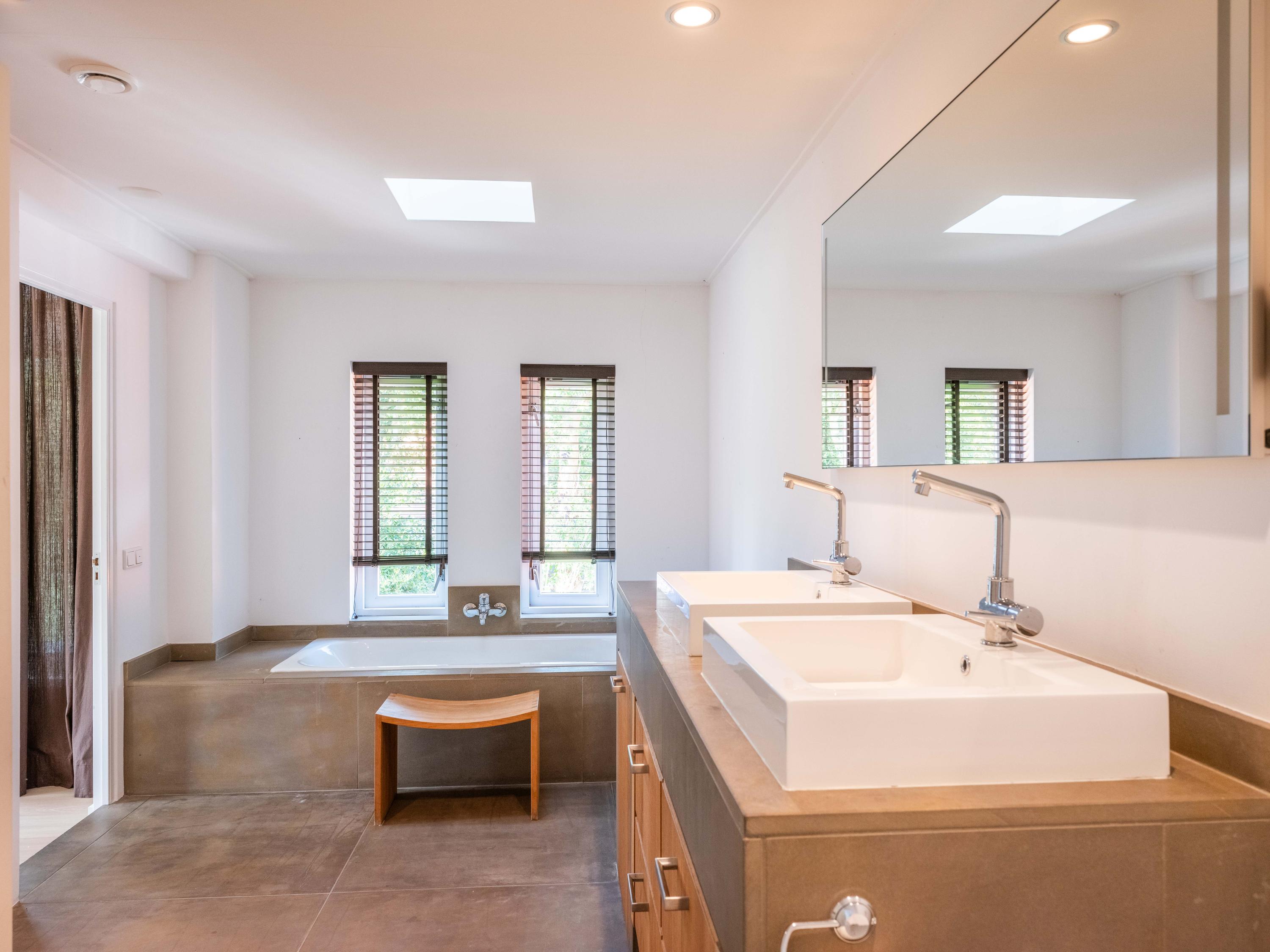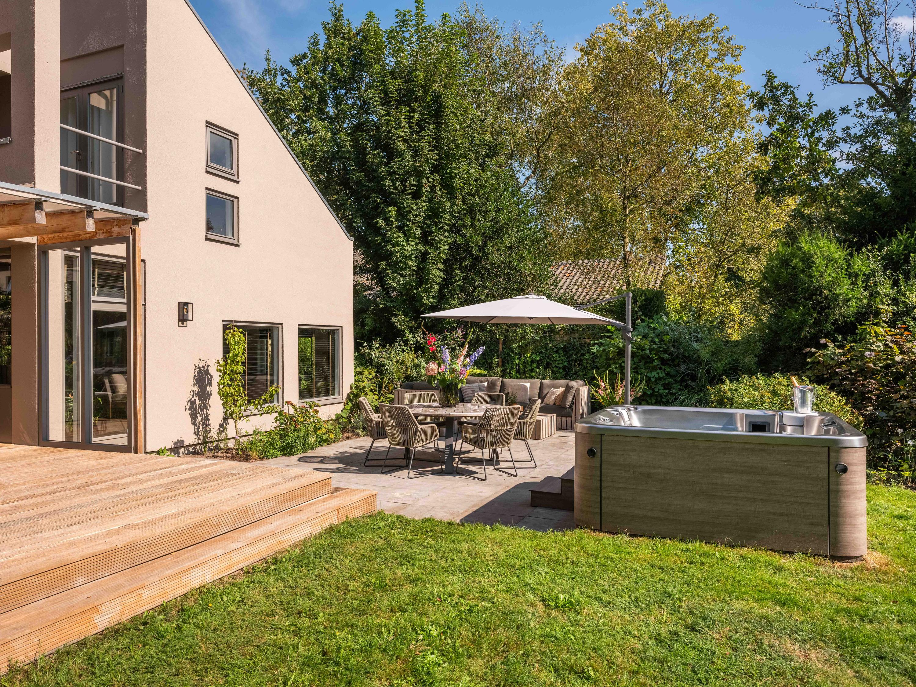 The modern open kitchen has an island where you can sit together. From here again a beautiful view of the greenery.French doors and a covered heated terrace bring the outside in.The kitchen is equipped with various appliances including a quooker, refrigerator, freezer, steam oven, wine cooler, warming drawer and dishwasher. Cooking is available on the large stove with 4 gas burners, a teppanyaki plate, deep fryer and double oven.