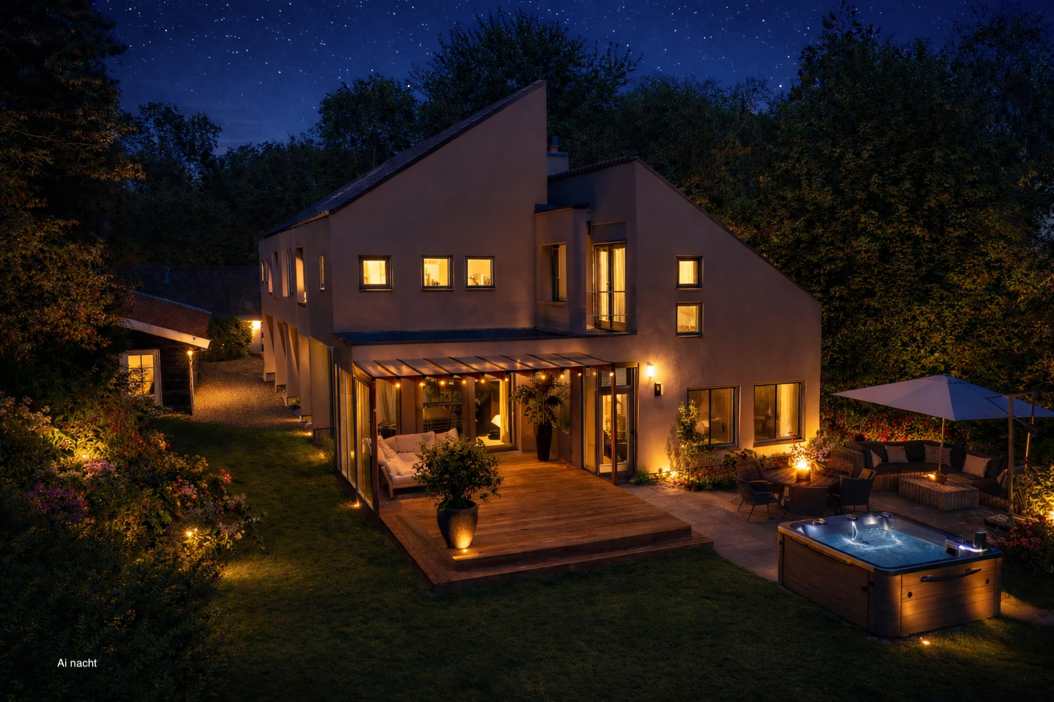 Next to the villa is a beautiful wooden carport for several cars, this carport runs into a workshop with water and electricity and is prepared for a wellness area.