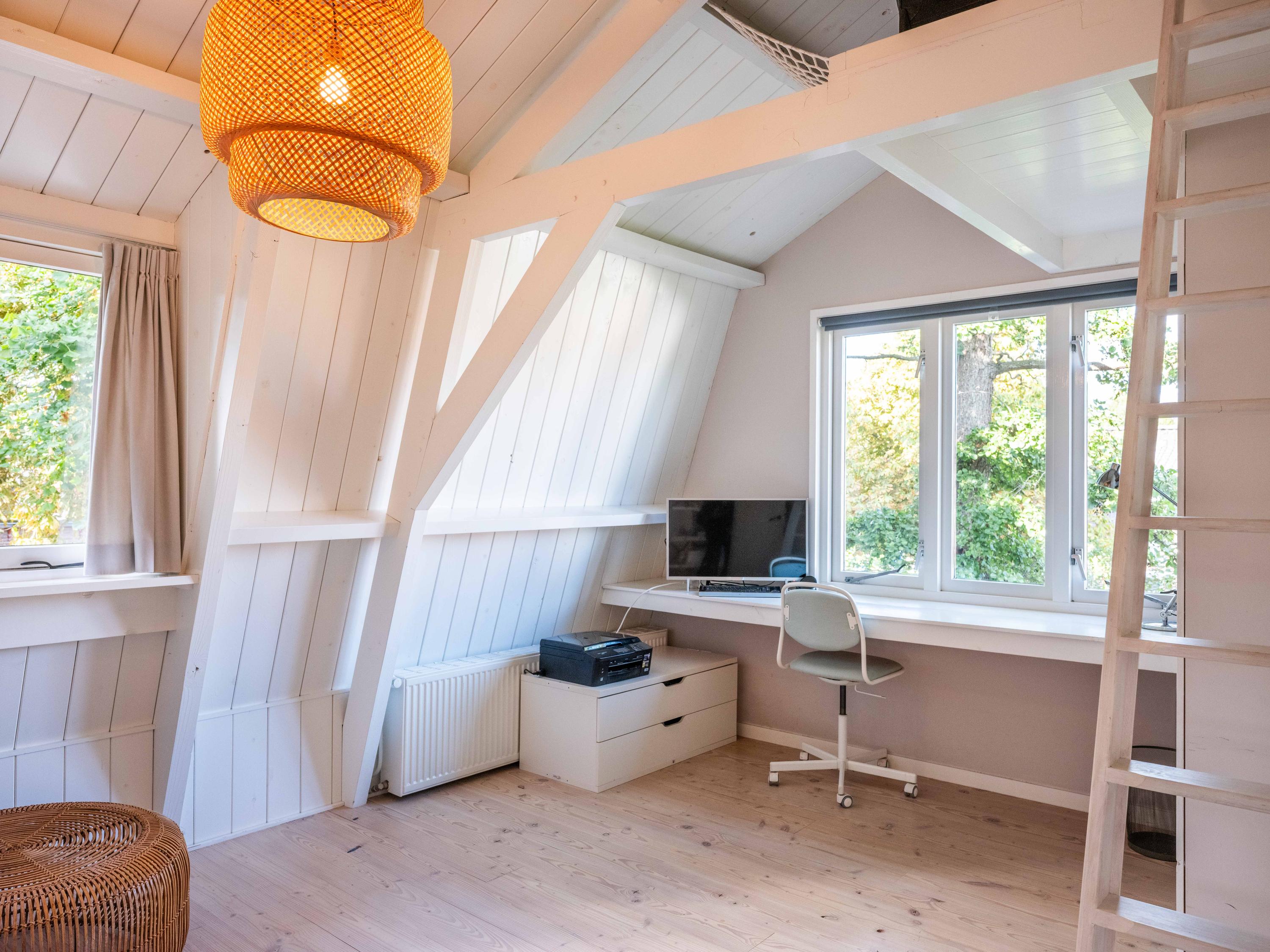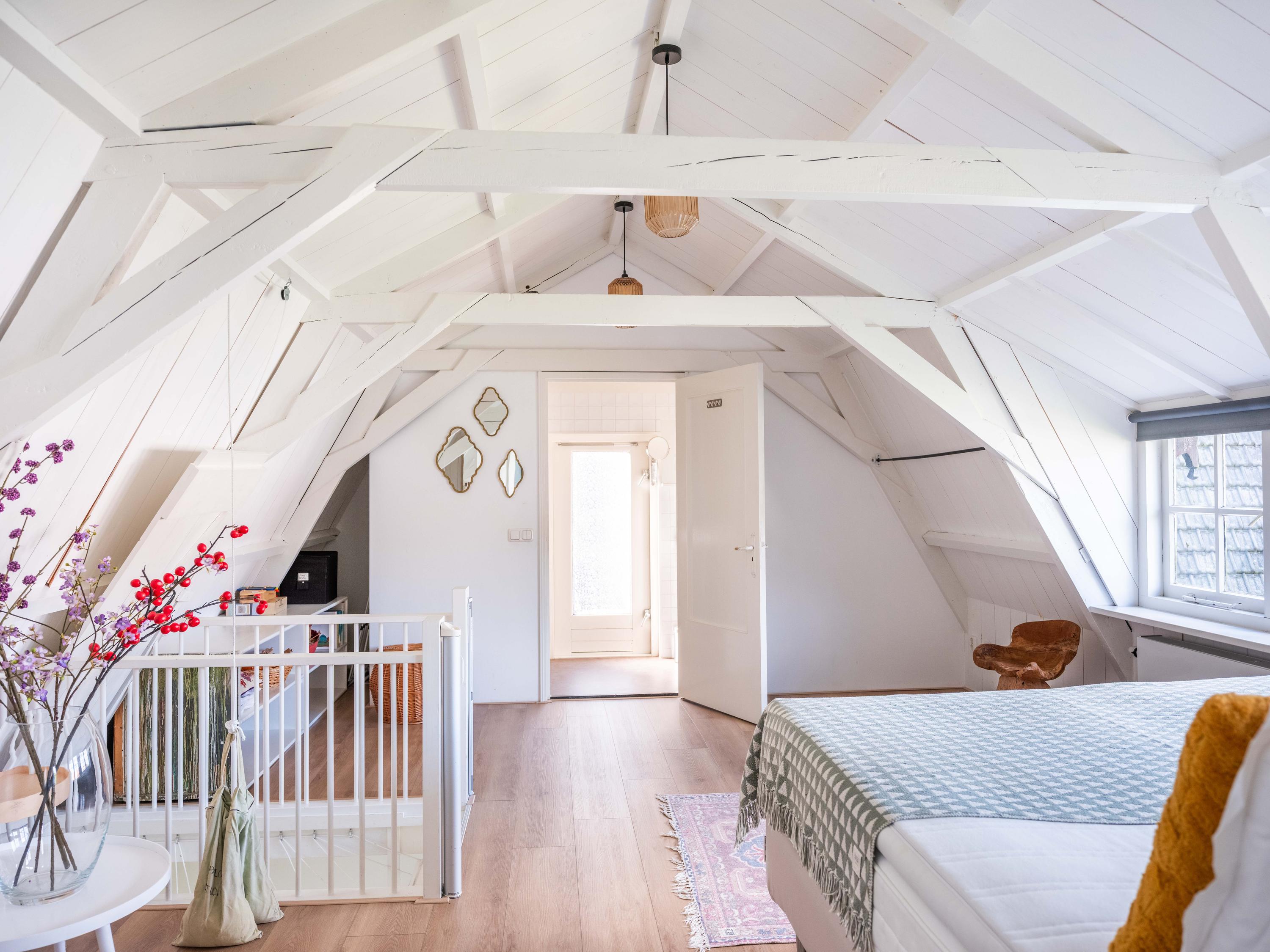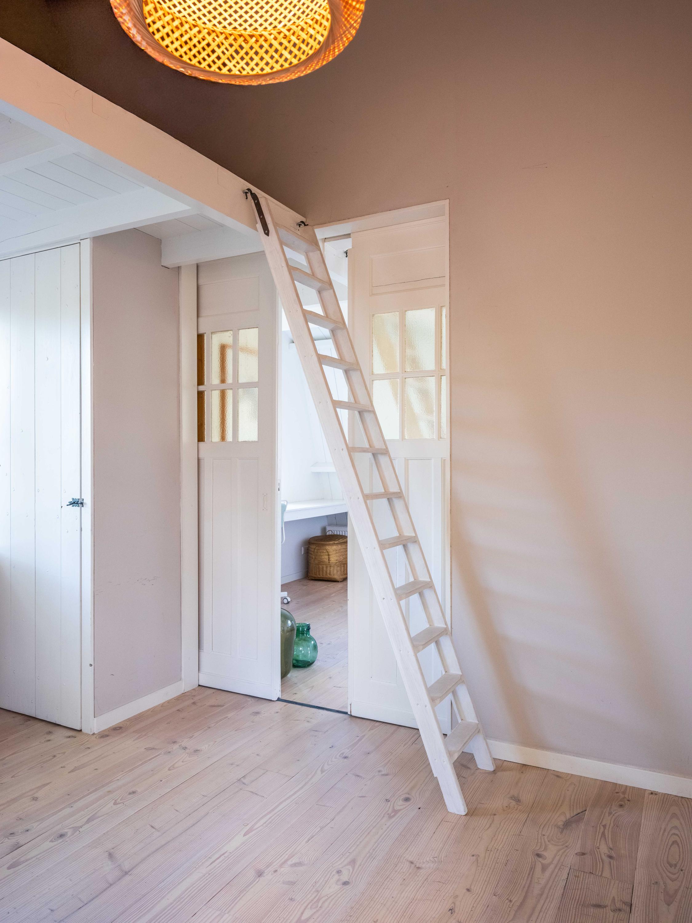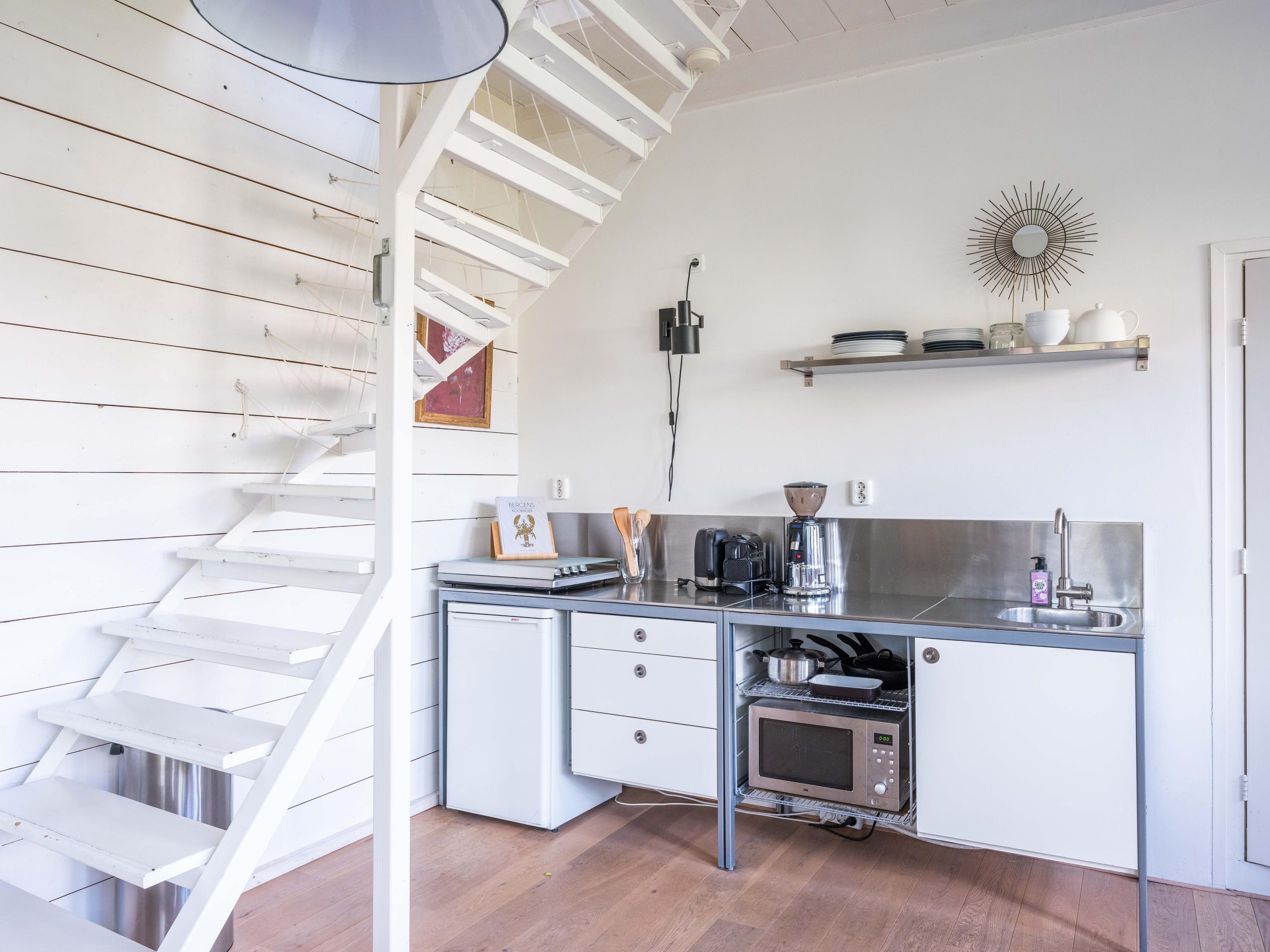 On the other side of the house, you will find the former atelier, now used as a guesthouse with a kitchenette and sleeping area. The roof has been insulated, and the upper floor is beautifully light and spacious.