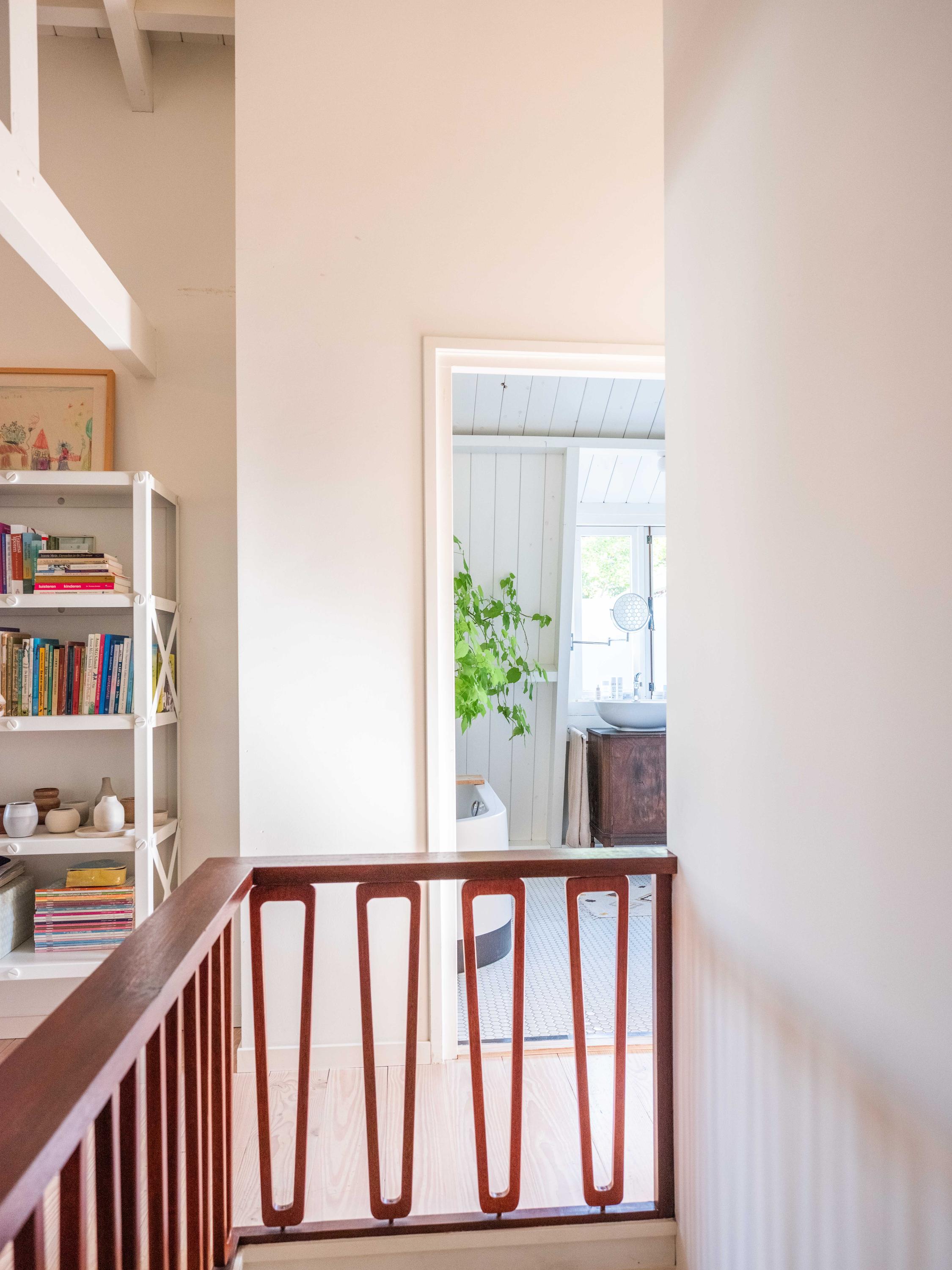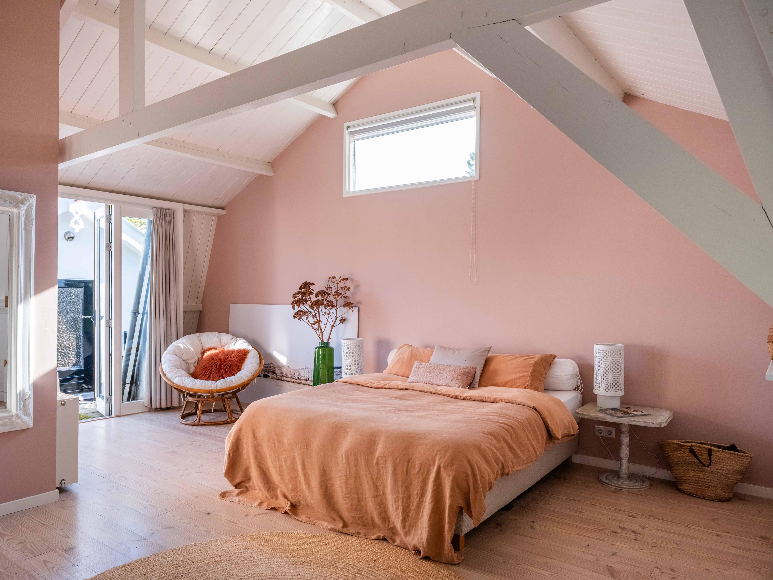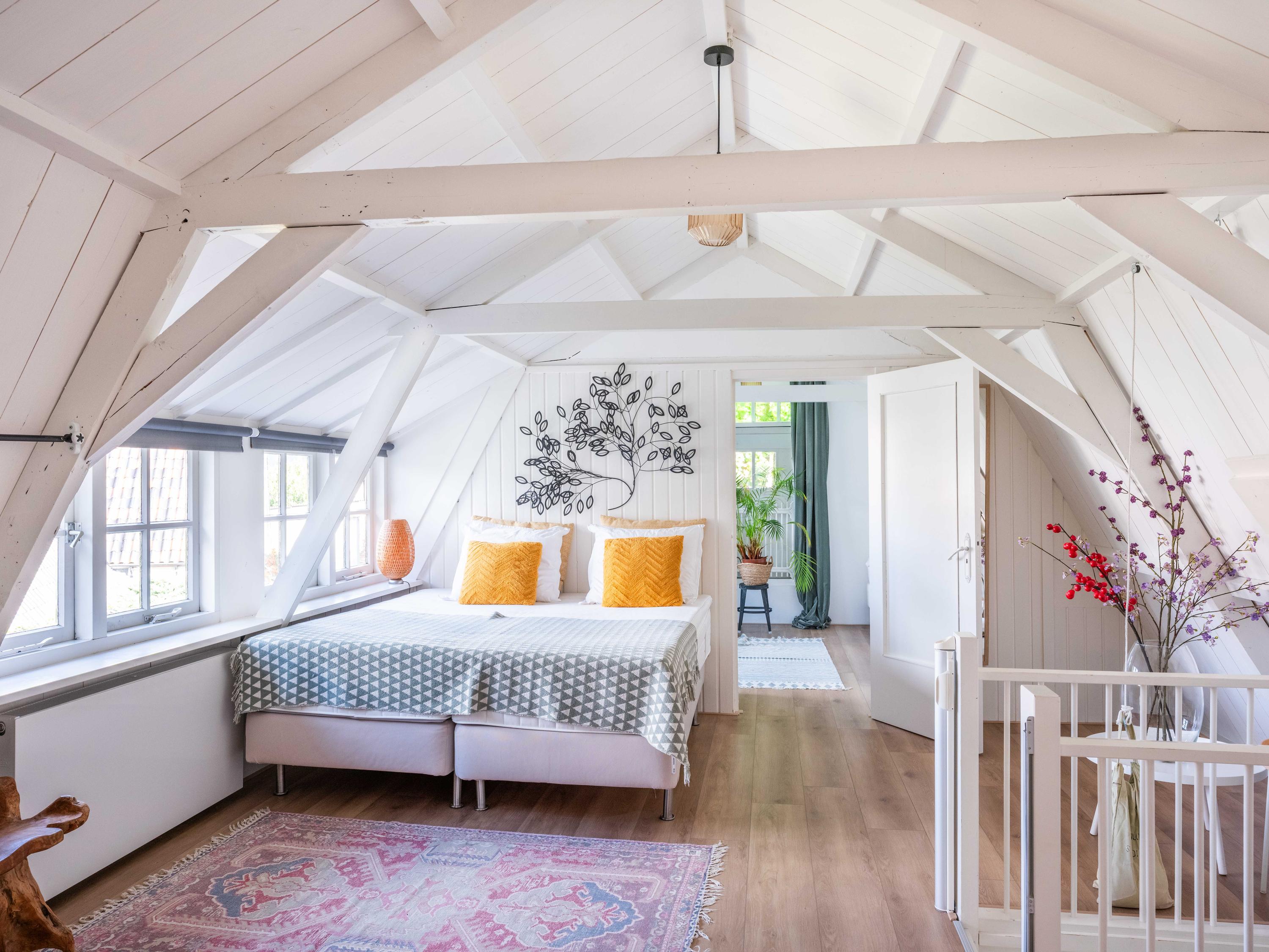 On the other side of the house, you will find the former atelier, now used as a guesthouse with a kitchenette and sleeping area. The roof has been insulated, and the upper floor is beautifully light and spacious.