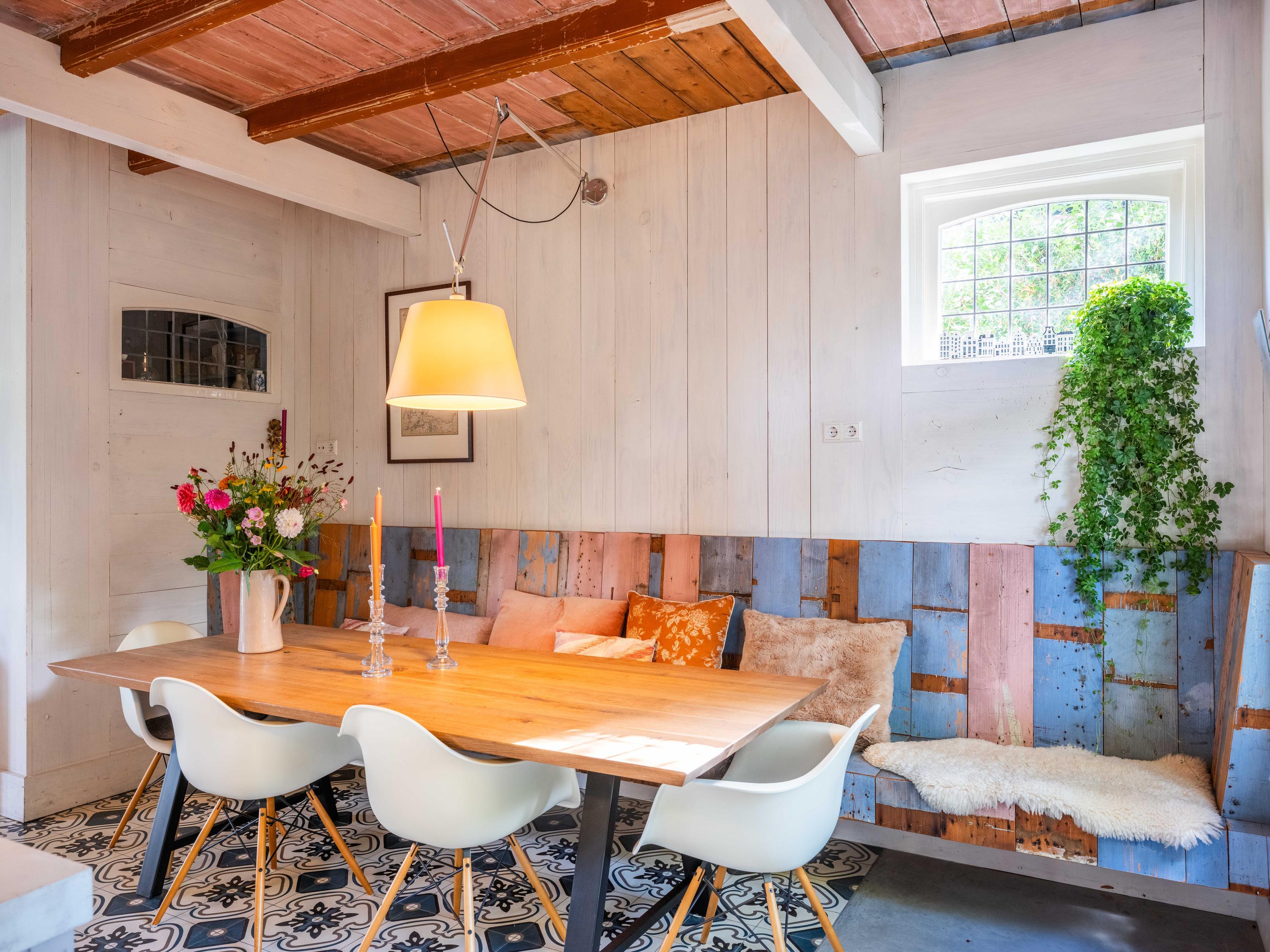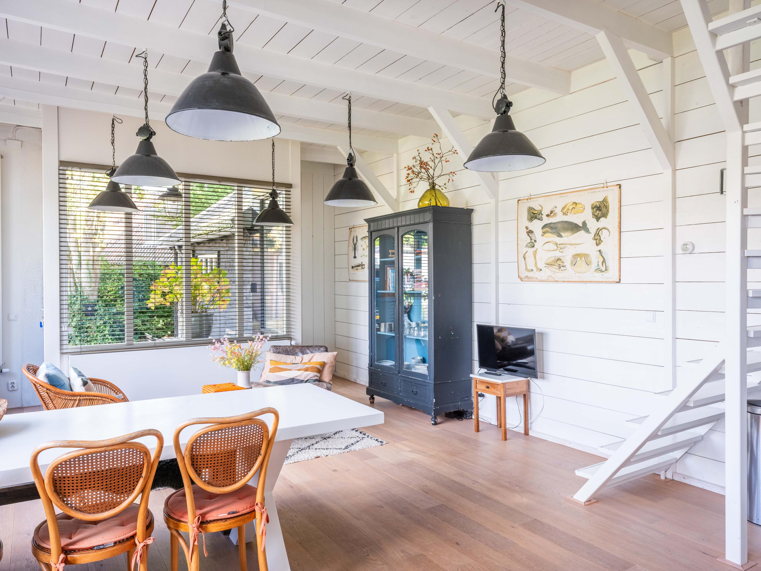 Adjacent to the kitchen is the cozy living room with a wood-burning stove, windows on all sides, and French doors leading to the garden. The wooden details and warm atmosphere make this an inviting place to relax—whether in winter by the fireplace or in summer with the doors open to the garden. A practical storage cupboard can be found under the stairs.