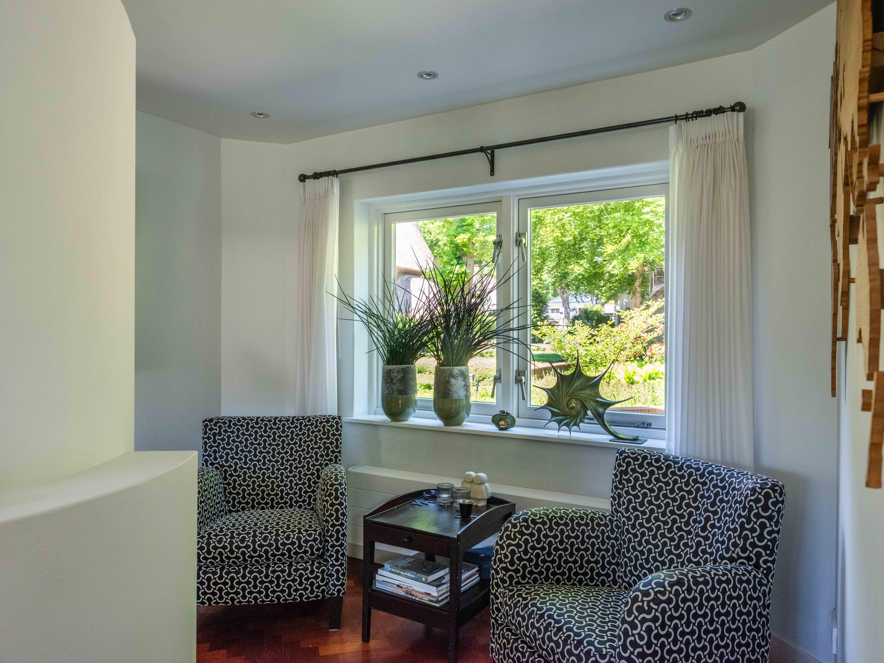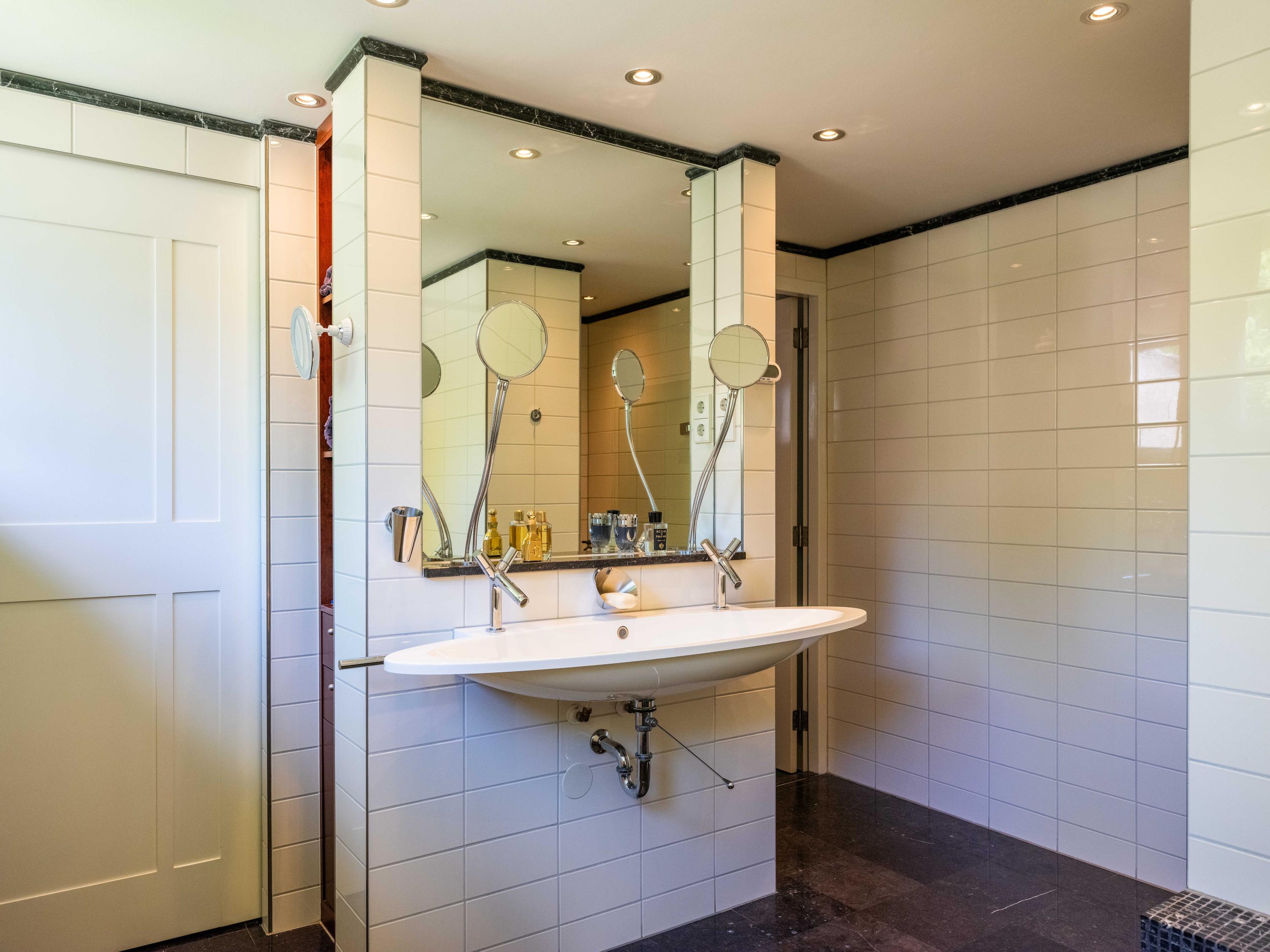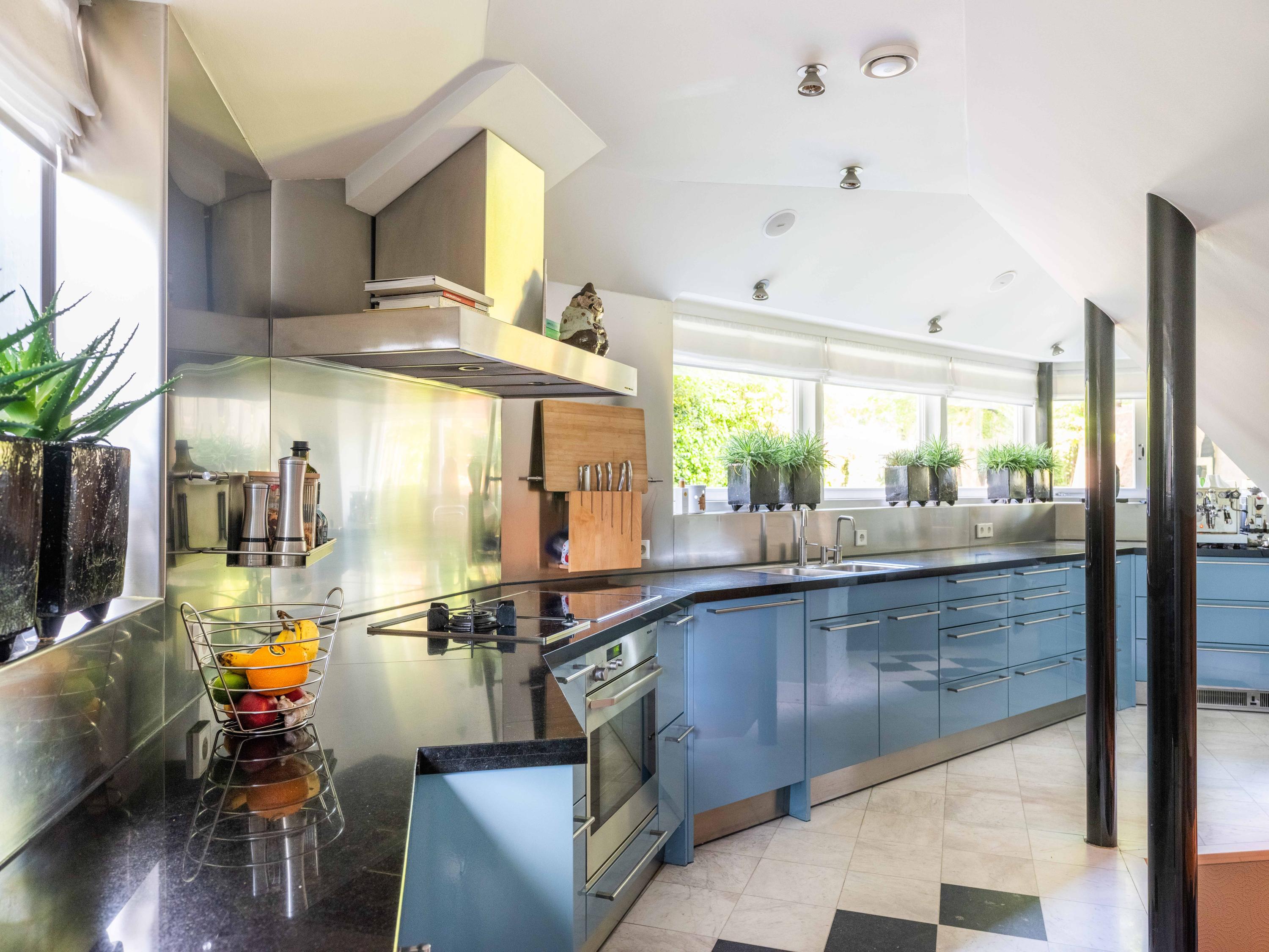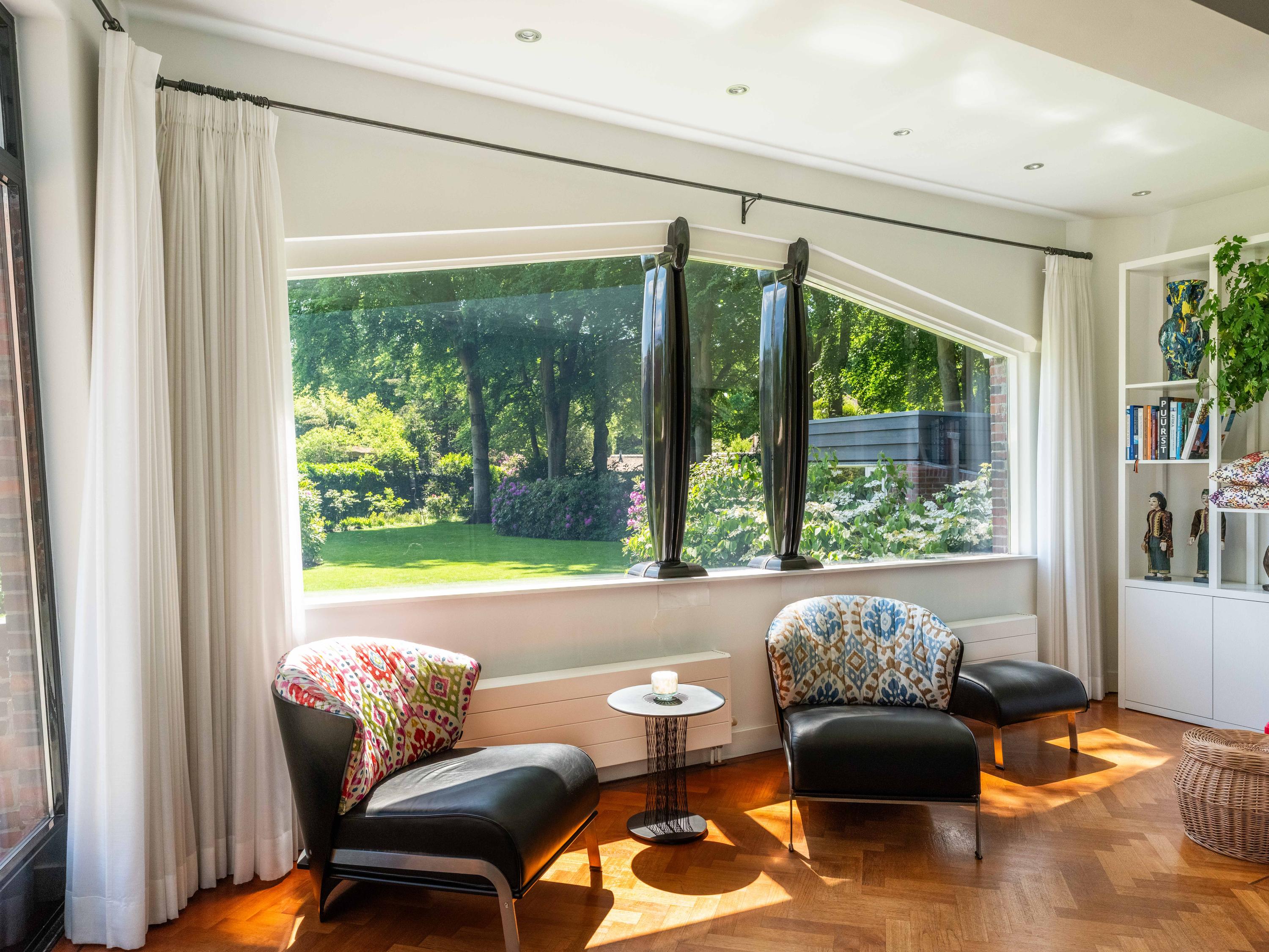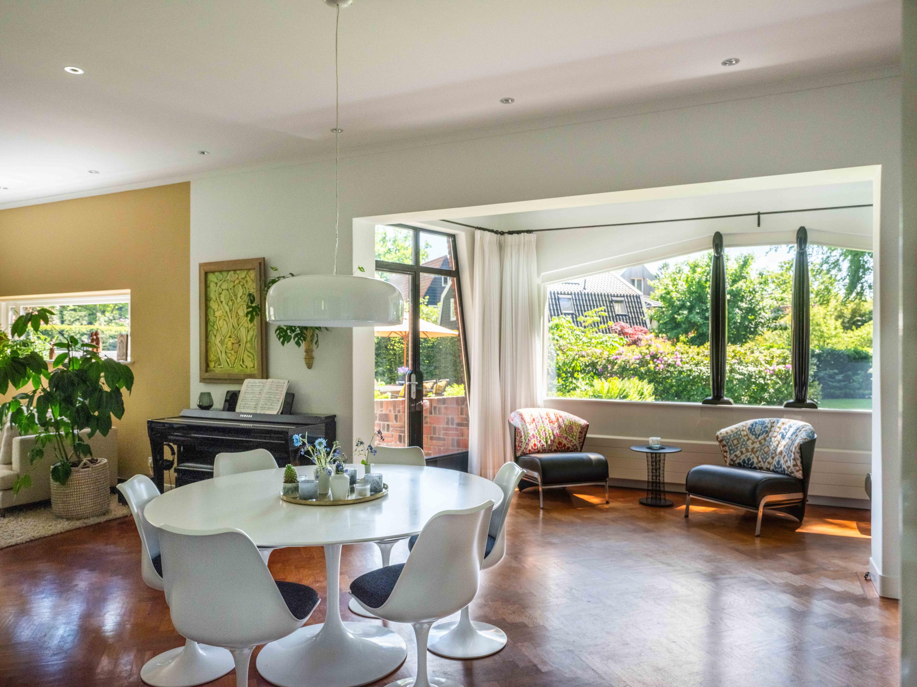 French doors lead to the spacious living room with fireplace, a dining area and conservatory. A striking feature is the raised section, known as the ‘wheelhouse’, which has monumental value. A beautiful parquet floor with piping, the rounded shapes of the fireplace, the ‘compass balls’ near the raised section and the trapezoidal window with columns give the whole a special appearance.