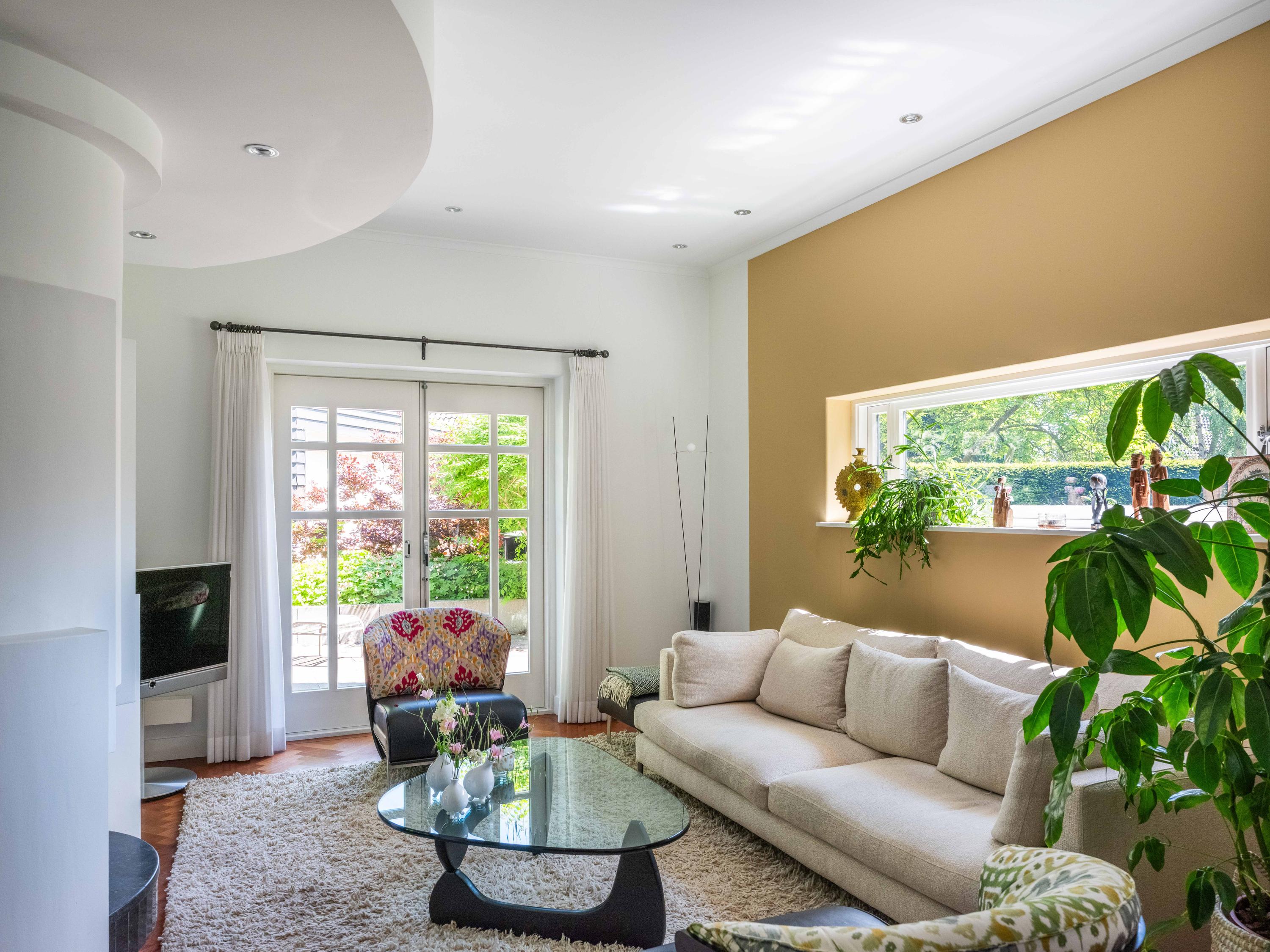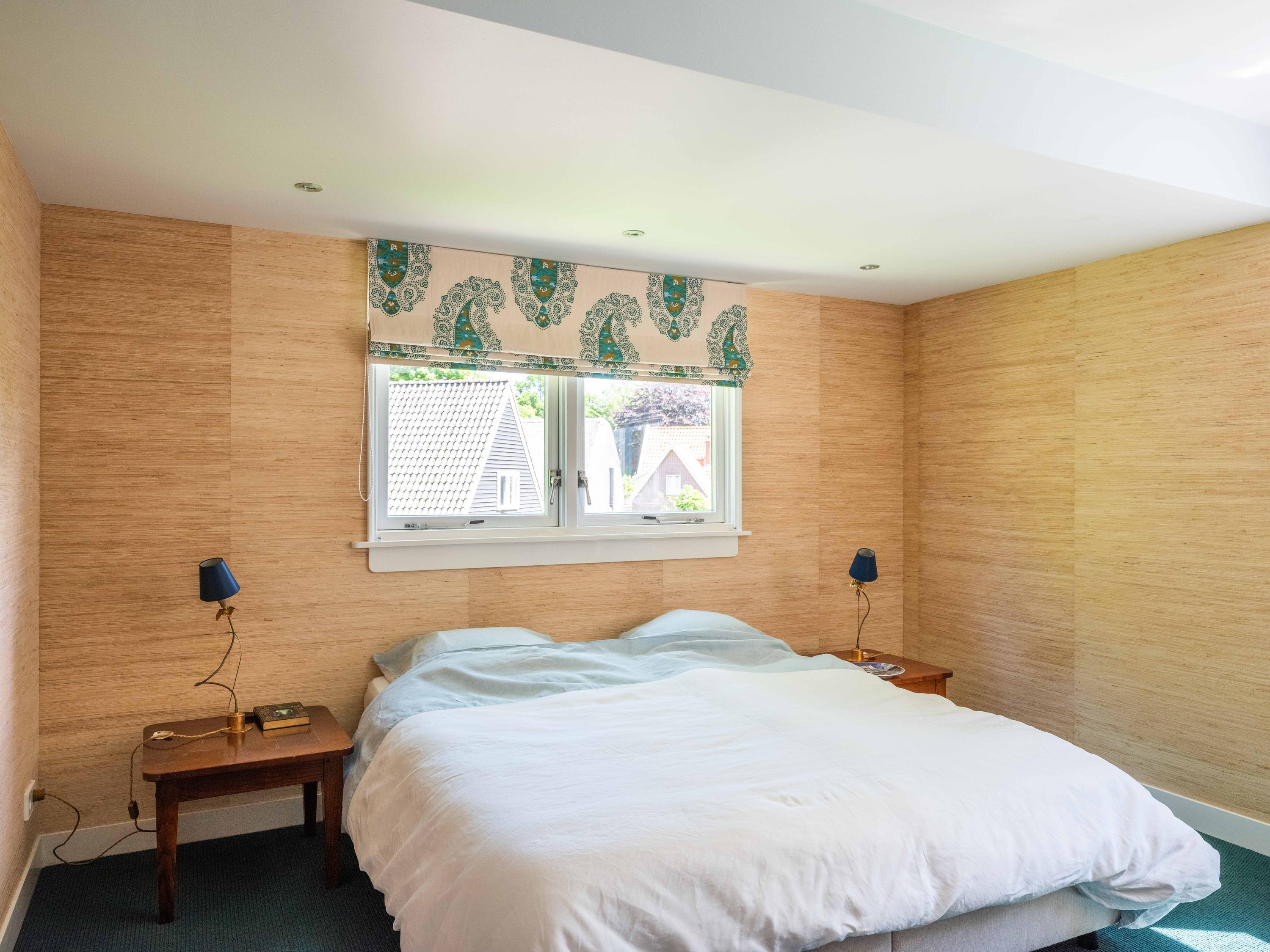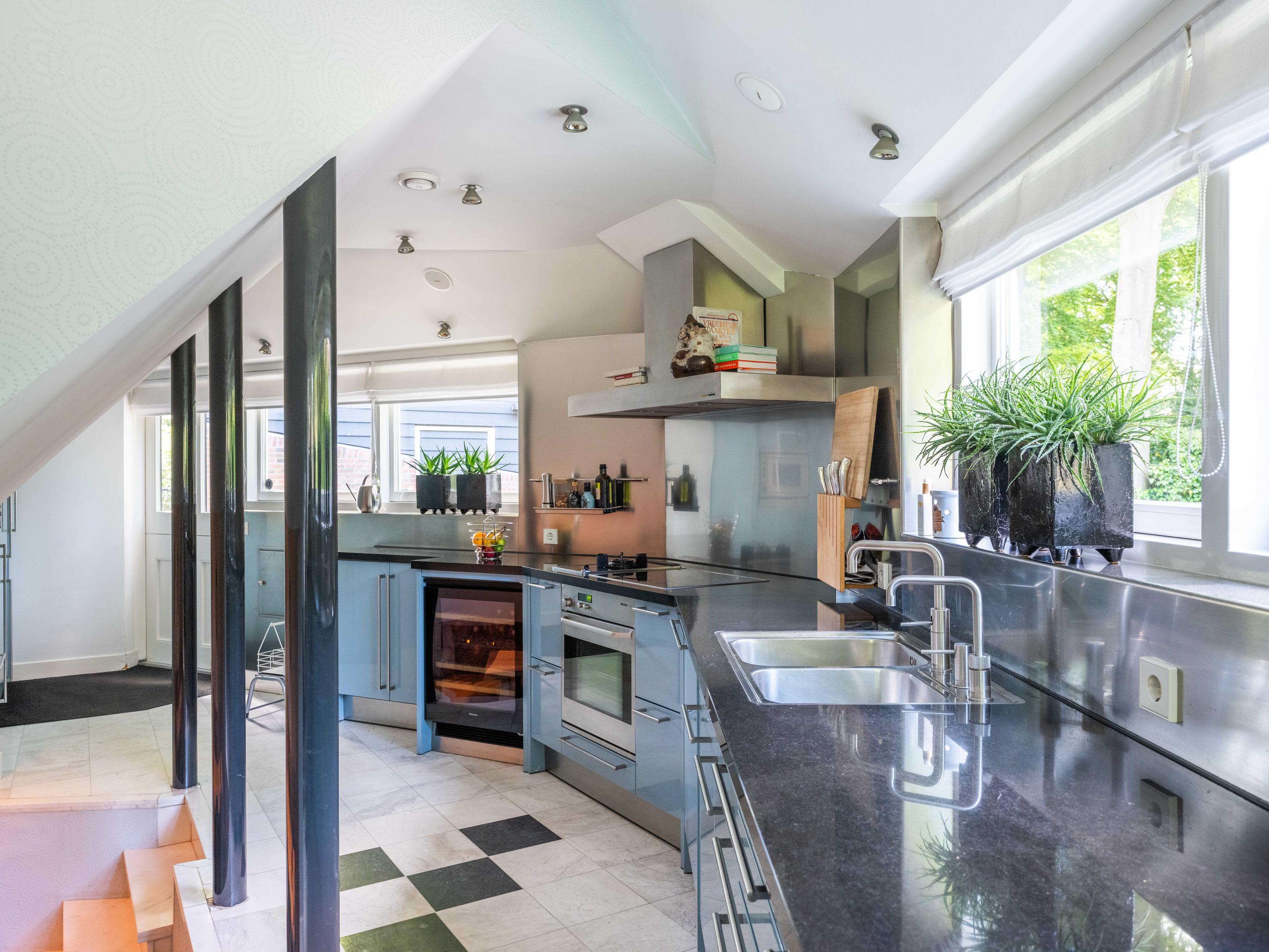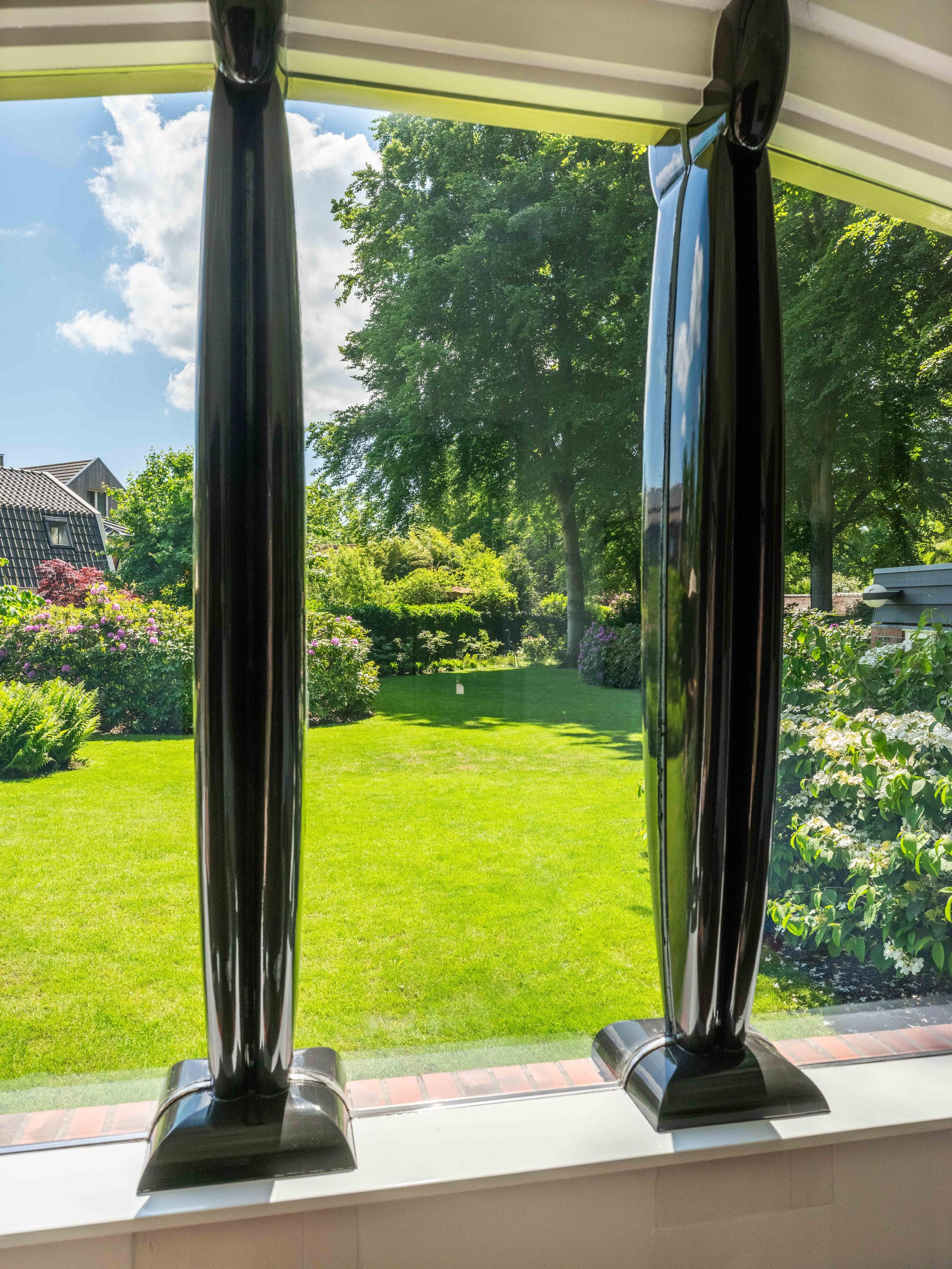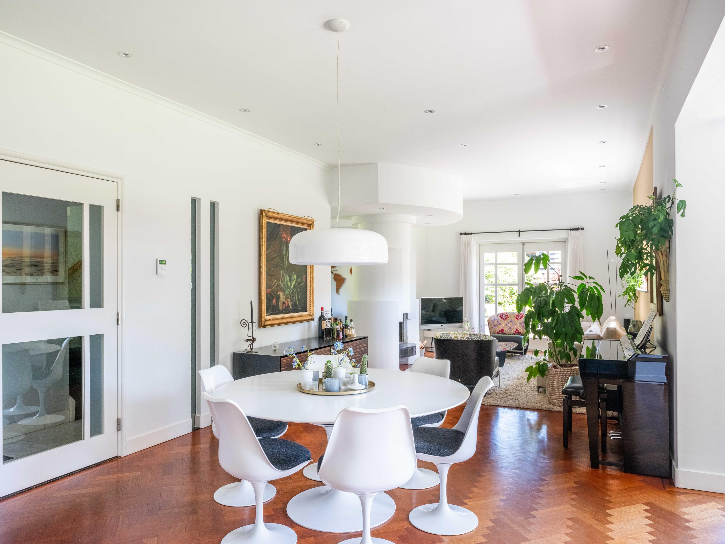 French doors lead to the spacious living room with fireplace, a dining area and conservatory. A striking feature is the raised section, known as the ‘wheelhouse’, which has monumental value. A beautiful parquet floor with piping, the rounded shapes of the fireplace, the ‘compass balls’ near the raised section and the trapezoidal window with columns give the whole a special appearance.