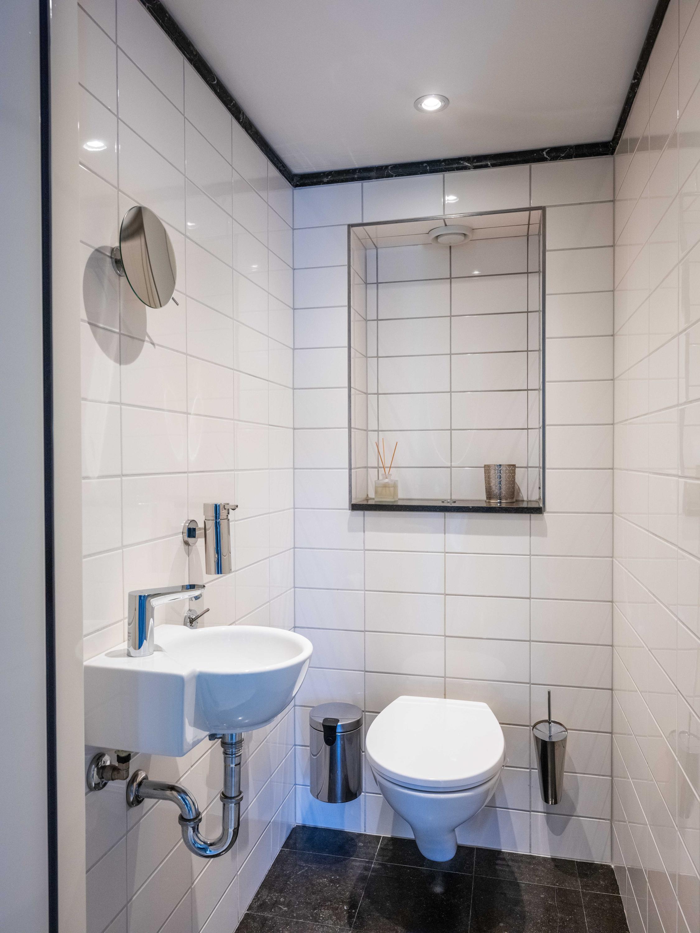 A winding path between beautifully shaped privet hedges leads to the hidden front door. Through the entrance, one enters the hall with a cloakroom, the stairs to the upper floor and a toilet.