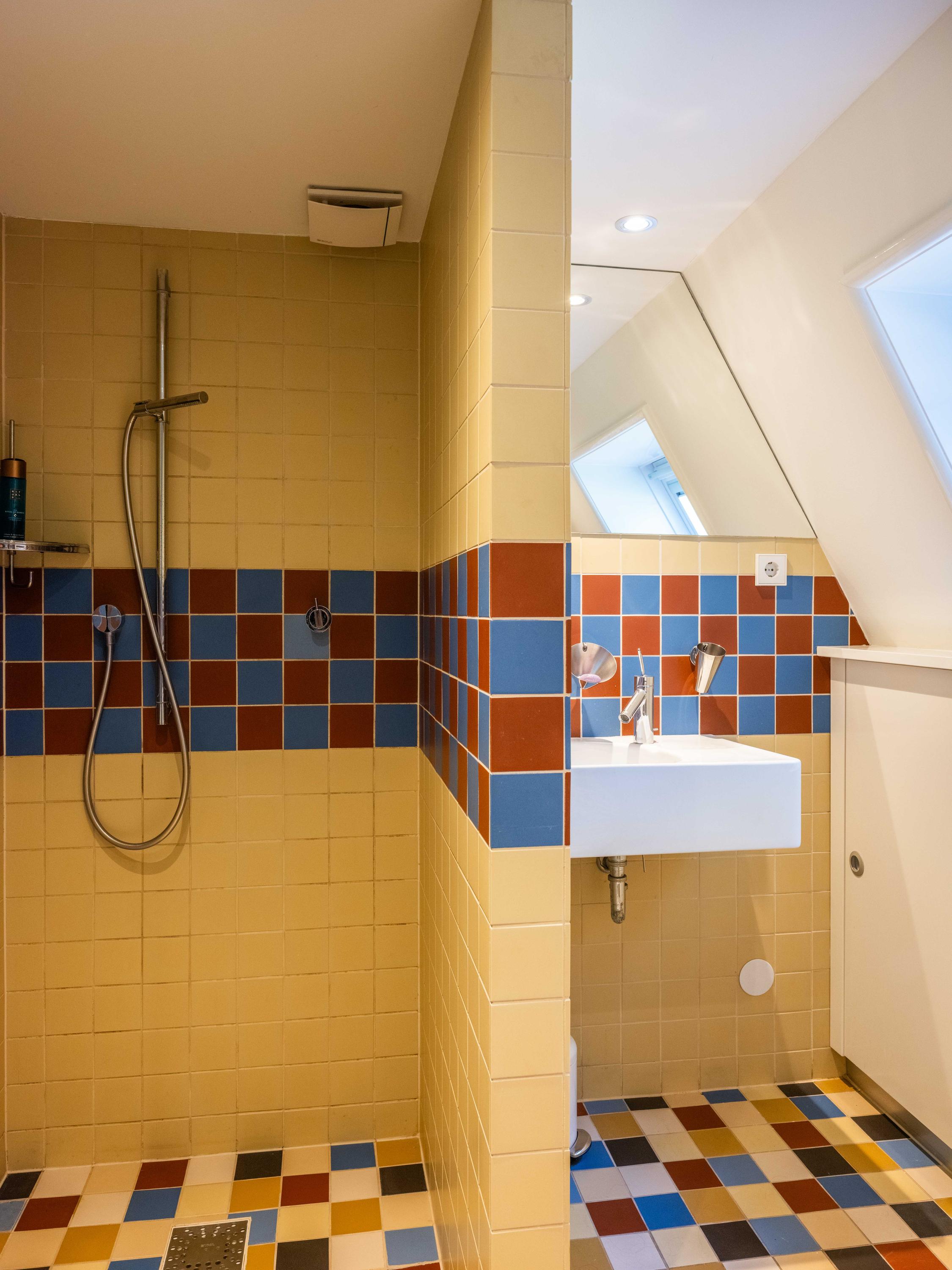 The staircase with Amsterdam School ornaments and beautiful stained-glass windows leads to the first floor. Here are three spacious bedrooms, including the master bedroom with a gas fireplace, walk-in closet and a balcony overlooking the green garden and monumental trees. Also located on the landing, a few steps lower, is a separate toilet and a spacious bathroom with a bathtub, shower, wide sink and space for a washing machine and dryer.