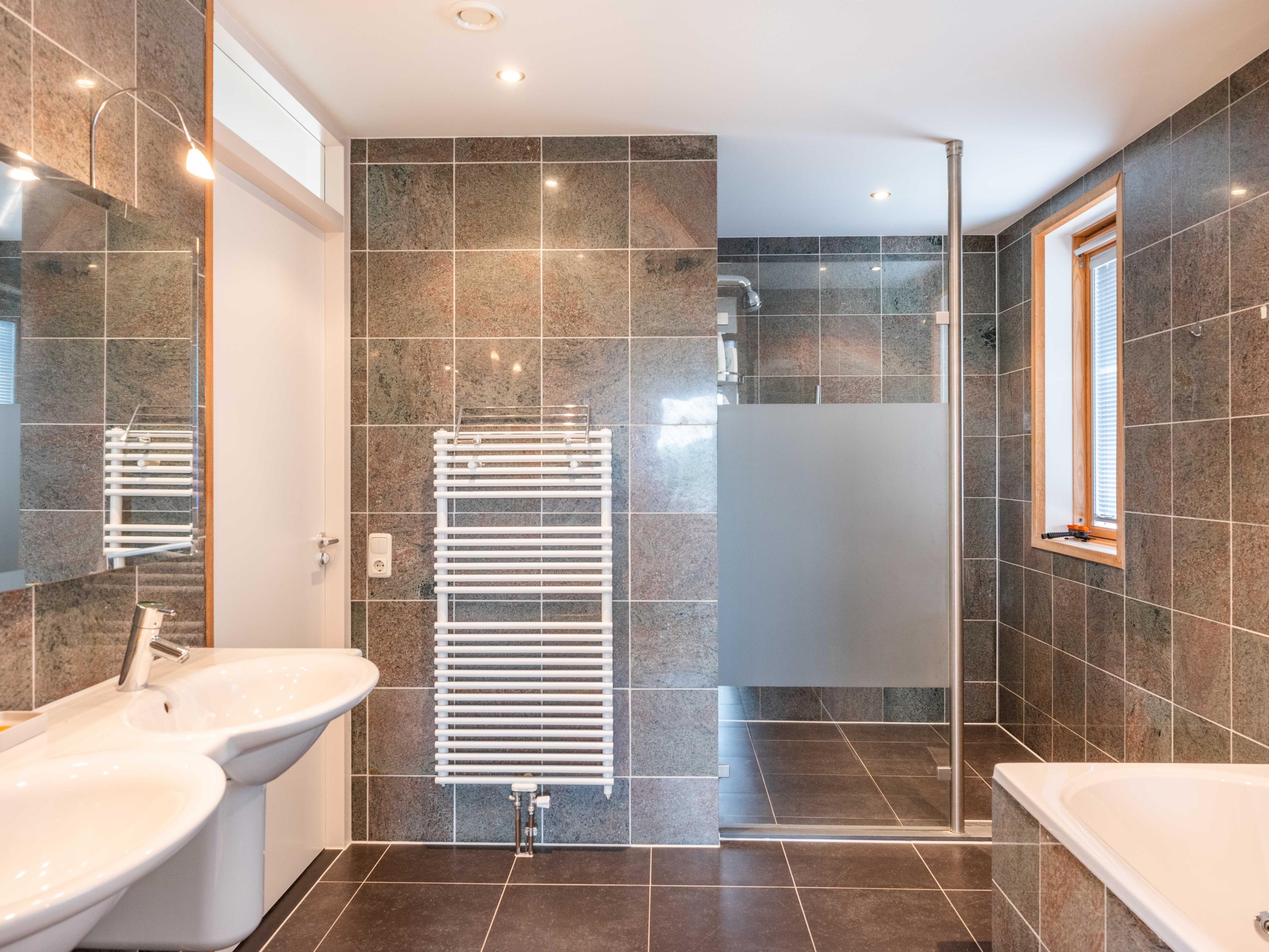 The staircase leads to the first floor, where you will find two spacious bedrooms, both with closet space, and the second bathroom. This luxurious bathroom is equipped with a bathtub, double sink and a walk-in shower. From the rear bedroom, access to the private south-facing balcony.
