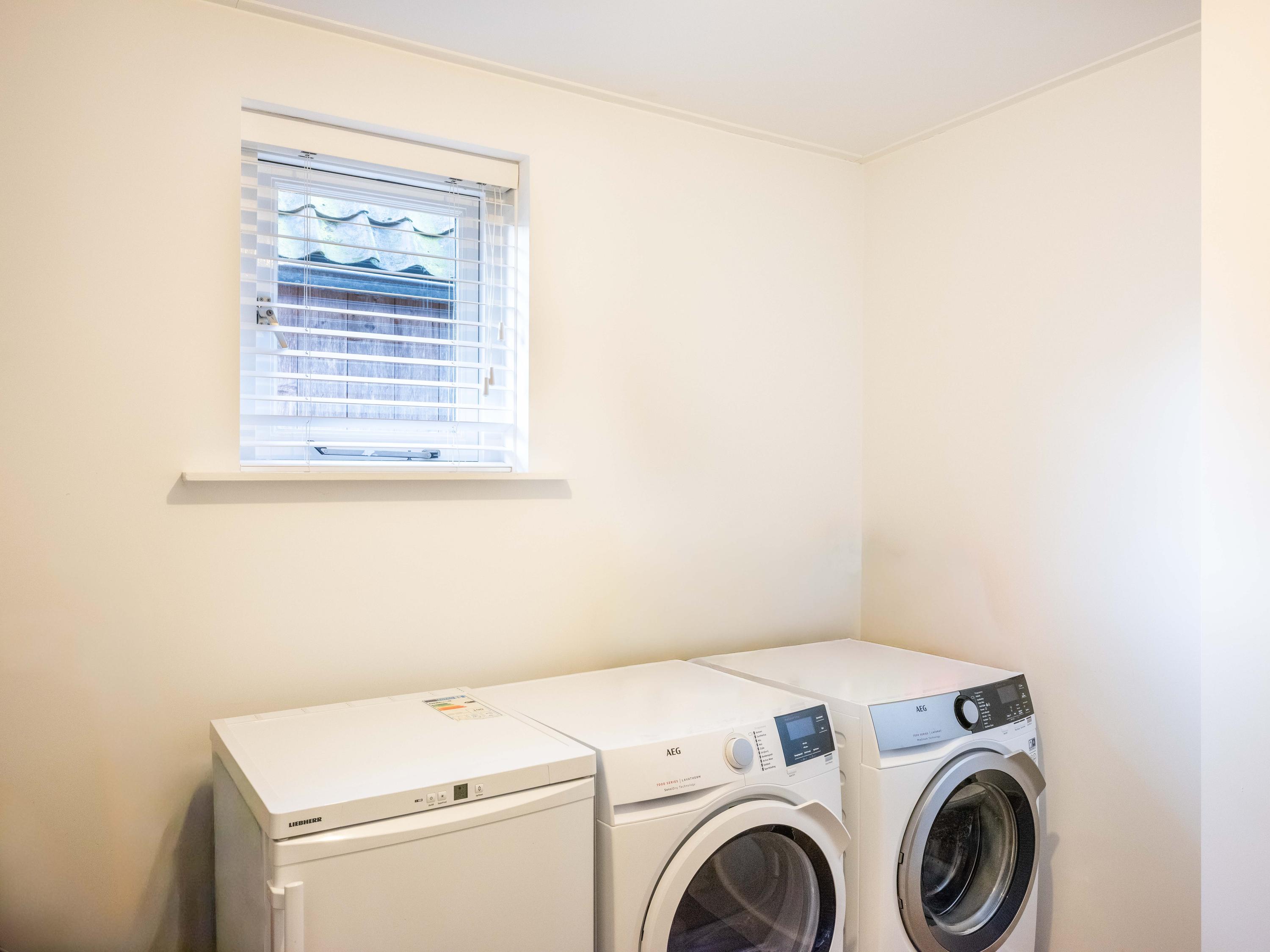 The house is surrounded by a beautifully landscaped garden with natural fencing, offering plenty of privacy. The total plot officially measures 537 m2. At the front is a spacious driveway with parking for several cars. A detached storage shed has a covered carport. The garden borders a municipal park – a location that gives a unique feeling of space and freedom, while the center of Bergen is only a few minutes away.