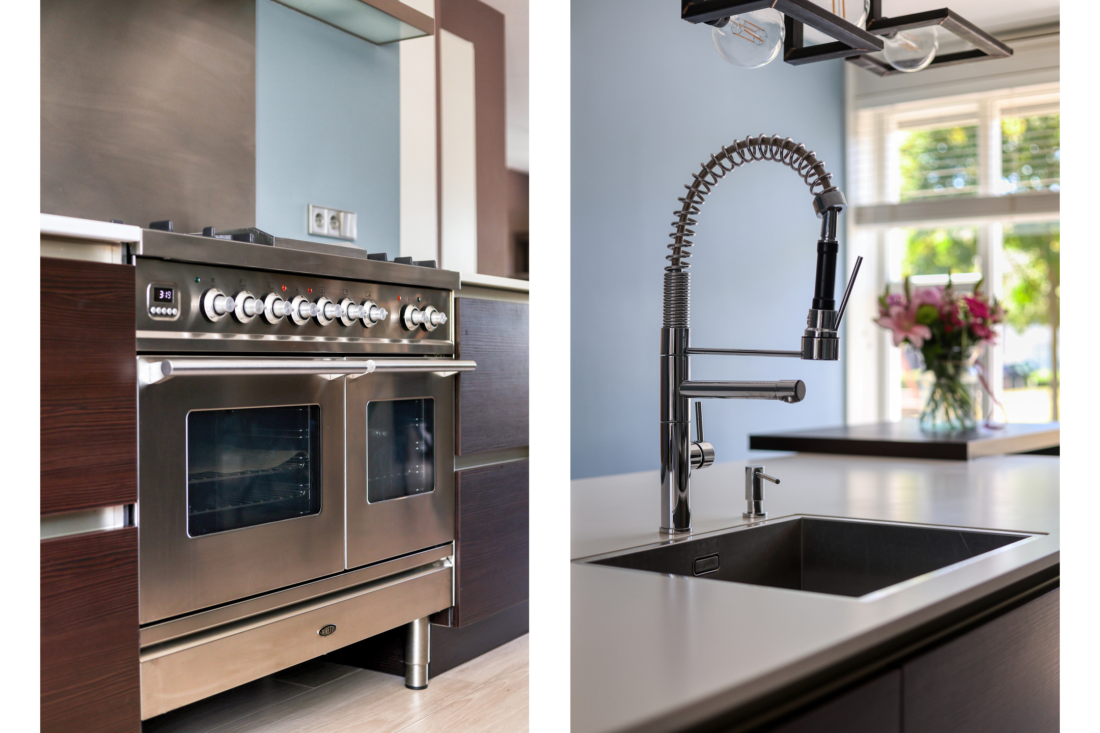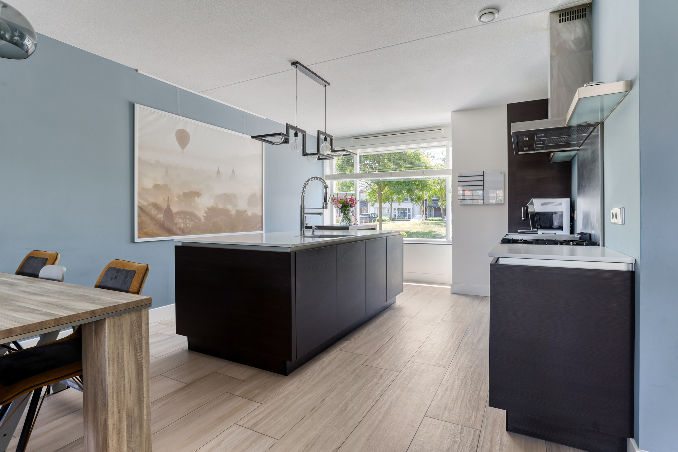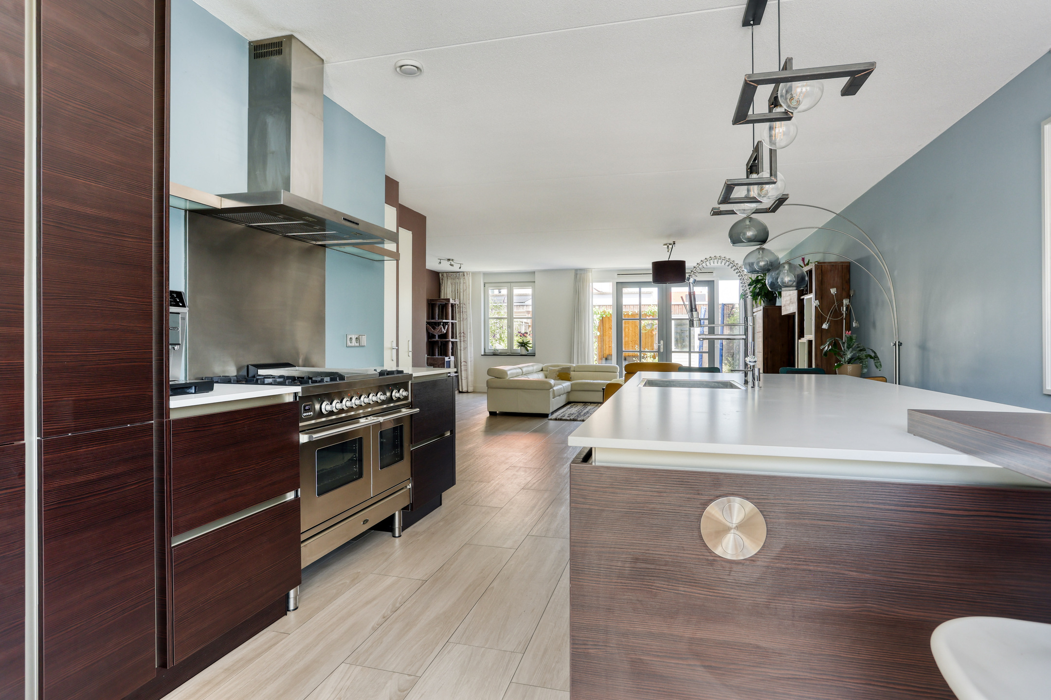 At the front of the house, you’ll find the luxurious open kitchen, equipped with a large sink island, a five-burner gas stove, double (Boretti) oven, extractor hood, dishwasher, tall pantry cabinet, fridge/freezer combination, and a cozy coffee bar. The windows are fitted with screens and insect screens, ideal for summer days.