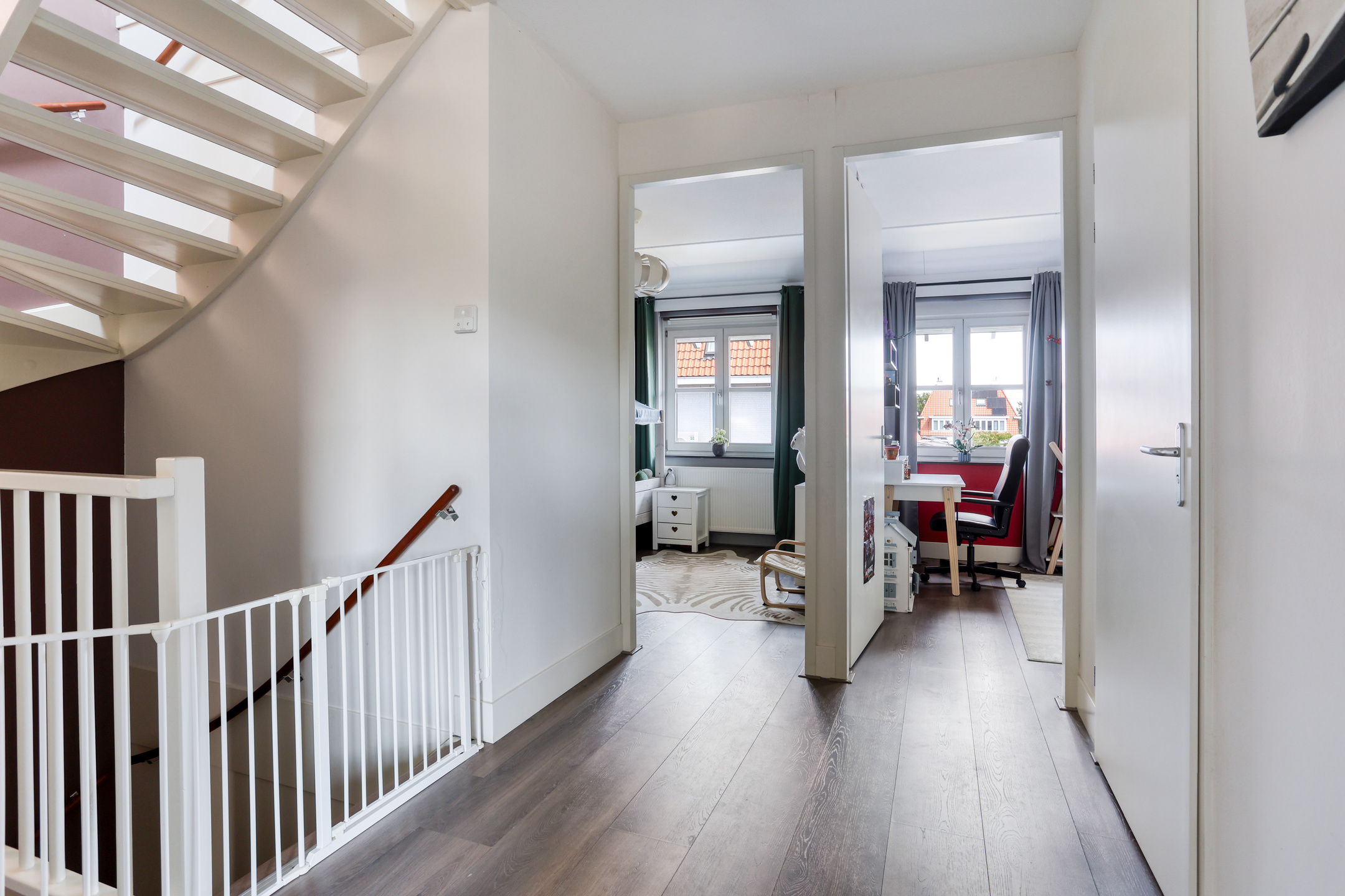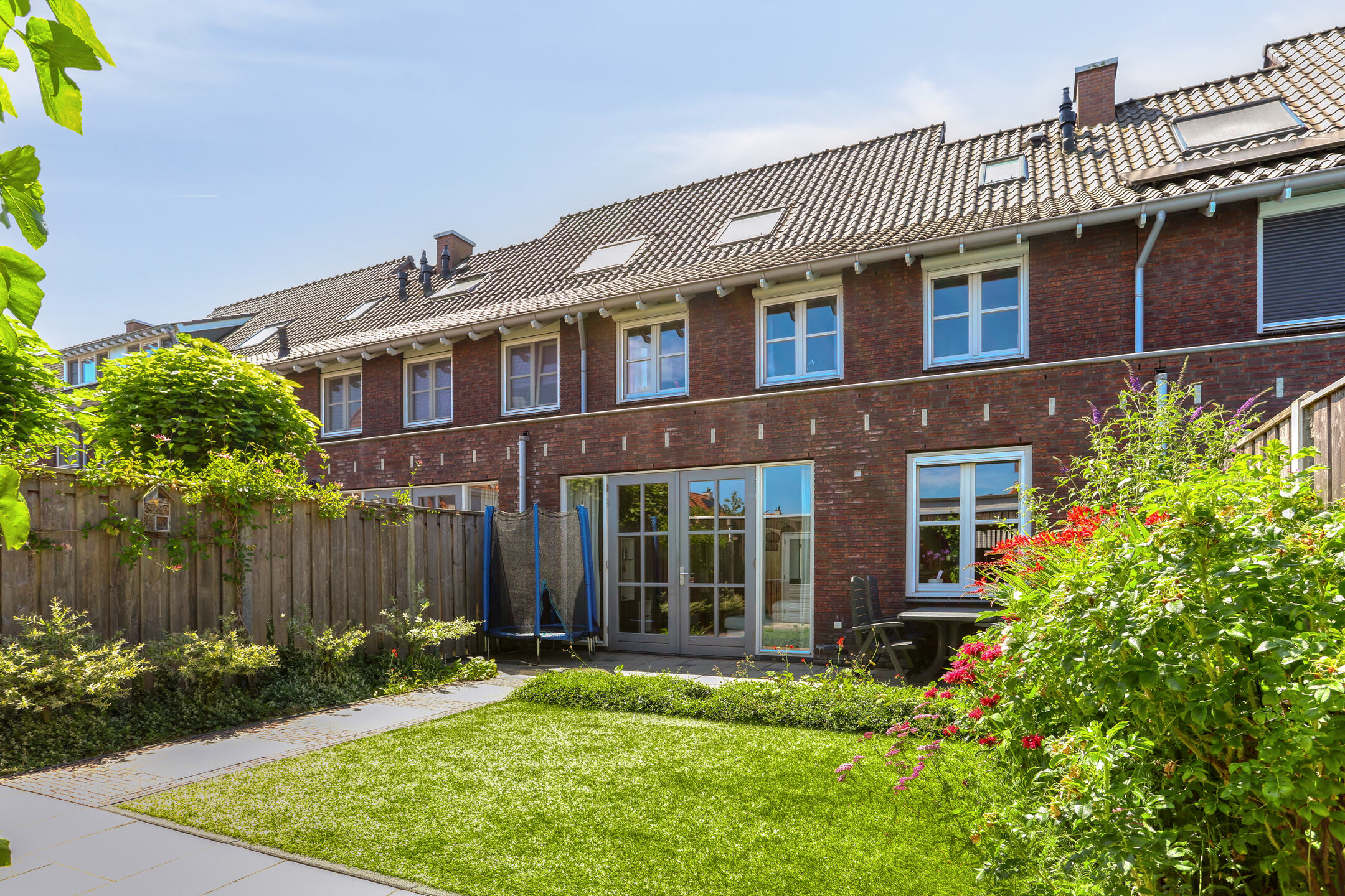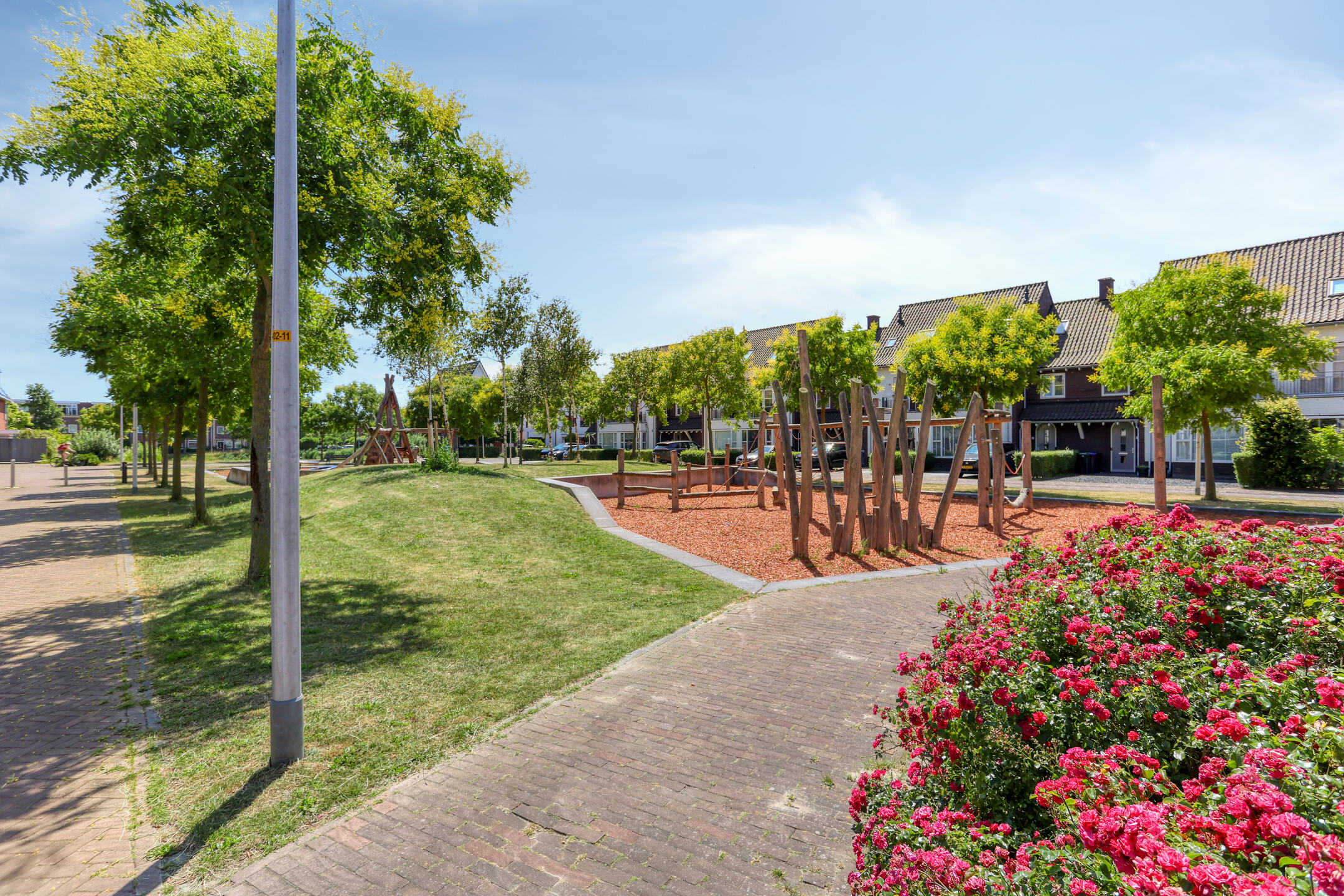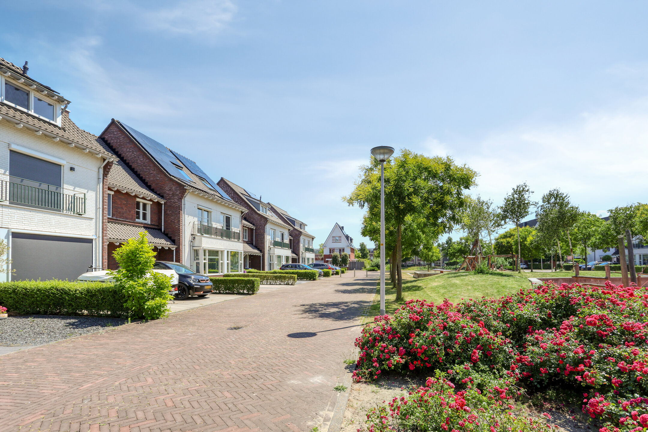 The property features a modern open kitchen and bathroom, five spacious bedrooms, and a private driveway with space for two cars. From the kitchen window, you have a direct view of the large playground in front of the house—ideal for families with young children. The street itself is car-free, contributing to a safe and peaceful living environment.