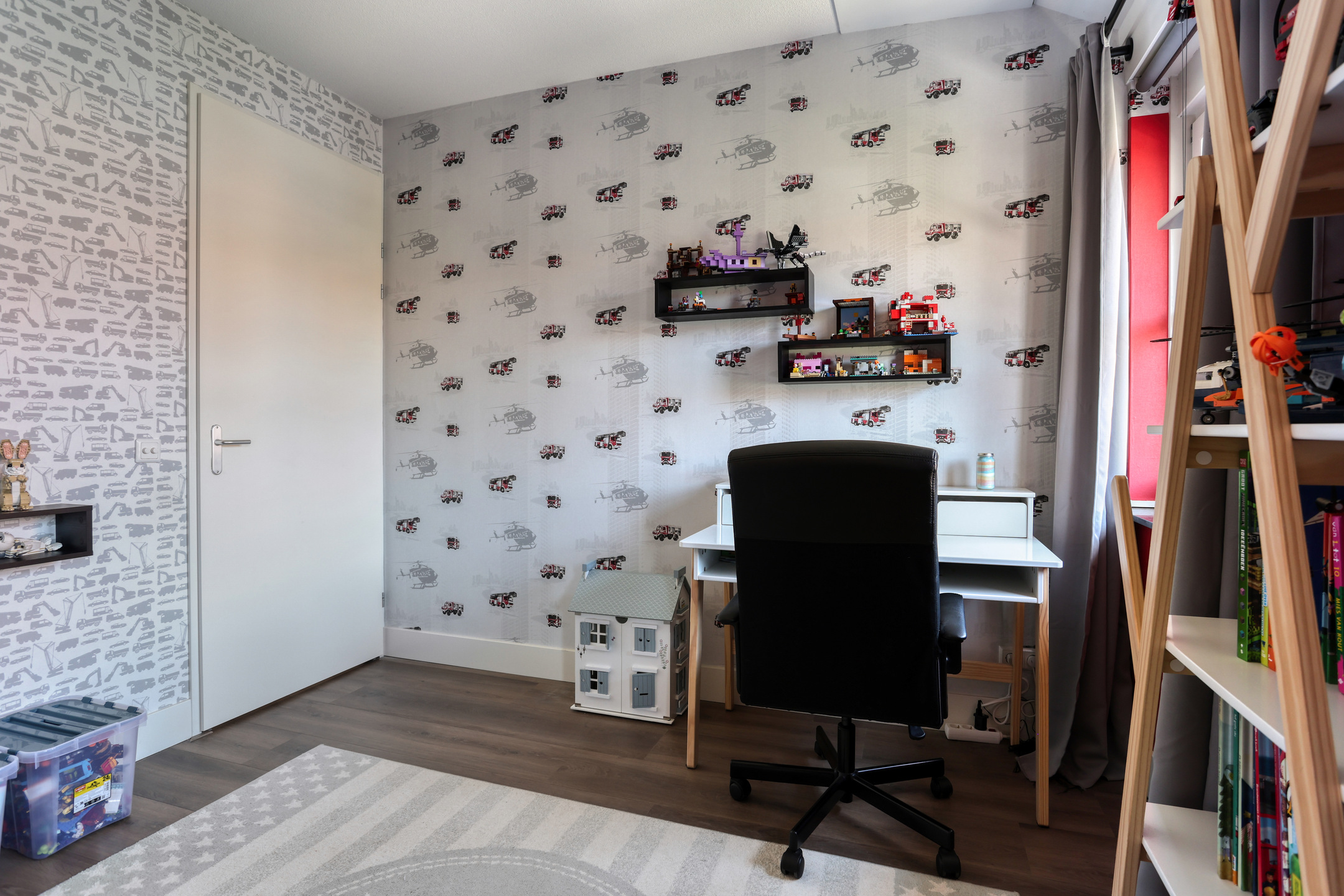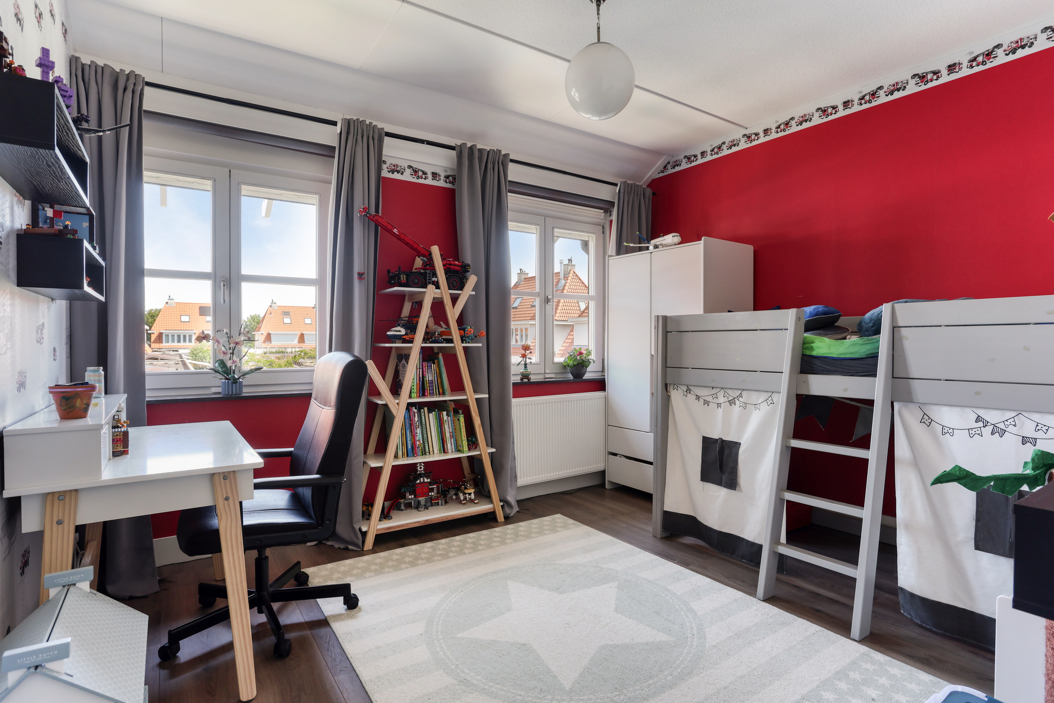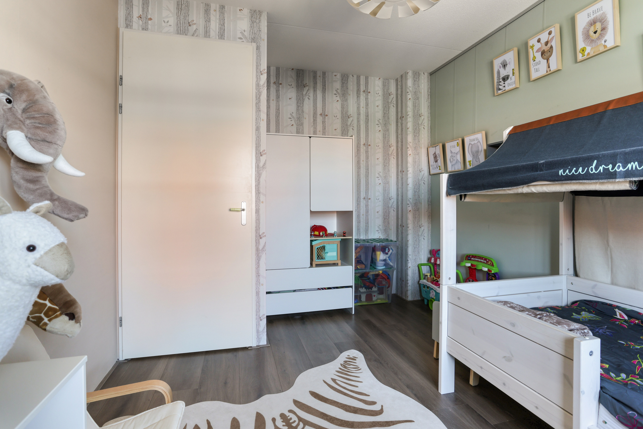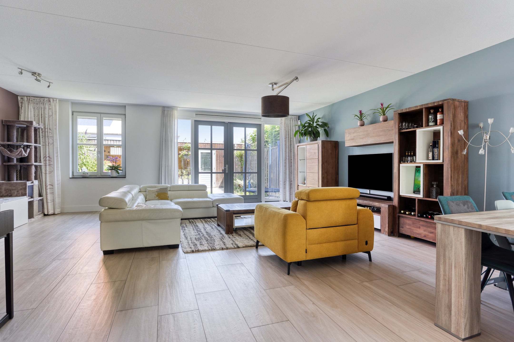 The property features a modern open kitchen and bathroom, five spacious bedrooms, and a private driveway with space for two cars. From the kitchen window, you have a direct view of the large playground in front of the house—ideal for families with young children. The street itself is car-free, contributing to a safe and peaceful living environment.
