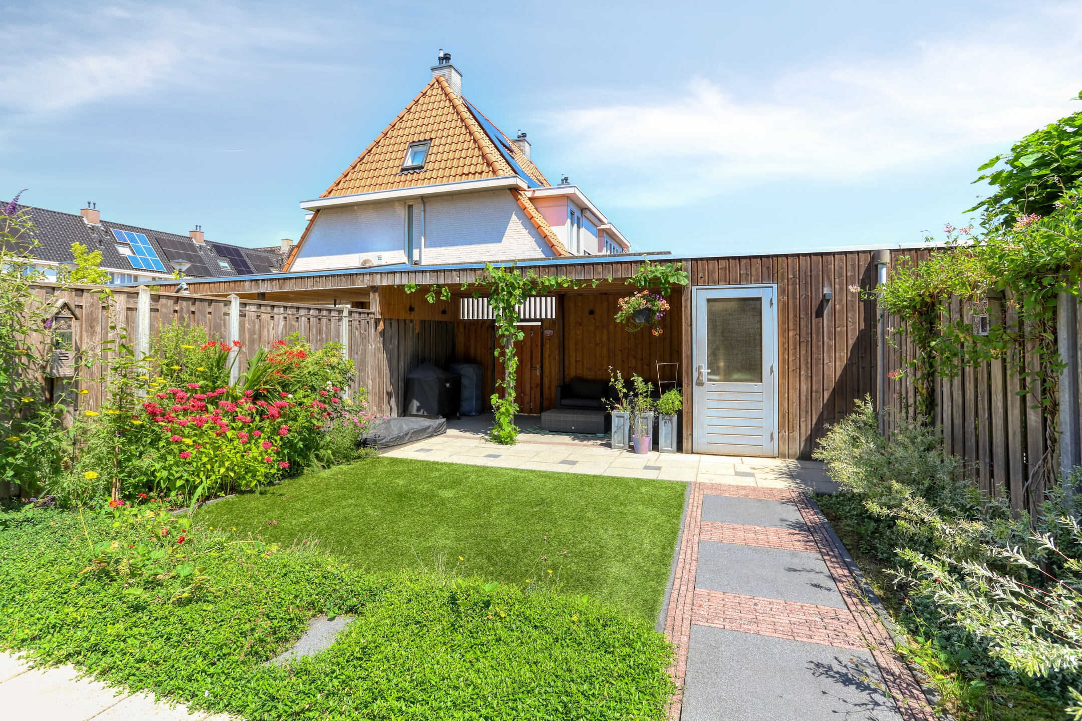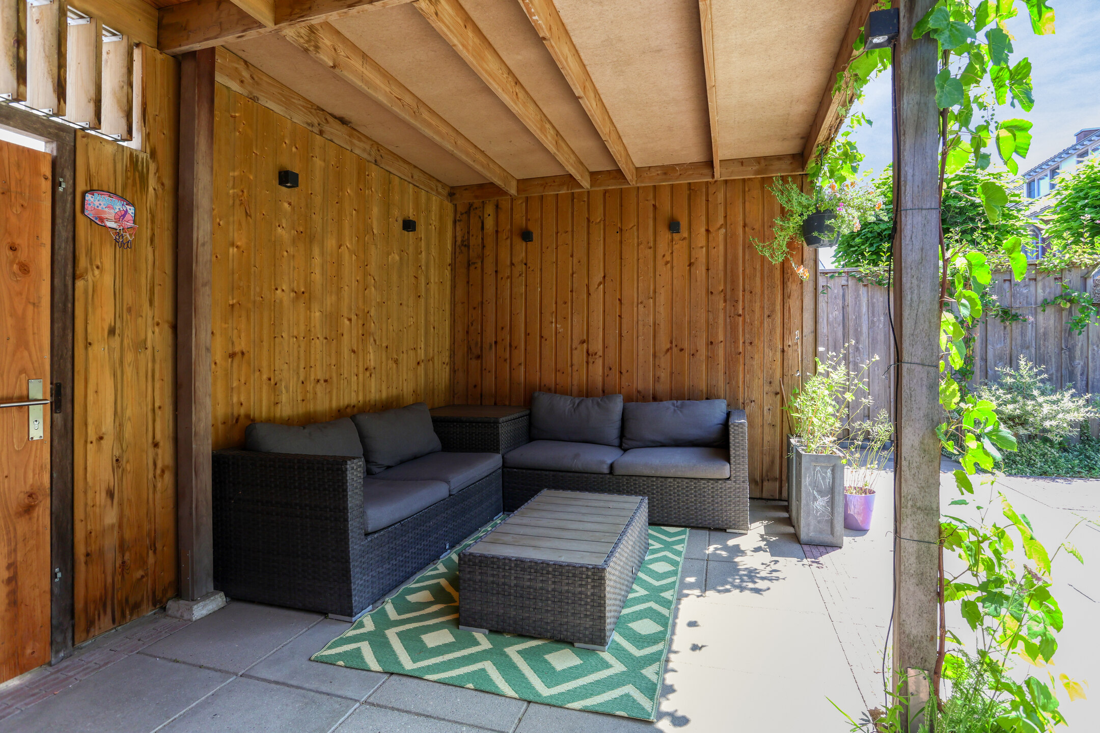 At the back of the garden, there is a spacious covered area with a storage shed—the perfect place to sit outside until late in the evening, even in less favorable weather.