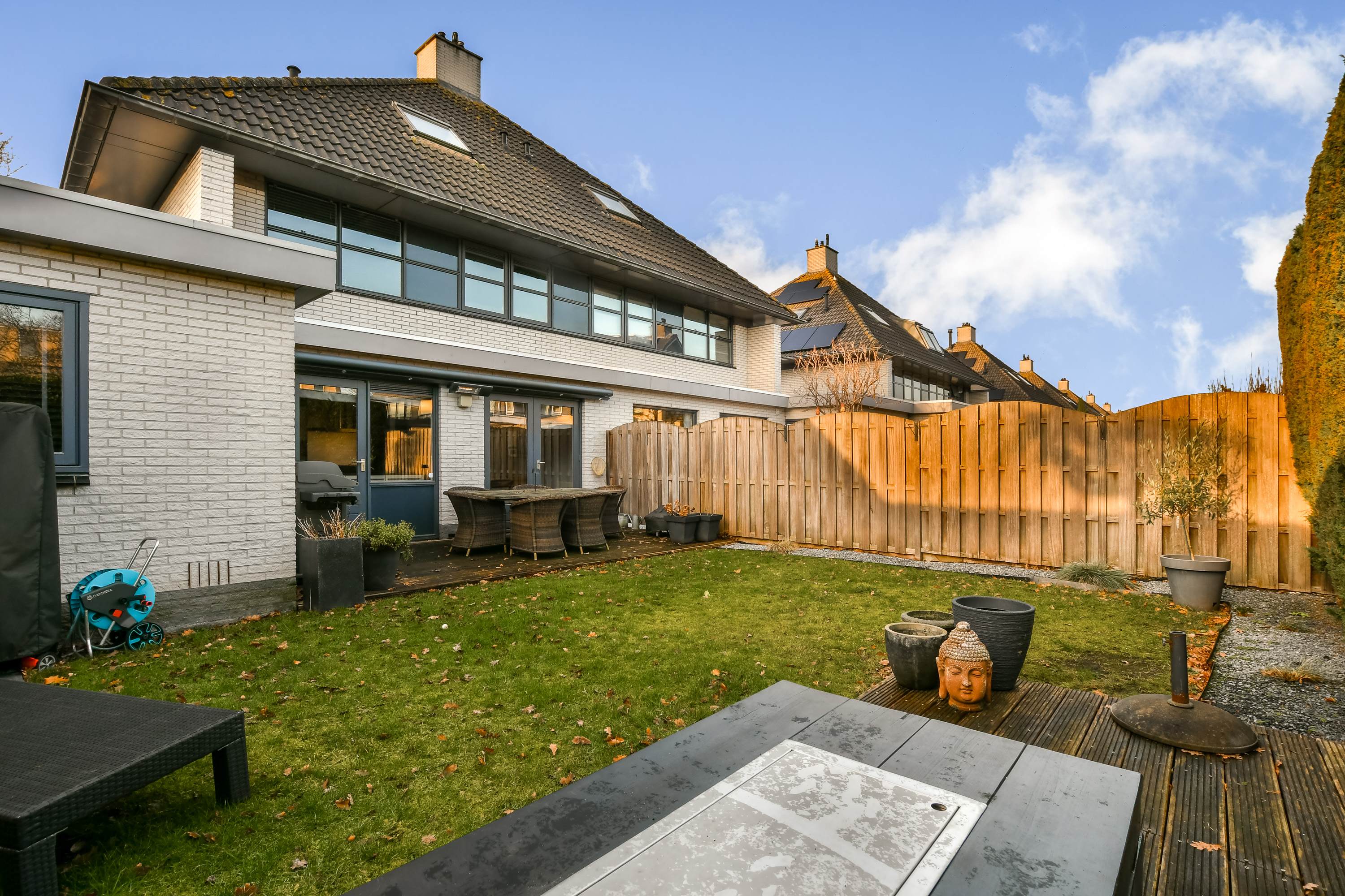 The ground floor has a welcoming entrance, a generous living room with bay window, gas fireplace, and laminate flooring, flowing into a bright open kitchen equipped with built-in appliances. A versatile adjacent room connects to the garden and garage, adaptable as a playroom, lounge, or workspace. In the northeast-facing garden, thoughtfully designed terraces and modern conveniences create a sunlit retreat accessible from both the living room and multifunctional space.