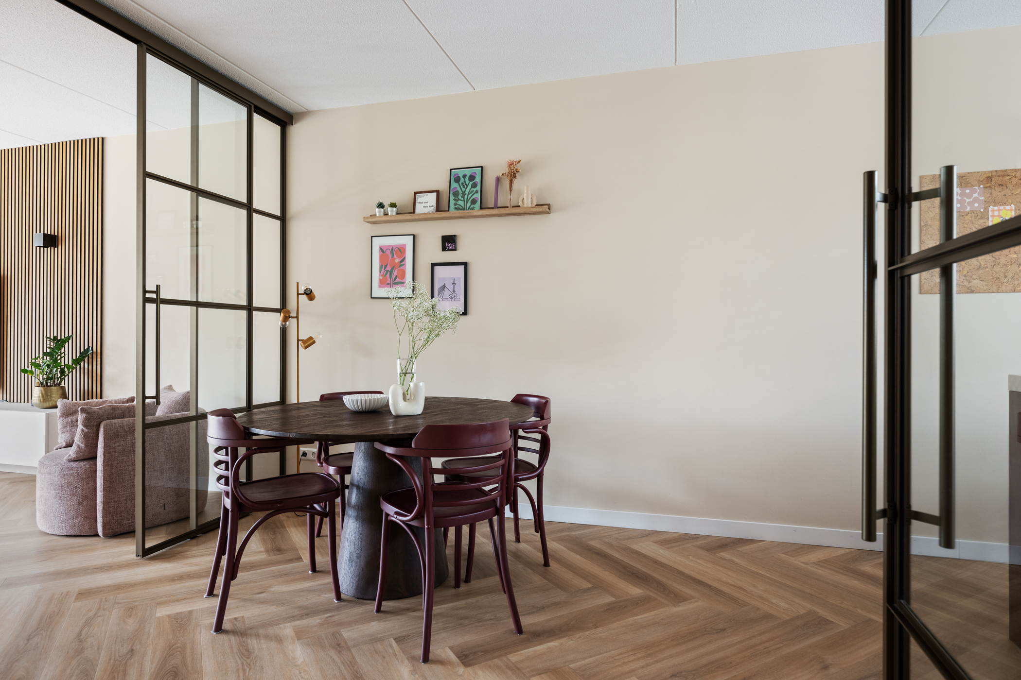 What makes this living space extra special are the elegant copper-colored steel sliding doors, subtly and stylishly separating the kitchen from the living room. They create a playful layout without sacrificing light or a sense of space.