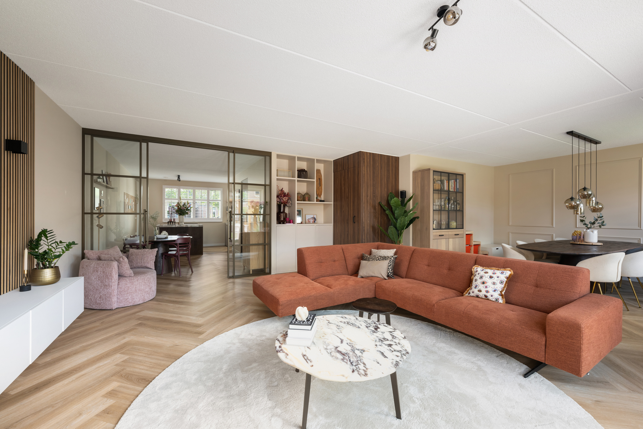 The inviting living room is bright and spacious, with the seating area at the rear. At the front, you’ll find the generous kitchen with a stylish island, finished with a luxurious marble countertop. The kitchen is fully equipped with high-end built-in appliances, including an induction cooktop with integrated extractor, oven, combination microwave, warming drawer, Quooker, fridge-freezer, and dishwasher.