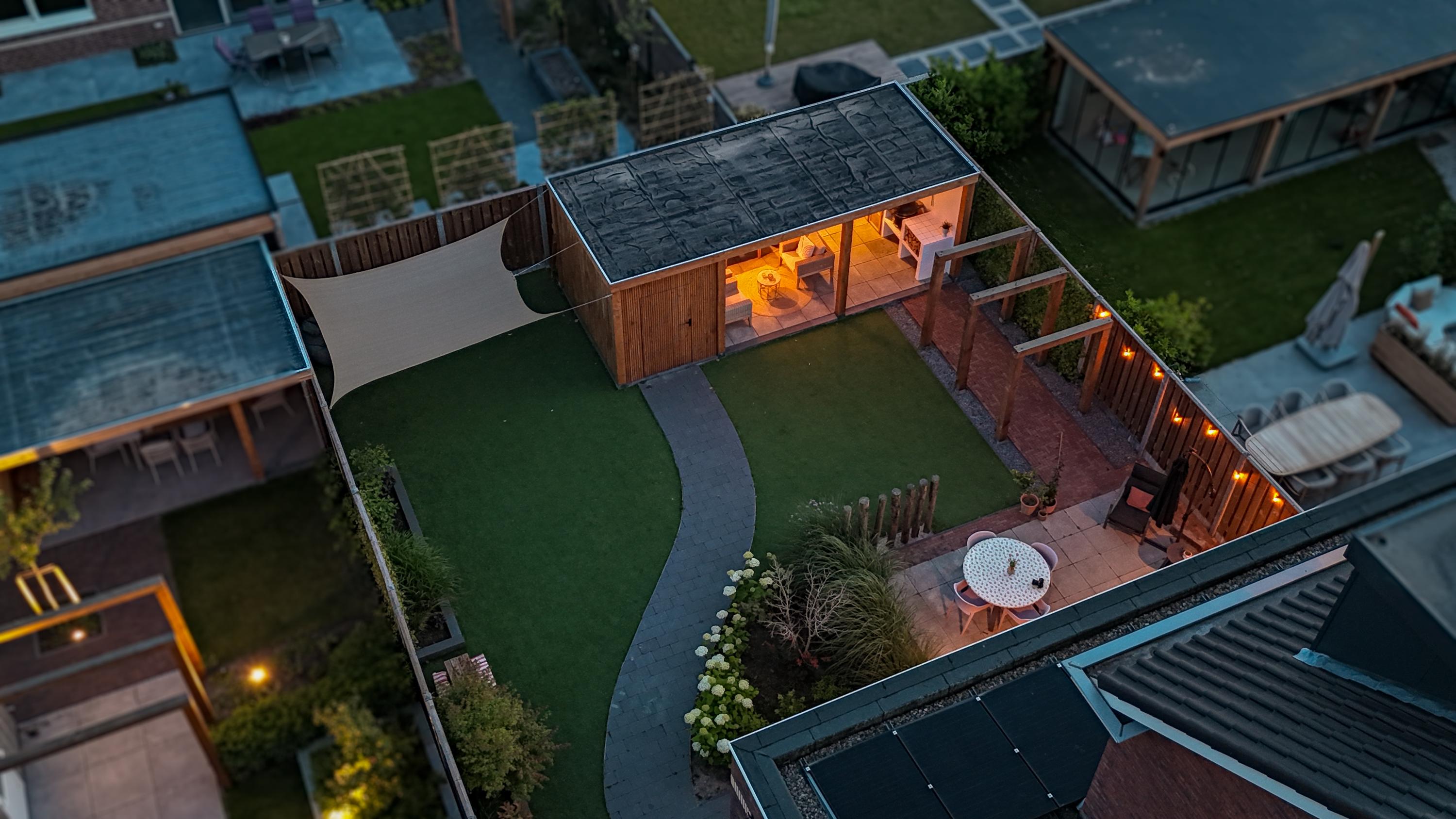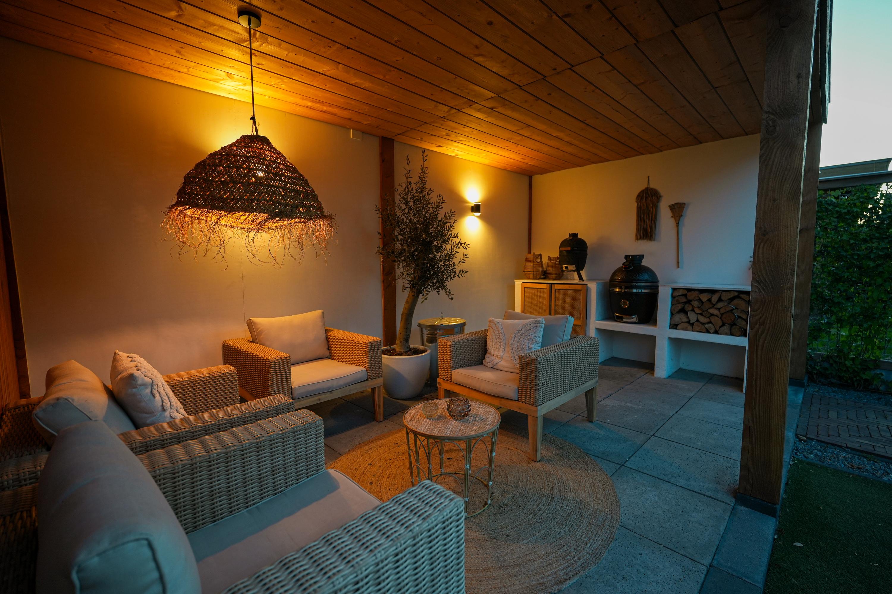 At the back is a charming covered area with storage: the perfect place to spend long evenings outdoors and enjoy the real outdoor life all year round.