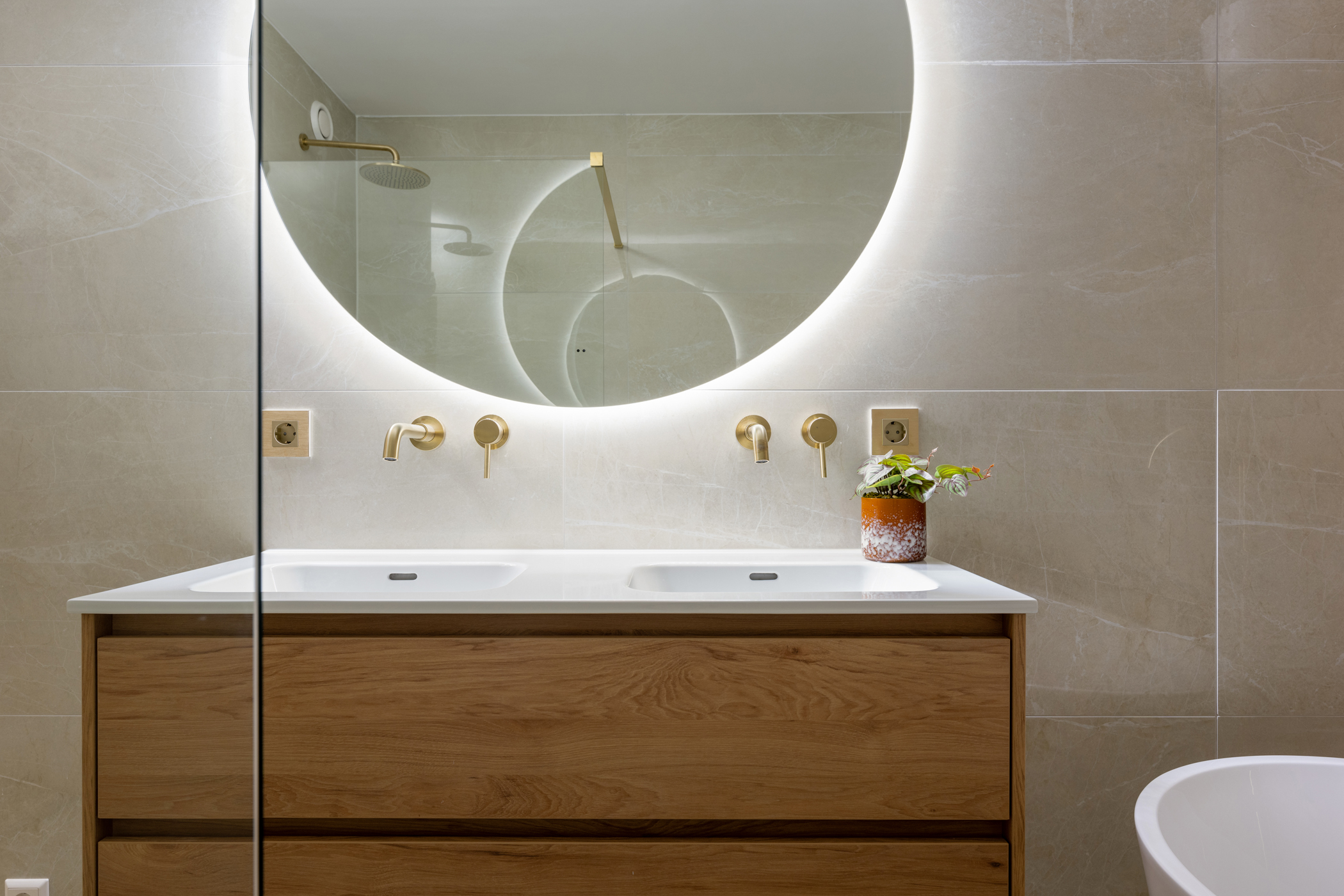 The modern bathroom is a relaxing retreat, featuring a luxurious bathtub, a spacious walk-in shower, and a double sink. Every detail has been carefully finished, allowing you to start or end your day in complete comfort.