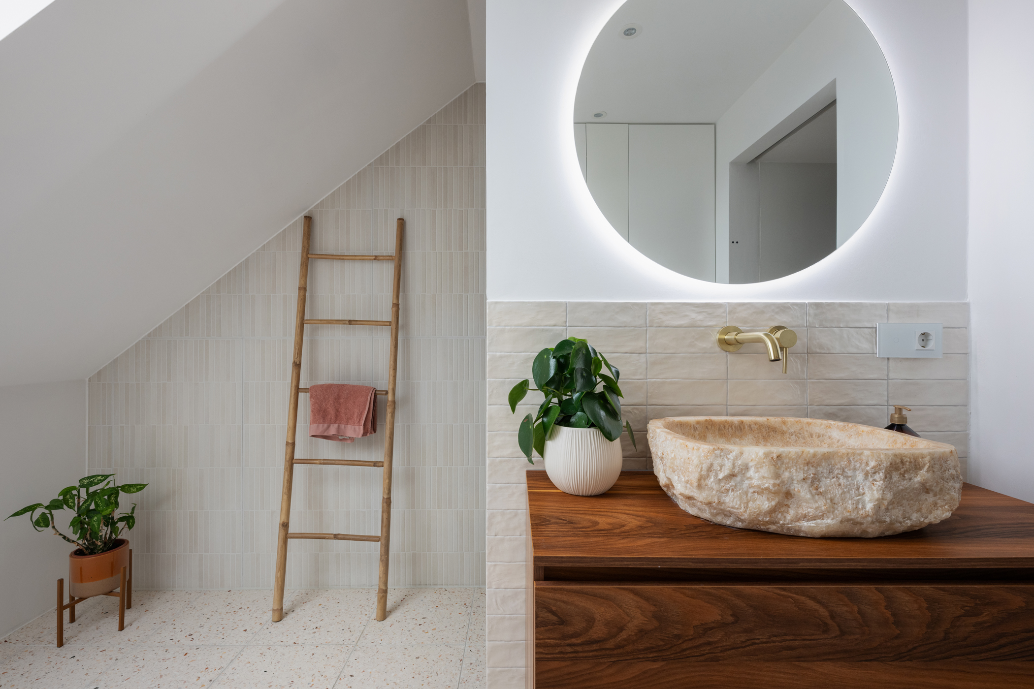 This room is particularly remarkable for the extensive built-in storage that reaches up to the high ceiling. This custom solution provides ample storage space, beautifully integrated yet always within reach. Additionally, extra storage is cleverly incorporated in a raised niche—perfect for suitcases and seasonal items.