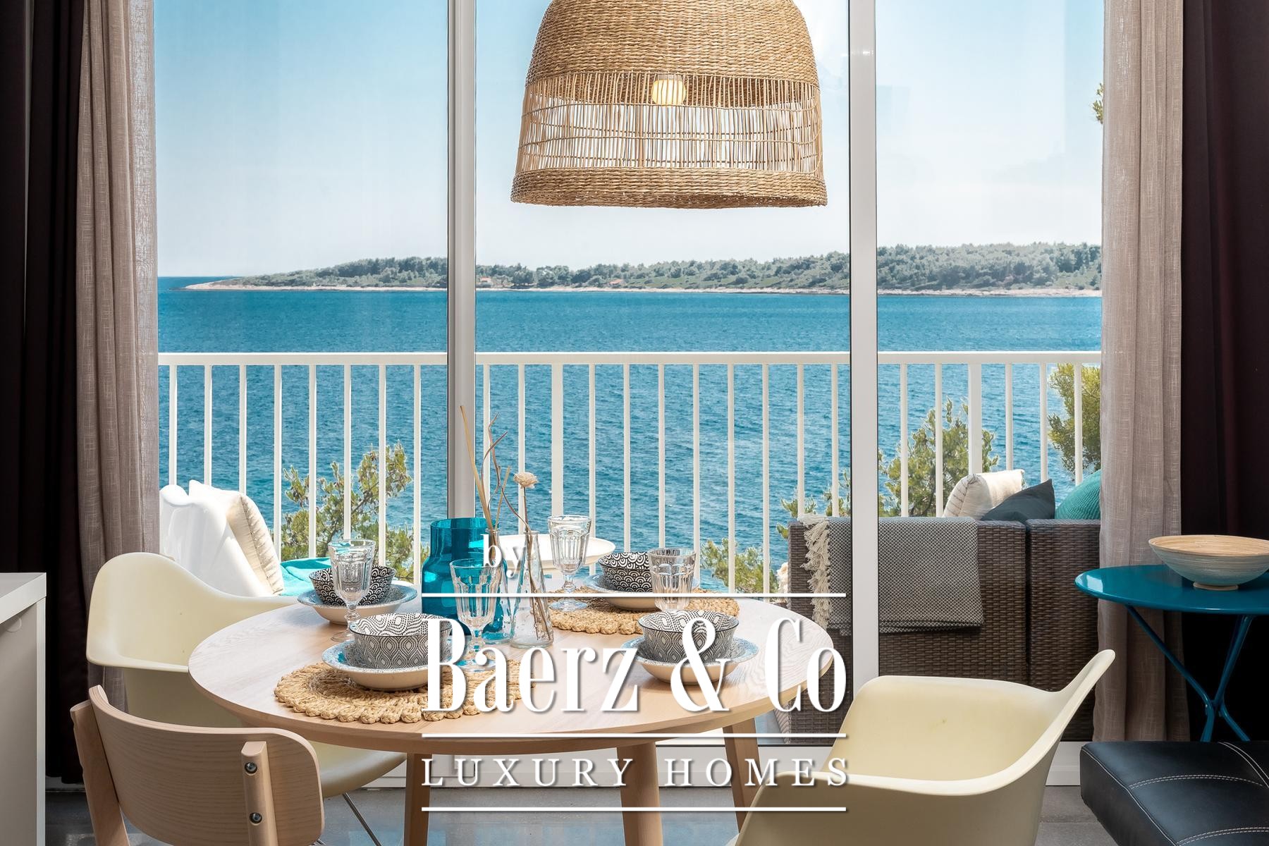 Korčula Island, Vela Luka, villa with a living area of 120 m2 by the sea.The property is located in a small village on the southern coast of the island of Korčula, on a plot of 400 m2, 5 km from the center of Vela Luka. The plot is regular in shape, south-facing and is located on the seashore. An asphalt road leads to the plot and the house is connected to the water and electricity networks.The villa consists of a total of three independent residential units, two of which can function separately because they have separate entrances or as a single unit because they are additionally connected by an internal staircase.On the high ground floor there is the main part of the house, which consists of a combined living area consisting of a kitchen, dining room and living room, which is connected by sliding panoramic doors to a spacious covered terrace with a panoramic view of the sea and nearby islands. The rest of the apartment has two bedrooms, a large bathroom and a storage room.On the first floor there are two more apartments and each apartment has a separate entrance from the parking lot in front of the house. One-bedroom apartment consisting of a central