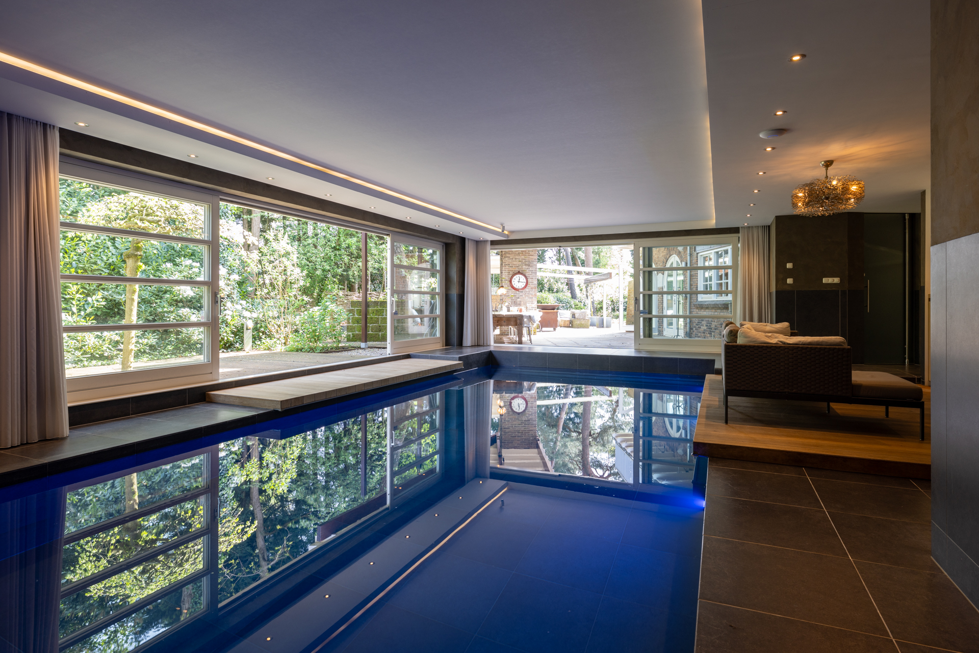 Wellness is at the heart of this villa. A dedicated suite includes a heated indoor pool with jet stream, sauna, rain shower, and relaxation area, opening via sliding doors onto the terrace and gardens. Fitness and office spaces are positioned for flexible, secluded work or recreation.