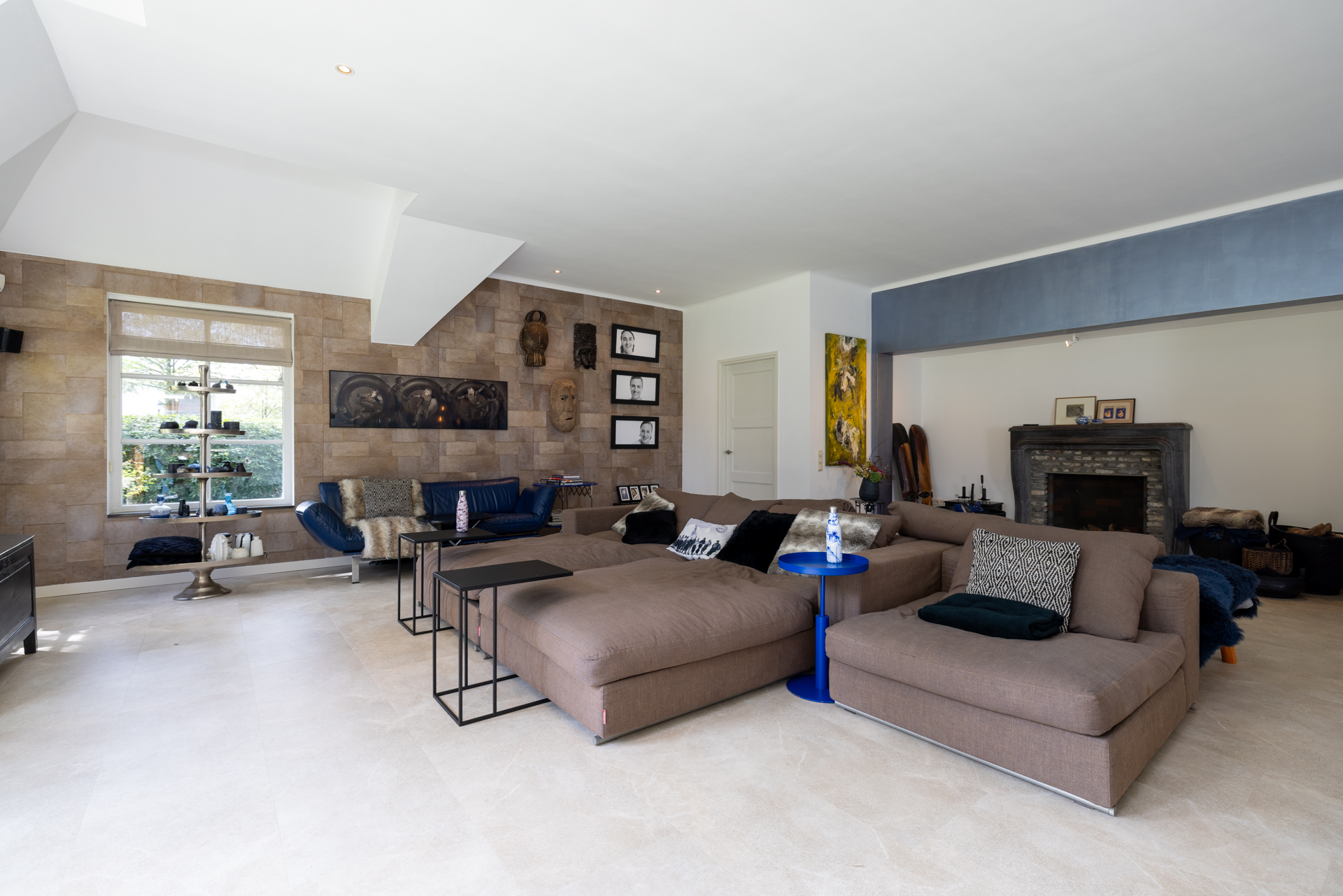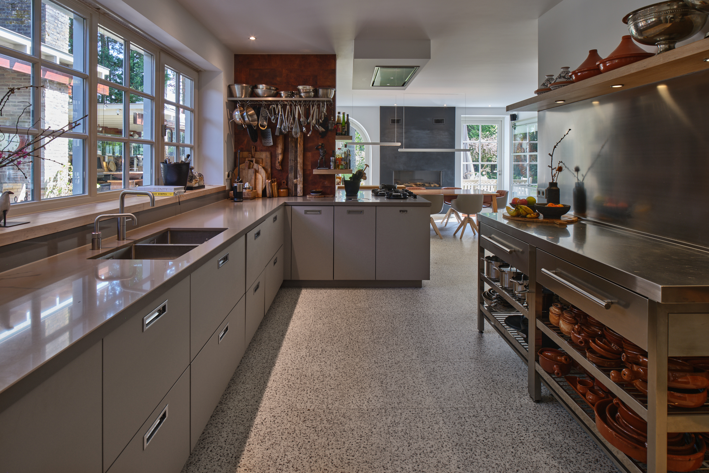 The kitchen has a gas fireplace, spacious dining area and double doors to the garden. This gives a nice connection with the garden and the outdoor kitchen. Here you bring the outside in.