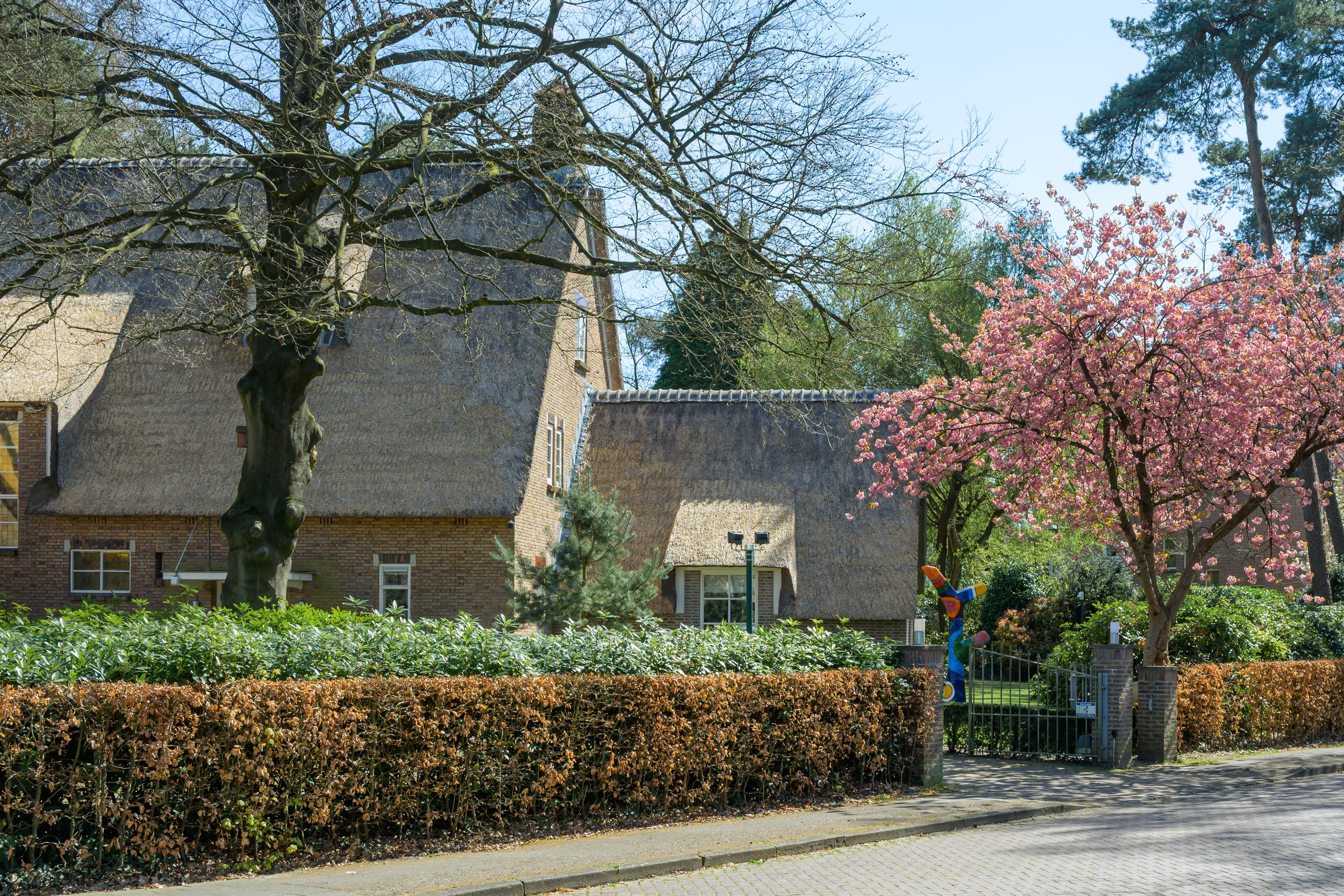 Very unique, perfectly maintained, thatched country house with, among other things, a luxurious wellness area with indoor swimming pool and fantastic outdoor space, situated at a prominent point in the middle of the popular and stately residential area "Ruitersbos" with its beautiful trees and within walking distance of the Mastbos.